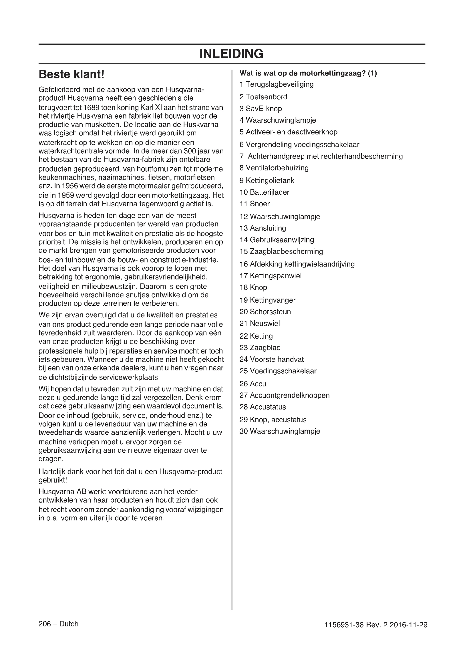 - EG-verklaring van overeenstemming INLEIDING 206 – Dutch 1156931-38 Rev. 2 2016-11-29 Beste klant! Gefeliciteerd met de aankoop van een Husqvarna- product! Husqvarna heeft een geschiedenis die terugvoert tot 1689 toen koning Karl XI aan het strand van het riviertje Huskvarna een fabriek liet bouwen voor de productie van musketten. De locatie aan de Huskvarna was logisch omdat het riviertje werd gebruikt om waterkracht op te wekken en op die manier een waterkrachtcentrale vormde. In de meer dan 300 jaar van het bestaan van de Husqvarna-fabriek zijn ontelbare producten geproduceerd, van houtfornuizen tot moderne keukenmachines, naaimachines, fietsen, motorfietsen enz. In 1956 werd de eerste motormaaier geïntroduceerd, die in 1959 werd gevolgd door een motorkettingzaag. Het is op dit terrein dat Husqvarna tegenwoordig actief is. Husqvarna is heden ten dage een van de meest vooraanstaande producenten ter wereld van producten voor bos en tuin met kwaliteit en prestatie als de hoogste prioriteit. De missie is het ontwikkelen, produceren en op de markt brengen van gemotoriseerde producten voor bos- en tuinbouw en de bouw- en constructie-industrie. Het doel van Husqvarna is ook voorop te lopen met betrekking tot ergonomie, gebruikersvriendelijkheid, veiligheid en milieubewustzijn. Daarom is een grote hoeveelheid verschillende snufjes ontwikkeld om de producten op deze terreinen te verbeteren. We zijn ervan overtuigd dat u de kwaliteit en prestaties van ons product gedurende een lange periode naar volle tevredenheid zult waarderen. Door de aankoop van één van onze producten krijgt u de beschikking over professionele hulp bij reparaties en service mocht er toch iets gebeuren. Wanneer u de machine niet heeft gekocht bij een van onze erkende dealers, kunt u hen vragen naar de dichtstbijzijnde servicewerkplaats. Wij hopen dat u tevreden zult zijn met uw machine en dat deze u gedurende lange tijd zal vergezellen. Denk erom dat deze gebruiksaanwijzing een waardevol document is. Door de inhoud (gebruik, service, onderhoud enz.) te volgen kunt u de levensduur van uw machine én de tweedehands waarde aanzienlijk verlengen. Mocht u uw machine verkopen moet u ervoor zorgen de gebruiksaanwijzing aan de nieuwe eigenaar over te dragen. Hartelijk dank voor het feit dat u een Husqvarna-product gebruikt! Husqvarna AB werkt voortdurend aan het verder ontwikkelen van haar producten en houdt zich dan ook het recht voor om zonder aankondiging vooraf wijzigingen in o.a. vorm en uiterlijk door te voeren. Wat is wat op de motorkettingzaag? (1) 1 Terugslagbeveiliging 2 Toetsenbord 3 SavE-knop 4 Waarschuwinglampje 5 Activeer- en deactiveerknop 6 Vergrendeling voedingsschakelaar 7 Achterhandgreep met rechterhandbescherming 8 Ventilatorbehuizing 9 Kettingolietank 10 Batterijlader 11 Snoer 12 Waarschuwinglampje 13 Aansluiting 14 Gebruiksaanwijzing 15 Zaagbladbescherming 16 Afdekking kettingwielaandrijving 17 Kettingspanwiel 18 Knop 19 Kettingvanger 20 Schorssteun 21 Neuswiel 22 Ketting 23 Zaagblad 24 Voorste handvat 25 Voedingsschakelaar 26 Accu 27 Accuontgrendelknoppen 28 Accustatus 29 Knop, accustatus 30 WaarschuwinglampjeALGEMENE VEILIGHEIDSINSTRUCTIES Dutch – 2071156931-38 Rev.2 2016-11-29 Algemene veiligheidswaarschuwingen voor elektrisch gereedschap Veiligheid op de werkplek p. 231
