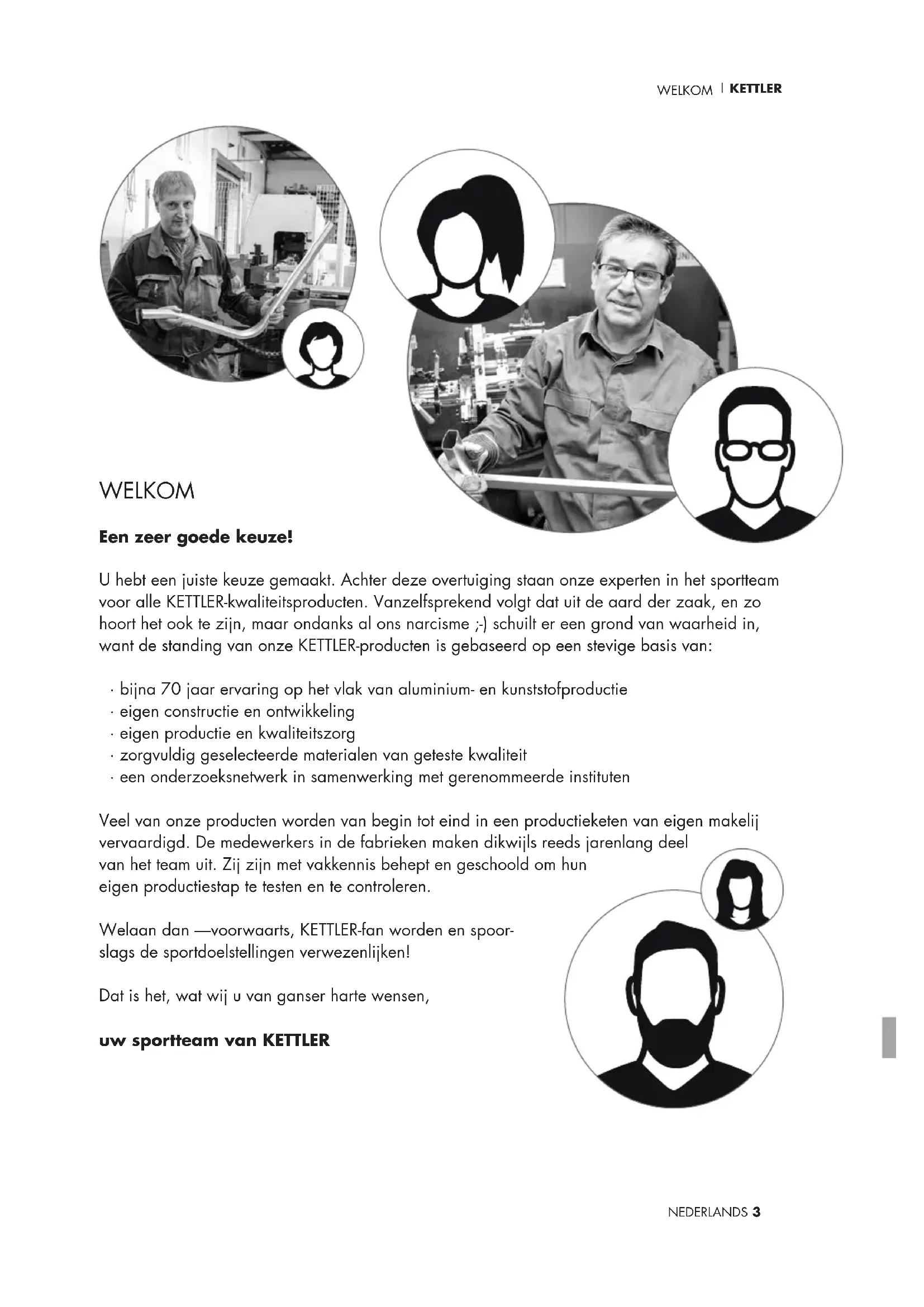 - een onderzoeksnetwerk in samenwerking met gerenommeerde instituten Veel van onze producten worden van begin tot eind in een productieketen van eigen makelij vervaardigd. De medewerkers in de fabrieken maken dikwijls reeds jarenlang deel van het team uit. Zij zijn met vakkennis behept en geschoold om hun eigen productiestap te testen en te controleren. Welaan dan —voorwaarts, KETTLER-fan worden en spoor- slags de sportdoelstellingen verwezenlijken! Dat is het, wat wij u van ganser harte wensen, uw sportteam van KETTLER P1_Kettler_Handbuch_170629_01.indd 3 29.06.17 12:30KETTLER | START 4 NEDERLANDS Start