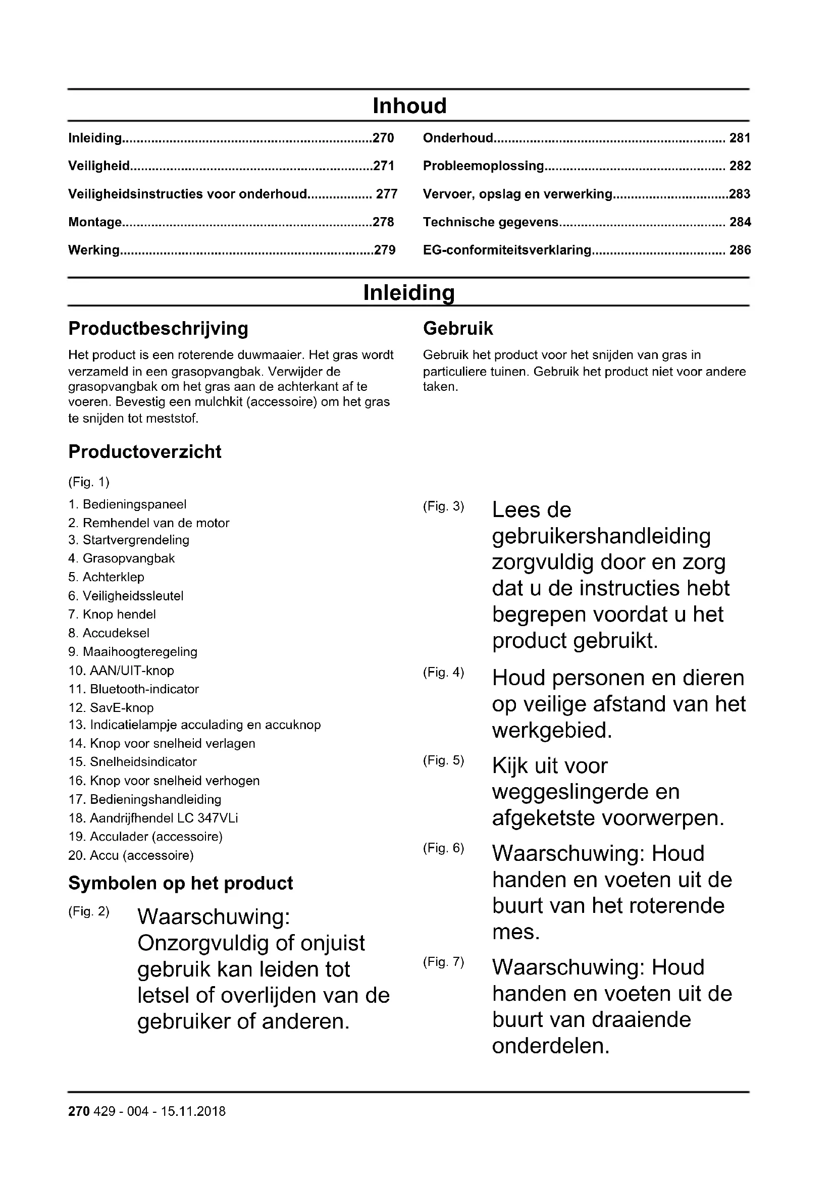 Symbolen op het product (Fig. 2) Waarschuwing: Onzorgvuldig of onjuist gebruik kan leiden tot letsel of overlijden van de gebruiker of anderen. (Fig. 3) Lees de gebruikershandleiding zorgvuldig door en zorg dat u de instructies hebt begrepen voordat u het product gebruikt. (Fig. 4) Houd personen en dieren op veilige afstand van het werkgebied. (Fig. 5) Kijk uit voor weggeslingerde en afgeketste voorwerpen. (Fig. 6) Waarschuwing: Houd handen en voeten uit de buurt van het roterende mes. (Fig. 7) Waarschuwing: Houd handen en voeten uit de buurt van draaiende onderdelen. 270 429 - 004 - 15.11.2018(Fig. 8) Verwijder de veiligheidssleutel voordat u reparatie- of onderhoudswerkzaamhed en gaat uitvoeren. (Fig. 9) IPX1 - Drupdicht (Fig. 10) Stel het product niet bloot aan regen (Fig. 1) Het product voldoet aan de geldende EG- richtlijnen. (Fig. 12) Geluidsemissie naar de omgeving volgens de richtlijn van de Europese Gemeenschap. De emissie van het product is vermeld in het hoofdstuk "Technische gegevens" en op het label. (Fig. 16) Startprocedure: druk op de AAN/UIT-knop, maak de startvergrendeling los, druk de remhendel van de motor omlaag. (Fig. 13) Zet de remhendel van de motor los om te stoppen. (Fig. 14) Langzaam (Fig. 15) Snel Let op: Andere symbolen/stickers op het product hebben betrekking op certificeringseisen voor bepaalde markten. Productaansprakelijkheid Zoals uiteengezet in de wet voor productaansprakelijkheid zijn wij niet aansprakelijk voor schade die door ons product wordt veroorzaakt, indien: