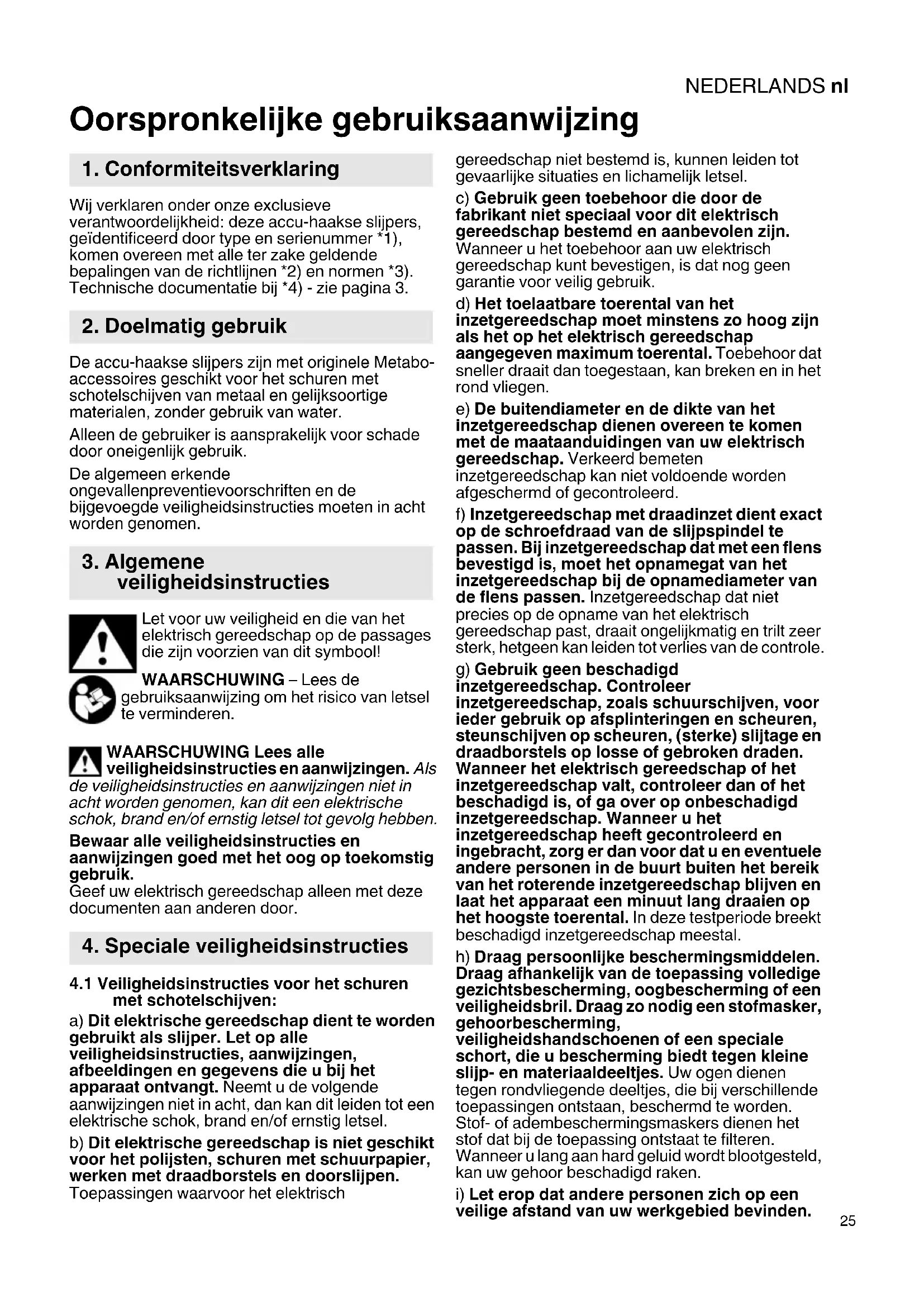 Oorspronkelijke gebruiksaanwijzing Wij verklaren onder onze exclusieve verantwoordelijkheid: deze accu-haakse slijpers, geïdentificeerd door type en serienummer *1), komen overeen met alle ter zake geldende bepalingen van de richtlijnen *2) en normen *3). Technische documentatie bij *4) - zie pagina 3. De accu-haakse slijpers zijn met originele Metabo- accessoires geschikt voor het schuren met schotelschijven van metaal en gelijksoortige materialen, zonder gebruik van water. Alleen de gebruiker is aansprakelijk voor schade door oneigenlijk gebruik. De algemeen erkende ongevallenpreventievoorschriften en de bijgevoegde veiligheidsinstructies moeten in acht worden genomen. Let voor uw veiligheid en die van het elektrisch gereedschap op de passages die zijn voorzien van dit symbool! WAARSCHUWING – Lees de gebruiksaanwijzing om het risico van letsel te verminderen. WAARSCHUWING Lees alle veiligheidsinstructies en aanwijzingen. Als de veiligheidsinstructies en aanwijzingen niet in acht worden genomen, kan dit een elektrische schok, brand en/of ernstig letsel tot gevolg hebben. Bewaar alle veiligheidsinstructies en aanwijzingen goed met het oog op toekomstig gebruik. Geef uw elektrisch gereedschap alleen met deze documenten aan anderen door.