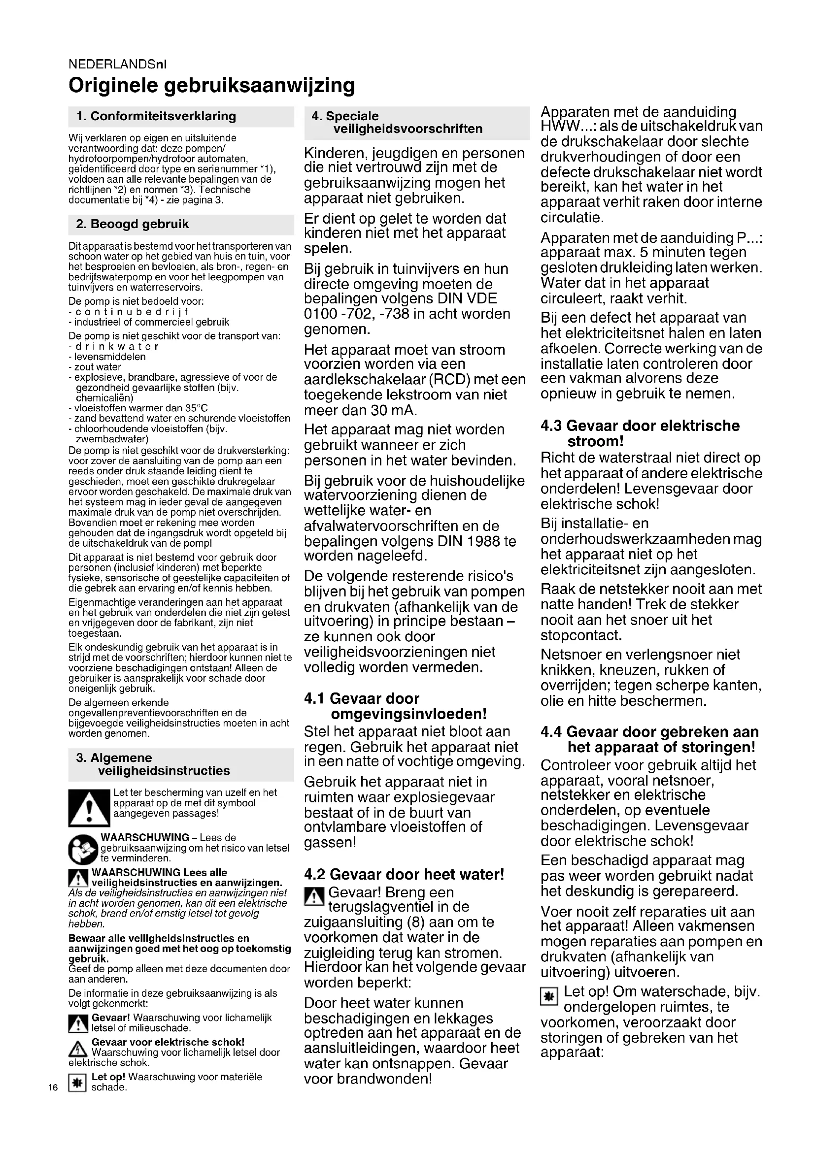 Originele gebruiksaanwijzing Wij verklaren op eigen en uitsluitende verantwoording dat: deze pompen/ hydrofoorpompen/hydrofoor automaten, geïdentificeerd door type en serienummer *1), voldoen aan alle relevante bepalingen van de richtlijnen *2) en normen *3). Technische documentatie bij *4) - zie pagina 3. Dit apparaat is bestemd voor het transporteren van schoon water op het gebied van huis en tuin, voor het besproeien en bevloeien, als bron-, regen- en bedrijfswaterpomp en voor het leegpompen van tuinvijvers en waterreservoirs. De pomp is niet bedoeld voor: -continubedrijf - industrieel of commercieel gebruik De pomp is niet geschikt voor de transport van: -drinkwater - levensmiddelen - zout water - explosieve, brandbare, agressieve of voor de gezondheid gevaarlijke stoffen (bijv. chemicaliën) - vloeistoffen warmer dan 35°C - zand bevattend water en schurende vloeistoffen - chloorhoudende vloeistoffen (bijv. zwembadwater) De pomp is niet geschikt voor de drukversterking: voor zover de aansluiting van de pomp aan een reeds onder druk staande leiding dient te geschieden, moet een geschikte drukregelaar ervoor worden geschakeld. De maximale druk van het systeem mag in ieder geval de aangegeven maximale druk van de pomp niet overschrijden. Bovendien moet er rekening mee worden gehouden dat de ingangsdruk wordt opgeteld bij de uitschakeldruk van de pomp! Dit apparaat is niet bestemd voor gebruik door personen (inclusief kinderen) met beperkte fysieke, sensorische of geestelijke capaciteiten of die gebrek aan ervaring en/of kennis hebben. Eigenmachtige veranderingen aan het apparaat en het gebruik van onderdelen die niet zijn getest en vrijgegeven door de fabrikant, zijn niet toegestaan. Elk ondeskundig gebruik van het apparaat is in strijd met de voorschriften; hierdoor kunnen niet te voorziene beschadigingen ontstaan! Alleen de gebruiker is aansprakelijk voor schade door oneigenlijk gebruik. De algemeen erkende ongevallenpreventievoorschriften en de bijgevoegde veiligheidsinstructies moeten in acht worden genomen. Let ter bescherming van uzelf en het apparaat op de met dit symbool aangegeven passages! WAARSCHUWING – Lees de gebruiksaanwijzing om het risico van letsel te verminderen. WAARSCHUWING Lees alle veiligheidsinstructies en aanwijzingen. Als de veiligheidsinstructies en aanwijzingen niet in acht worden genomen, kan dit een elektrische schok, brand en/of ernstig letsel tot gevolg hebben. Bewaar alle veiligheidsinstructies en aanwijzingen goed met het oog op toekomstig gebruik. Geef de pomp alleen met deze documenten door aan anderen. De informatie in deze gebruiksaanwijzing is als volgt gekenmerkt: Gevaar! Waarschuwing voor lichamelijk letsel of milieuschade. Gevaar voor elektrische schok! Waarschuwing voor lichamelijk letsel door elektrische schok. Let op! Waarschuwing voor materiële schade. Kinderen, jeugdigen en personen die niet vertrouwd zijn met de gebruiksaanwijzing mogen het apparaat niet gebruiken. Er dient op gelet te worden dat kinderen niet met het apparaat spelen. Bij gebruik in tuinvijvers en hun directe omgeving moeten de bepalingen volgens DIN VDE 0100 -702, -738 in acht worden genomen. Het apparaat moet van stroom voorzien worden via een aardlekschakelaar (RCD) met een toegekende lekstroom van niet meer dan 30 mA. Het apparaat mag niet worden gebruikt wanneer er zich personen in het water bevinden. Bij gebruik voor de huishoudelijke watervoorziening dienen de wettelijke water- en afvalwatervoorschriften en de bepalingen volgens DIN 1988 te worden nageleefd. De volgende resterende risico's blijven bij het gebruik van pompen en drukvaten (afhankelijk van de uitvoering) in principe bestaan – ze kunnen ook door veiligheidsvoorzieningen niet volledig worden vermeden.