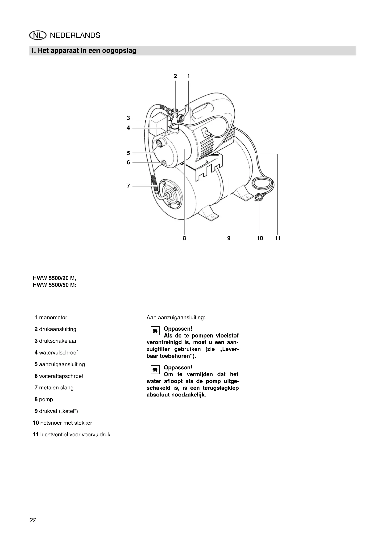 HWW 5500/20 M, HWW 5500/50 M: 1 manometer 2 drukaansluiting 3 drukschakelaar 4 watervulschroef 5 aanzuigaansluiting 6 wateraftapschroef 7 metalen slang 8 pomp 9 drukvat („ketel“) 10 netsnoer met stekker 11 luchtventiel voor voorvuldruk Aan aanzuigaansluiting: