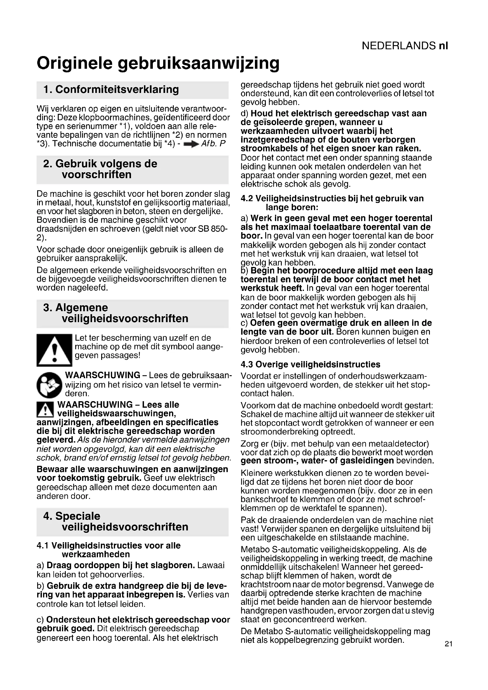 b. P De machine is geschikt voor het boren zonder slag in metaal, hout, kunststof en gelijksoortig materiaal, en voor het slagboren in beton, steen en dergelijke. Bovendien is de machine geschikt voor draadsnijden en schroeven (geldt niet voor SB 850- 2). Voor schade door oneigenlijk gebruik is alleen de gebruiker aansprakelijk. De algemeen erkende veiligheidsvoorschriften en de bijgevoegde veiligheidsvoorschriften dienen te worden nageleefd. Let ter bescherming van uzelf en de machine op de met dit symbool aange- geven passages! WAARSCHUWING – Lees de gebruiksaan- wijzing om het risico van letsel te vermin- deren. WAARSCHUWING – Lees alle veiligheidswaarschuwingen, aanwijzingen, afbeeldingen en specificaties die bij dit elektrische gereedschap worden geleverd. Als de hieronder vermelde aanwijzingen niet worden opgevolgd, kan dit een elektrische schok, brand en/of ernstig letsel tot gevolg hebben. Bewaar alle waarschuwingen en aanwijzingen voor toekomstig gebruik. Geef uw elektrisch gereedschap alleen met deze documenten aan anderen door.