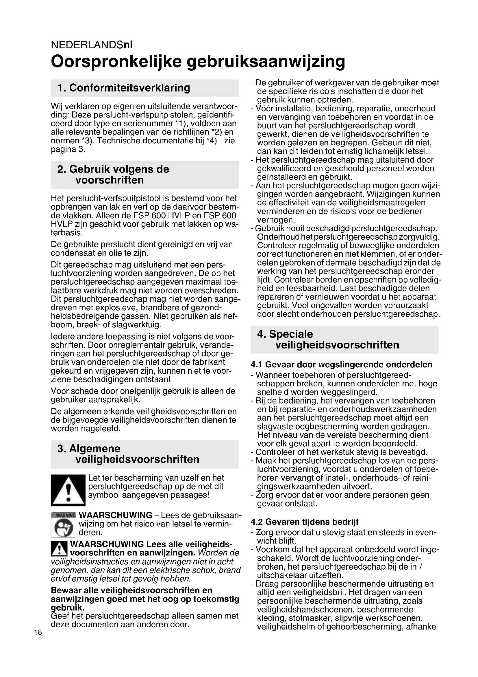 Oorspronkelijke gebruiksaanwijzing Wij verklaren op eigen en uitsluitende verantwoor- ding: Deze perslucht-verfspuitpistolen, geïdentifi- ceerd door type en serienummer *1), voldoen aan alle relevante bepalingen van de richtlijnen *2) en normen *3). Technische documentatie bij *4) - zie pagina 3. Het perslucht-verfspuitpistool is bestemd voor het opbrengen van lak en verf op de daarvoor bestem- de vlakken. Alleen de FSP 600 HVLP en FSP 600 HVLP zijn geschikt voor gebruik met lakken op wa- terbasis. De gebruikte perslucht dient gereinigd en vrij van condensaat en olie te zijn. Dit gereedschap mag uitsluitend met een pers- luchtvoorziening worden aangedreven. De op het persluchtgereedschap aangegeven maximaal toe- laatbare werkdruk mag niet worden overschreden. Dit persluchtgereedschap mag niet worden aange- dreven met explosieve, brandbare of gezond- heidsbedreigende gassen. Niet gebruiken als hef- boom, breek- of slagwerktuig. Iedere andere toepassing is niet volgens de voor- schriften. Door onreglementair gebruik, verande- ringen aan het persluchtgereedschap of door ge- bruik van onderdelen die niet door de fabrikant gekeurd en vrijgegeven zijn, kunnen niet te voor- ziene beschadigingen ontstaan! Voor schade door oneigenlijk gebruik is alleen de gebruiker aansprakelijk. De algemeen erkende veiligheidsvoorschriften en de bijgevoegde veiligheidsvoorschriften dienen te worden nageleefd. Let ter bescherming van uzelf en het persluchtgereedschap op de met dit symbool aangegeven passages! WAARSCHUWING – Lees de gebruiksaan- wijzing om het risico van letsel te vermin- deren. WAARSCHUWING Lees alle veiligheids- voorschriften en aanwijzingen. Worden de veiligheidsinstructies en aanwijzingen niet in acht genomen, dan kan dit een elektrische schok, brand en/of ernstig letsel tot gevolg hebben. Bewaar alle veiligheidsvoorschriften en aanwijzingen goed met het oog op toekomstig gebruik. Geef het persluchtgereedschap alleen samen met deze documenten aan anderen door. - De gebruiker of werkgever van de gebruiker moet de specifieke risico's inschatten die door het gebruik kunnen optreden. - Vóór installatie, bediening, reparatie, onderhoud en vervanging van toebehoren en voordat in de buurt van het persluchtgereedschap wordt gewerkt, dienen de veiligheidsvoorschriften te worden gelezen en begrepen. Gebeurt dit niet, dan kan dit leiden tot ernstig lichamelijk letsel. - Het persluchtgereedschap mag uitsluitend door gekwalificeerd en geschoold personeel worden geïnstalleerd en gebruikt. - Aan het persluchtgereedschap mogen geen wijzi- gingen worden aangebracht. Wijzigingen kunnen de effectiviteit van de veiligheidsmaatregelen verminderen en de risico's voor de bediener verhogen. - Gebruik nooit beschadigd persluchtgereedschap. Onderhoud het persluchtgereedschap zorgvuldig. Controleer regelmatig of beweeglijke onderdelen correct functioneren en niet klemmen, of er onder- delen gebroken of dermate beschadigd zijn dat de werking van het persluchtgereedschap eronder lijdt. Controleer borden en opschriften op volledig- heid en leesbaarheid. Laat beschadigde delen repareren of vernieuwen voordat u het apparaat gebruikt. Veel ongevallen worden veroorzaakt door slecht onderhouden persluchtgereedschap.