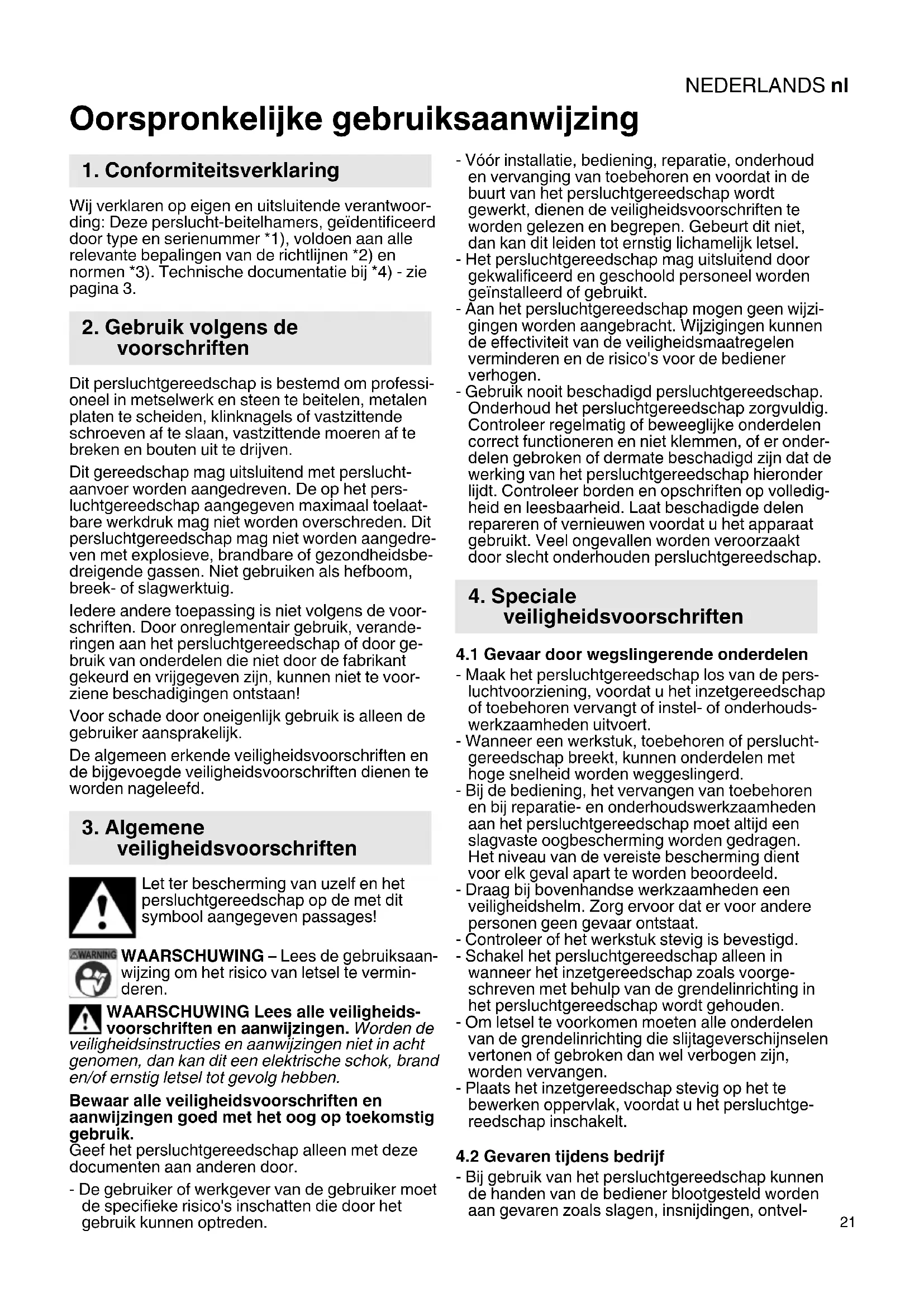 Oorspronkelijke gebruiksaanwijzing Wij verklaren op eigen en uitsluitende verantwoor- ding: Deze perslucht-beitelhamers, geïdentificeerd door type en serienummer *1), voldoen aan alle relevante bepalingen van de richtlijnen *2) en normen *3). Technische documentatie bij *4) - zie pagina 3. Dit persluchtgereedschap is bestemd om professi- oneel in metselwerk en steen te beitelen, metalen platen te scheiden, klinknagels of vastzittende schroeven af te slaan, vastzittende moeren af te breken en bouten uit te drijven. Dit gereedschap mag uitsluitend met perslucht- aanvoer worden aangedreven. De op het pers- luchtgereedschap aangegeven maximaal toelaat- bare werkdruk mag niet worden overschreden. Dit persluchtgereedschap mag niet worden aangedre- ven met explosieve, brandbare of gezondheidsbe- dreigende gassen. Niet gebruiken als hefboom, breek- of slagwerktuig. Iedere andere toepassing is niet volgens de voor- schriften. Door onreglementair gebruik, verande- ringen aan het persluchtgereedschap of door ge- bruik van onderdelen die niet door de fabrikant gekeurd en vrijgegeven zijn, kunnen niet te voor- ziene beschadigingen ontstaan! Voor schade door oneigenlijk gebruik is alleen de gebruiker aansprakelijk. De algemeen erkende veiligheidsvoorschriften en de bijgevoegde veiligheidsvoorschriften dienen te worden nageleefd. Let ter bescherming van uzelf en het persluchtgereedschap op de met dit symbool aangegeven passages! WAARSCHUWING – Lees de gebruiksaan- wijzing om het risico van letsel te vermin- deren. WAARSCHUWING Lees alle veiligheids- voorschriften en aanwijzingen. Worden de veiligheidsinstructies en aanwijzingen niet in acht genomen, dan kan dit een elektrische schok, brand en/of ernstig letsel tot gevolg hebben. Bewaar alle veiligheidsvoorschriften en aanwijzingen goed met het oog op toekomstig gebruik. Geef het persluchtgereedschap alleen met deze documenten aan anderen door. - De gebruiker of werkgever van de gebruiker moet de specifieke risico's inschatten die door het gebruik kunnen optreden. - Vóór installatie, bediening, reparatie, onderhoud en vervanging van toebehoren en voordat in de buurt van het persluchtgereedschap wordt gewerkt, dienen de veiligheidsvoorschriften te worden gelezen en begrepen. Gebeurt dit niet, dan kan dit leiden tot ernstig lichamelijk letsel. - Het persluchtgereedschap mag uitsluitend door gekwalificeerd en geschoold personeel worden geïnstalleerd of gebruikt. - Aan het persluchtgereedschap mogen geen wijzi- gingen worden aangebracht. Wijzigingen kunnen de effectiviteit van de veiligheidsmaatregelen verminderen en de risico's voor de bediener verhogen. - Gebruik nooit beschadigd persluchtgereedschap. Onderhoud het persluchtgereedschap zorgvuldig. Controleer regelmatig of beweeglijke onderdelen correct functioneren en niet klemmen, of er onder- delen gebroken of dermate beschadigd zijn dat de werking van het persluchtgereedschap hieronder lijdt. Controleer borden en opschriften op volledig- heid en leesbaarheid. Laat beschadigde delen repareren of vernieuwen voordat u het apparaat gebruikt. Veel ongevallen worden veroorzaakt door slecht onderhouden persluchtgereedschap.