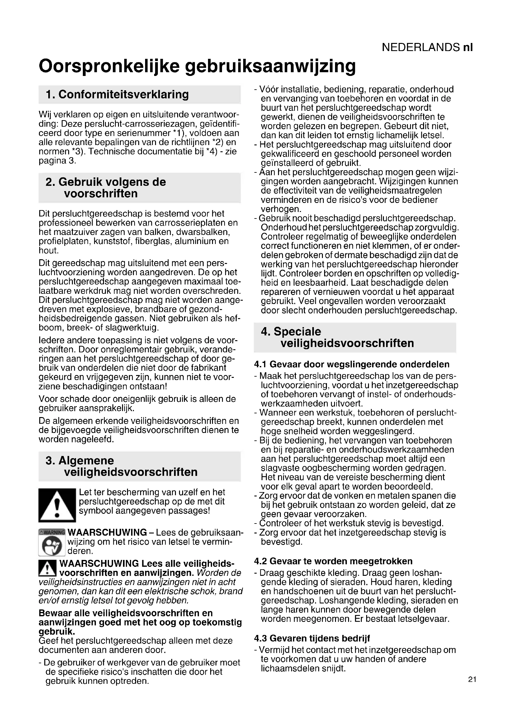Oorspronkelijke gebruiksaanwijzing Wij verklaren op eigen en uitsluitende verantwoor- ding: Deze perslucht-carrosseriezagen, geïdentifi- ceerd door type en serienummer *1), voldoen aan alle relevante bepalingen van de richtlijnen *2) en normen *3). Technische documentatie bij *4) - zie pagina 3. Dit persluchtgereedschap is bestemd voor het professioneel bewerken van carrosserieplaten en het maatzuiver zagen van balken, dwarsbalken, profielplaten, kunststof, fiberglas, aluminium en hout. Dit gereedschap mag uitsluitend met een pers- luchtvoorziening worden aangedreven. De op het persluchtgereedschap aangegeven maximaal toe- laatbare werkdruk mag niet worden overschreden. Dit persluchtgereedschap mag niet worden aange- dreven met explosieve, brandbare of gezond- heidsbedreigende gassen. Niet gebruiken als hef- boom, breek- of slagwerktuig. Iedere andere toepassing is niet volgens de voor- schriften. Door onreglementair gebruik, verande- ringen aan het persluchtgereedschap of door ge- bruik van onderdelen die niet door de fabrikant gekeurd en vrijgegeven zijn, kunnen niet te voor- ziene beschadigingen ontstaan! Voor schade door oneigenlijk gebruik is alleen de gebruiker aansprakelijk. De algemeen erkende veiligheidsvoorschriften en de bijgevoegde veiligheidsvoorschriften dienen te worden nageleefd. Let ter bescherming van uzelf en het persluchtgereedschap op de met dit symbool aangegeven passages! WAARSCHUWING – Lees de gebruiksaan- wijzing om het risico van letsel te vermin- deren. WAARSCHUWING Lees alle veiligheids- voorschriften en aanwijzingen. Worden de veiligheidsinstructies en aanwijzingen niet in acht genomen, dan kan dit een elektrische schok, brand en/of ernstig letsel tot gevolg hebben. Bewaar alle veiligheidsvoorschriften en aanwijzingen goed met het oog op toekomstig gebruik. Geef het persluchtgereedschap alleen met deze documenten aan anderen door. - De gebruiker of werkgever van de gebruiker moet de specifieke risico's inschatten die door het gebruik kunnen optreden. - Vóór installatie, bediening, reparatie, onderhoud en vervanging van toebehoren en voordat in de buurt van het persluchtgereedschap wordt gewerkt, dienen de veiligheidsvoorschriften te worden gelezen en begrepen. Gebeurt dit niet, dan kan dit leiden tot ernstig lichamelijk letsel. - Het persluchtgereedschap mag uitsluitend door gekwalificeerd en geschoold personeel worden geïnstalleerd of gebruikt. - Aan het persluchtgereedschap mogen geen wijzi- gingen worden aangebracht. Wijzigingen kunnen de effectiviteit van de veiligheidsmaatregelen verminderen en de risico's voor de bediener verhogen. - Gebruik nooit beschadigd persluchtgereedschap. Onderhoud het persluchtgereedschap zorgvuldig. Controleer regelmatig of beweeglijke onderdelen correct functioneren en niet klemmen, of er onder- delen gebroken of dermate beschadigd zijn dat de werking van het persluchtgereedschap hieronder lijdt. Controleer borden en opschriften op volledig- heid en leesbaarheid. Laat beschadigde delen repareren of vernieuwen voordat u het apparaat gebruikt. Veel ongevallen worden veroorzaakt door slecht onderhouden persluchtgereedschap.