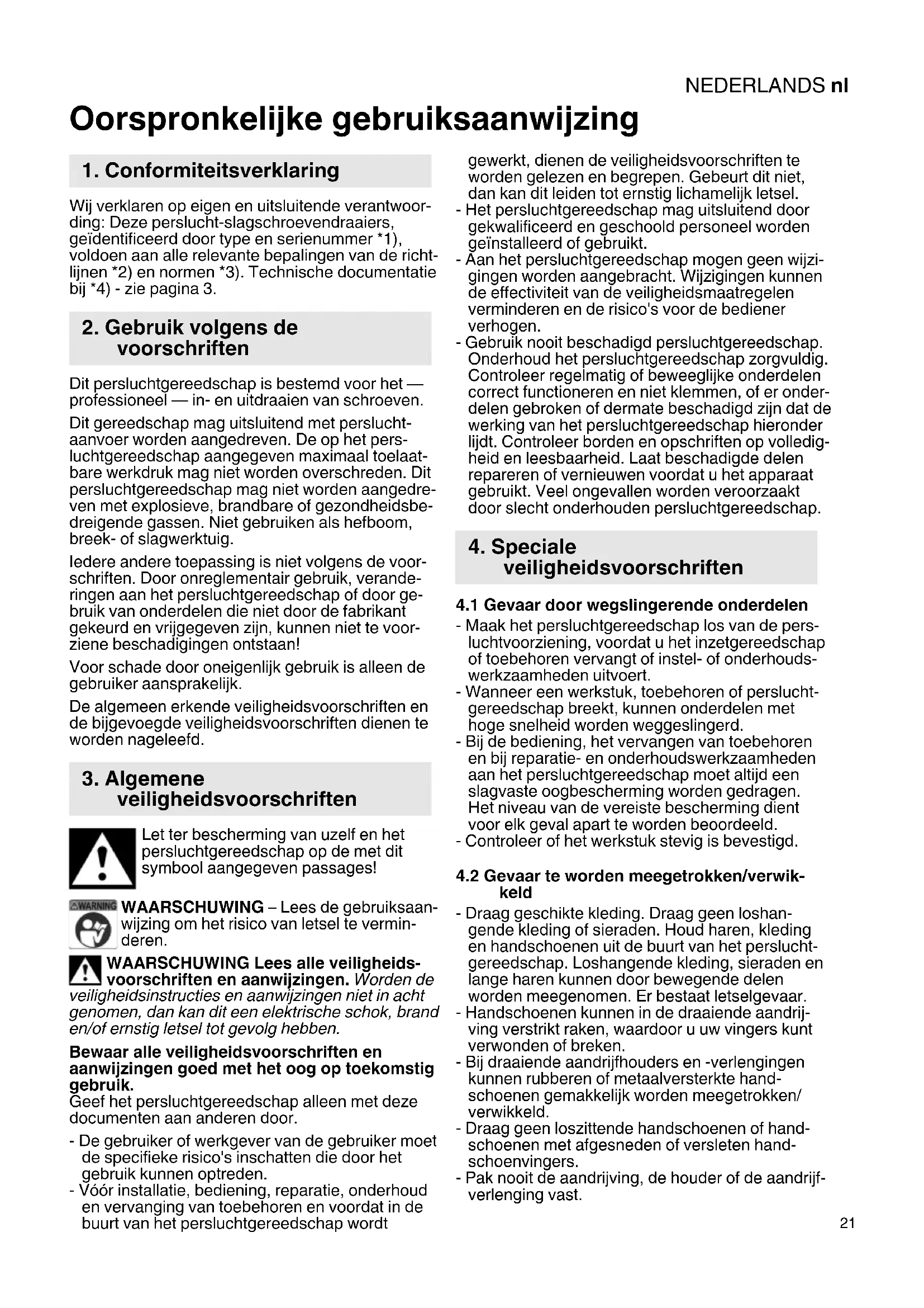 Oorspronkelijke gebruiksaanwijzing Wij verklaren op eigen en uitsluitende verantwoor- ding: Deze perslucht-slagschroevendraaiers, geïdentificeerd door type en serienummer *1), voldoen aan alle relevante bepalingen van de richt- lijnen *2) en normen *3). Technische documentatie bij *4) - zie pagina 3. Dit persluchtgereedschap is bestemd voor het — professioneel — in- en uitdraaien van schroeven. Dit gereedschap mag uitsluitend met perslucht- aanvoer worden aangedreven. De op het pers- luchtgereedschap aangegeven maximaal toelaat- bare werkdruk mag niet worden overschreden. Dit persluchtgereedschap mag niet worden aangedre- ven met explosieve, brandbare of gezondheidsbe- dreigende gassen. Niet gebruiken als hefboom, breek- of slagwerktuig. Iedere andere toepassing is niet volgens de voor- schriften. Door onreglementair gebruik, verande- ringen aan het persluchtgereedschap of door ge- bruik van onderdelen die niet door de fabrikant gekeurd en vrijgegeven zijn, kunnen niet te voor- ziene beschadigingen ontstaan! Voor schade door oneigenlijk gebruik is alleen de gebruiker aansprakelijk. De algemeen erkende veiligheidsvoorschriften en de bijgevoegde veiligheidsvoorschriften dienen te worden nageleefd. Let ter bescherming van uzelf en het persluchtgereedschap op de met dit symbool aangegeven passages! WAARSCHUWING – Lees de gebruiksaan- wijzing om het risico van letsel te vermin- deren. WAARSCHUWING Lees alle veiligheids- voorschriften en aanwijzingen. Worden de veiligheidsinstructies en aanwijzingen niet in acht genomen, dan kan dit een elektrische schok, brand en/of ernstig letsel tot gevolg hebben. Bewaar alle veiligheidsvoorschriften en aanwijzingen goed met het oog op toekomstig gebruik. Geef het persluchtgereedschap alleen met deze documenten aan anderen door. - De gebruiker of werkgever van de gebruiker moet de specifieke risico's inschatten die door het gebruik kunnen optreden. - Vóór installatie, bediening, reparatie, onderhoud en vervanging van toebehoren en voordat in de buurt van het persluchtgereedschap wordt gewerkt, dienen de veiligheidsvoorschriften te worden gelezen en begrepen. Gebeurt dit niet, dan kan dit leiden tot ernstig lichamelijk letsel. - Het persluchtgereedschap mag uitsluitend door gekwalificeerd en geschoold personeel worden geïnstalleerd of gebruikt. - Aan het persluchtgereedschap mogen geen wijzi- gingen worden aangebracht. Wijzigingen kunnen de effectiviteit van de veiligheidsmaatregelen verminderen en de risico's voor de bediener verhogen. - Gebruik nooit beschadigd persluchtgereedschap. Onderhoud het persluchtgereedschap zorgvuldig. Controleer regelmatig of beweeglijke onderdelen correct functioneren en niet klemmen, of er onder- delen gebroken of dermate beschadigd zijn dat de werking van het persluchtgereedschap hieronder lijdt. Controleer borden en opschriften op volledig- heid en leesbaarheid. Laat beschadigde delen repareren of vernieuwen voordat u het apparaat gebruikt. Veel ongevallen worden veroorzaakt door slecht onderhouden persluchtgereedschap.