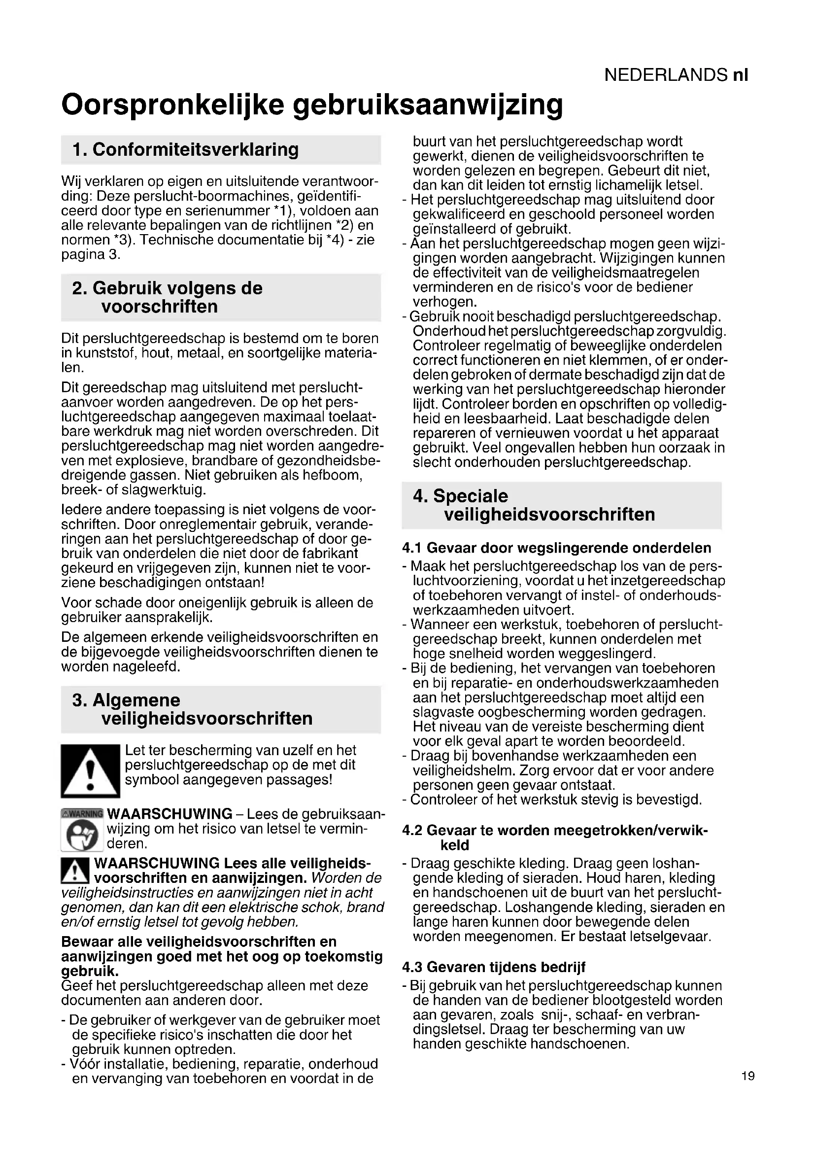 Oorspronkelijke gebruiksaanwijzing Wij verklaren op eigen en uitsluitende verantwoor- ding: Deze perslucht-boormachines, geïdentifi- ceerd door type en serienummer *1), voldoen aan alle relevante bepalingen van de richtlijnen *2) en normen *3). Technische documentatie bij *4) - zie pagina 3. Dit persluchtgereedschap is bestemd om te boren in kunststof, hout, metaal, en soortgelijke materia- len. Dit gereedschap mag uitsluitend met perslucht- aanvoer worden aangedreven. De op het pers- luchtgereedschap aangegeven maximaal toelaat- bare werkdruk mag niet worden overschreden. Dit persluchtgereedschap mag niet worden aangedre- ven met explosieve, brandbare of gezondheidsbe- dreigende gassen. Niet gebruiken als hefboom, breek- of slagwerktuig. Iedere andere toepassing is niet volgens de voor- schriften. Door onreglementair gebruik, verande- ringen aan het persluchtgereedschap of door ge- bruik van onderdelen die niet door de fabrikant gekeurd en vrijgegeven zijn, kunnen niet te voor- ziene beschadigingen ontstaan! Voor schade door oneigenlijk gebruik is alleen de gebruiker aansprakelijk. De algemeen erkende veiligheidsvoorschriften en de bijgevoegde veiligheidsvoorschriften dienen te worden nageleefd. Let ter bescherming van uzelf en het persluchtgereedschap op de met dit symbool aangegeven passages! WAARSCHUWING – Lees de gebruiksaan- wijzing om het risico van letsel te vermin- deren. WAARSCHUWING Lees alle veiligheids- voorschriften en aanwijzingen. Worden de veiligheidsinstructies en aanwijzingen niet in acht genomen, dan kan dit een elektrische schok, brand en/of ernstig letsel tot gevolg hebben. Bewaar alle veiligheidsvoorschriften en aanwijzingen goed met het oog op toekomstig gebruik. Geef het persluchtgereedschap alleen met deze documenten aan anderen door. - De gebruiker of werkgever van de gebruiker moet de specifieke risico's inschatten die door het gebruik kunnen optreden. - Vóór installatie, bediening, reparatie, onderhoud en vervanging van toebehoren en voordat in de buurt van het persluchtgereedschap wordt gewerkt, dienen de veiligheidsvoorschriften te worden gelezen en begrepen. Gebeurt dit niet, dan kan dit leiden tot ernstig lichamelijk letsel. - Het persluchtgereedschap mag uitsluitend door gekwalificeerd en geschoold personeel worden geïnstalleerd of gebruikt. - Aan het persluchtgereedschap mogen geen wijzi- gingen worden aangebracht. Wijzigingen kunnen de effectiviteit van de veiligheidsmaatregelen verminderen en de risico's voor de bediener verhogen. - Gebruik nooit beschadigd persluchtgereedschap. Onderhoud het persluchtgereedschap zorgvuldig. Controleer regelmatig of beweeglijke onderdelen correct functioneren en niet klemmen, of er onder- delen gebroken of dermate beschadigd zijn dat de werking van het persluchtgereedschap hieronder lijdt. Controleer borden en opschriften op volledig- heid en leesbaarheid. Laat beschadigde delen repareren of vernieuwen voordat u het apparaat gebruikt. Veel ongevallen hebben hun oorzaak in slecht onderhouden persluchtgereedschap.