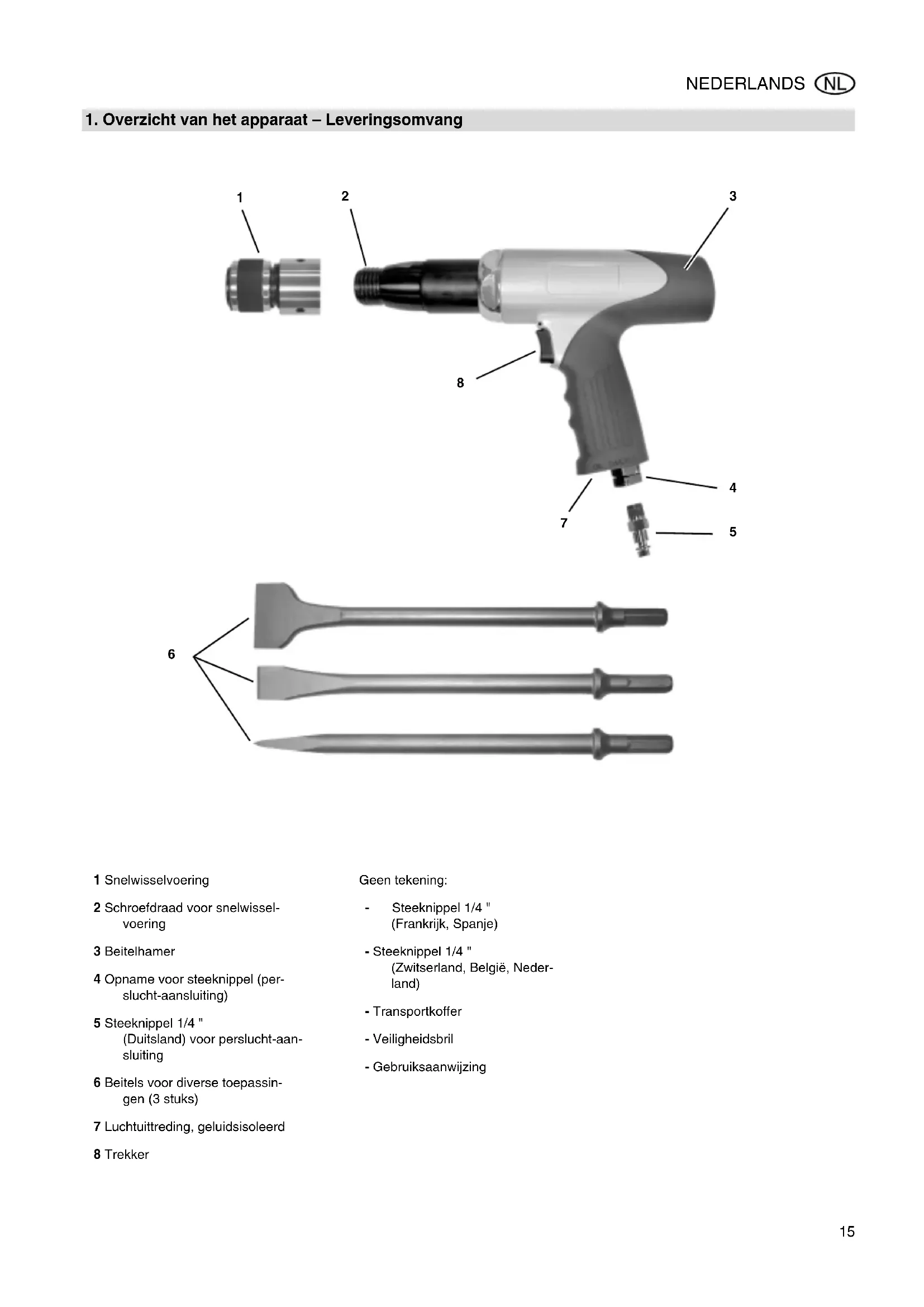 oud uw werkplek in orde – een wanordelijke werkplek kan ongeval- len tot gevolg hebben. Wee s aandachtig. Gebruik dit gereedschap niet, wanneer u niet geconcentreerd bent. Houd kinderen en andere personen van het arbeidsbereik vandaan. Bewaar persluchtgereedschap voor kinderen ontoegankelijk op. Sluit di t gereedschap uitsluitend via een snelkoppeling aan op een com- pressor. Bewerk geen de gezondheid bedrei- gende stoffen. Bij het werken met het werktuig kan vonkenslag ontstaan. Gebruik het werktuig niet in de buurt van brand- bare materialen, vloeistoffen of gas- sen. Raak de beitel tijdens de werkzaam- heden niet aan. Sch eidt het toestel van de perslucht- aansluiting alvorens u: beitel s vervangt, stori ngen verhelpt of wann eer het werktuig zonder toe- zicht is.