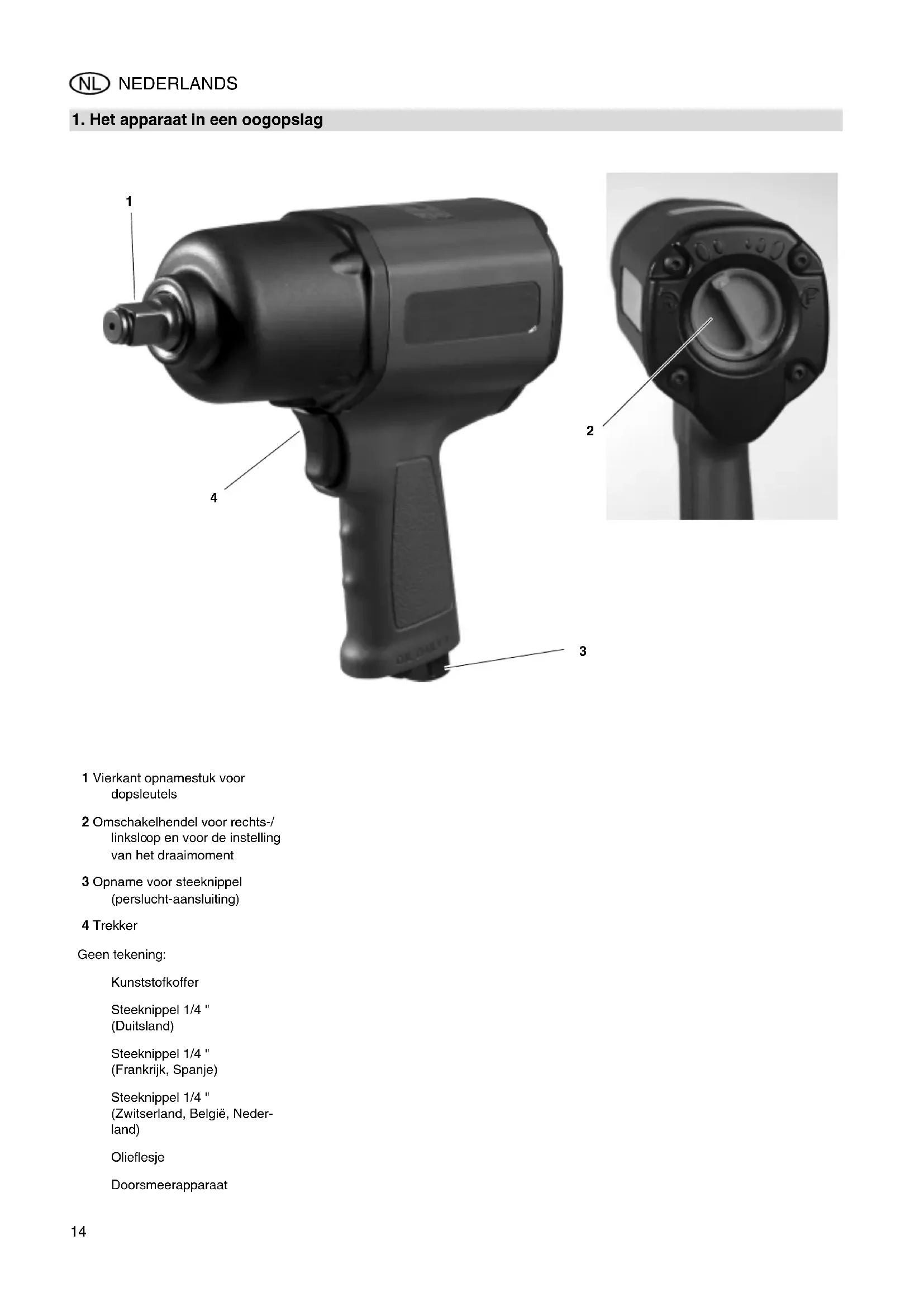 1 Vierkant opnamestuk voor dopsleutels 2 Omschakelhendel voor rechts-/ linkslo op en voor de instelling van het draaimoment 3 Opname voor steeknippel (perslucht-aansluiting) 4 Trekker Geen tekening: Kunststofkoffer Steeknippel 1/4 " (Duitsland) Steeknippel 1/4 " (Frankrijk, Spanje) Steeknippel 1/4 " (Zwitserland, België, Neder- land) Olieflesje Doorsmeerapparaat XK0041H2.fm Handleiding NEDERLANDS15 NEDERLANDS