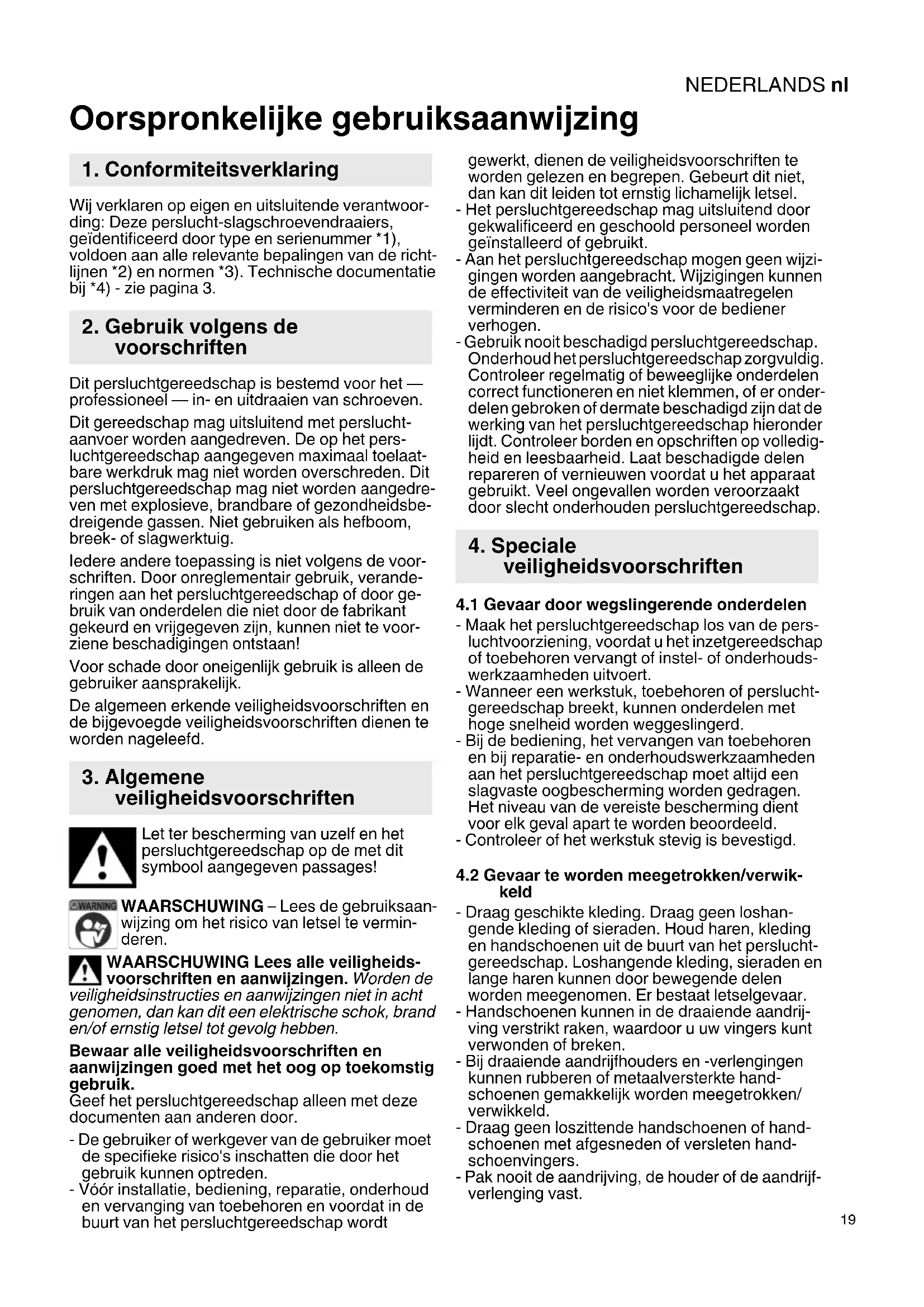 Oorspronkelijke gebruiksaanwijzing Wij verklaren op eigen en uitsluitende verantwoor- ding: Deze perslucht-slagschroevendraaiers, geïdentificeerd door type en serienummer *1), voldoen aan alle relevante bepalingen van de richt- lijnen *2) en normen *3). Technische documentatie bij *4) - zie pagina 3. Dit persluchtgereedschap is bestemd voor het — professioneel — in- en uitdraaien van schroeven. Dit gereedschap mag uitsluitend met perslucht- aanvoer worden aangedreven. De op het pers- luchtgereedschap aangegeven maximaal toelaat- bare werkdruk mag niet worden overschreden. Dit persluchtgereedschap mag niet worden aangedre- ven met explosieve, brandbare of gezondheidsbe- dreigende gassen. Niet gebruiken als hefboom, breek- of slagwerktuig. Iedere andere toepassing is niet volgens de voor- schriften. Door onreglementair gebruik, verande- ringen aan het persluchtgereedschap of door ge- bruik van onderdelen die niet door de fabrikant gekeurd en vrijgegeven zijn, kunnen niet te voor- ziene beschadigingen ontstaan! Voor schade door oneigenlijk gebruik is alleen de gebruiker aansprakelijk. De algemeen erkende veiligheidsvoorschriften en de bijgevoegde veiligheidsvoorschriften dienen te worden nageleefd. Let ter bescherming van uzelf en het persluchtgereedschap op de met dit symbool aangegeven passages! WAARSCHUWING – Lees de gebruiksaan- wijzing om het risico van letsel te vermin- deren. WAARSCHUWING Lees alle veiligheids- voorschriften en aanwijzingen. Worden de veiligheidsinstructies en aanwijzingen niet in acht genomen, dan kan dit een elektrische schok, brand en/of ernstig letsel tot gevolg hebben. Bewaar alle veiligheidsvoorschriften en aanwijzingen goed met het oog op toekomstig gebruik. Geef het persluchtgereedschap alleen met deze documenten aan anderen door. - De gebruiker of werkgever van de gebruiker moet de specifieke risico's inschatten die door het gebruik kunnen optreden. - Vóór installatie, bediening, reparatie, onderhoud en vervanging van toebehoren en voordat in de buurt van het persluchtgereedschap wordt gewerkt, dienen de veiligheidsvoorschriften te worden gelezen en begrepen. Gebeurt dit niet, dan kan dit leiden tot ernstig lichamelijk letsel. - Het persluchtgereedschap mag uitsluitend door gekwalificeerd en geschoold personeel worden geïnstalleerd of gebruikt. - Aan het persluchtgereedschap mogen geen wijzi- gingen worden aangebracht. Wijzigingen kunnen de effectiviteit van de veiligheidsmaatregelen verminderen en de risico's voor de bediener verhogen. - Gebruik nooit beschadigd persluchtgereedschap. Onderhoud het persluchtgereedschap zorgvuldig. Controleer regelmatig of beweeglijke onderdelen correct functioneren en niet klemmen, of er onder- delen gebroken of dermate beschadigd zijn dat de werking van het persluchtgereedschap hieronder lijdt. Controleer borden en opschriften op volledig- heid en leesbaarheid. Laat beschadigde delen repareren of vernieuwen voordat u het apparaat gebruikt. Veel ongevallen worden veroorzaakt door slecht onderhouden persluchtgereedschap.