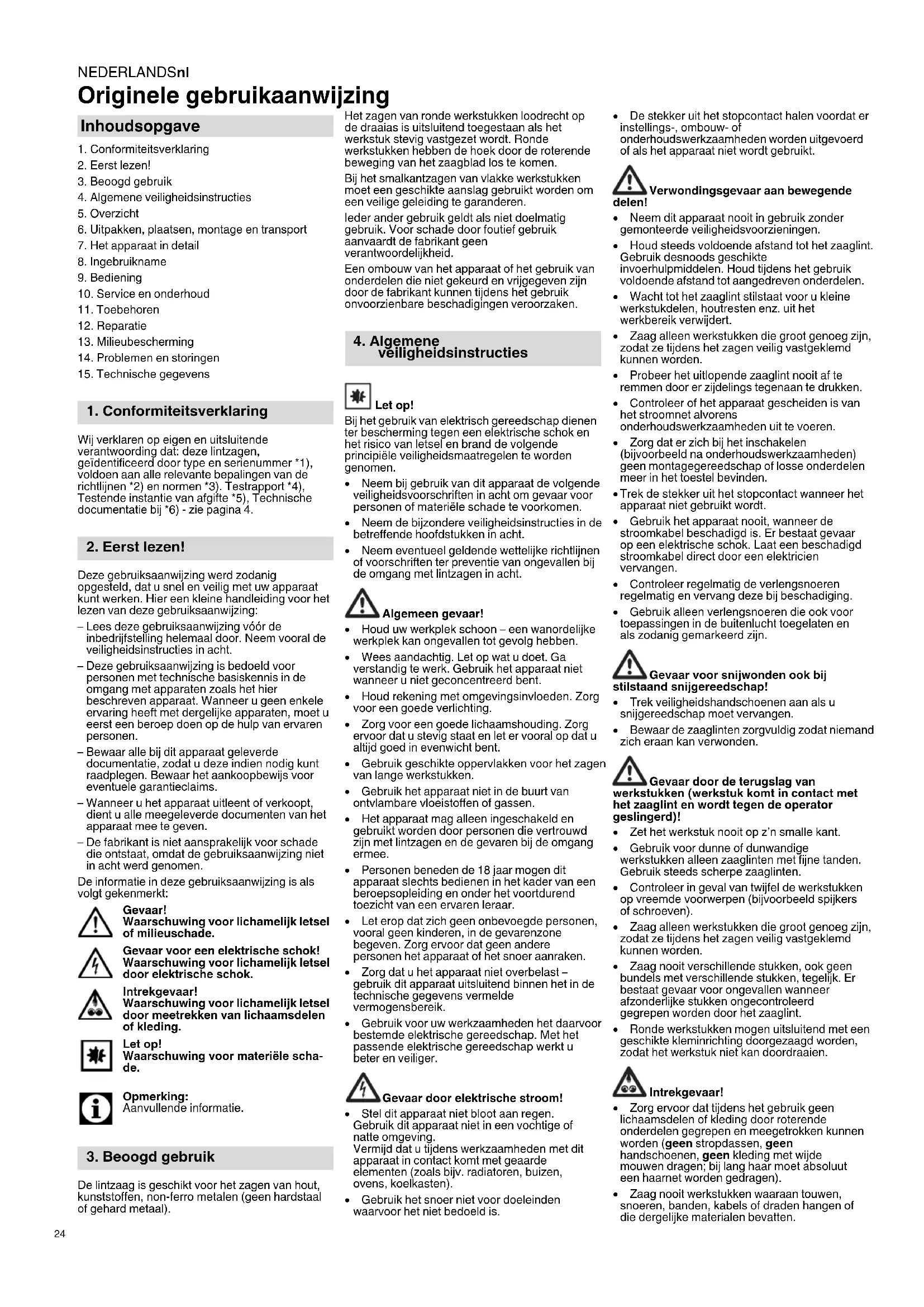 Wij verklaren op eigen en uitsluitende verantwoording dat: deze lintzagen, geïdentificeerd door type en serienummer *1), voldoen aan alle relevante bepalingen van de richtlijnen *2) en normen *3). Testrapport *4), Testende instantie van afgifte *5), Technische documentatie bij *6) - zie pagina 4. Deze gebruiksaanwijzing werd zodanig opgesteld, dat u snel en veilig met uw apparaat kunt werken. Hier een kleine handleiding voor het lezen van deze gebruiksaanwijzing: – Lees deze gebruiksaanwijzing vóór de inbedrijfstelling helemaal door. Neem vooral de veiligheidsinstructies in acht. – Deze gebruiksaanwijzing is bedoeld voor personen met technische basiskennis in de omgang met apparaten zoals het hier beschreven apparaat. Wanneer u geen enkele ervaring heeft met dergelijke apparaten, moet u eerst een beroep doen op de hulp van ervaren personen. – Bewaar alle bij dit apparaat geleverde documentatie, zodat u deze indien nodig kunt raadplegen. Bewaar het aankoopbewijs voor eventuele garantieclaims. – Wanneer u het apparaat uitleent of verkoopt, dient u alle meegeleverde documenten van het apparaat mee te geven. – De fabrikant is niet aansprakelijk voor schade die ontstaat, omdat de gebruiksaanwijzing niet in acht werd genomen. De informatie in deze gebruiksaanwijzing is als volgt gekenmerkt: Gevaar! Waarschuwing voor lichamelijk letsel of milieuschade. Gevaar voor een elektrische schok! Waarschuwing voor lichamelijk letsel door elektrische schok. Intrekgevaar! Waarschuwing voor lichamelijk letsel door meetrekken van lichaamsdelen of kleding. Let op! Waarschuwing voor materiële scha- de. Opmerking: Aanvullende informatie. De lintzaag is geschikt voor het zagen van hout, kunststoffen, non-ferro metalen (geen hardstaal of gehard metaal). Het zagen van ronde werkstukken loodrecht op de draaias is uitsluitend toegestaan als het werkstuk stevig vastgezet wordt. Ronde werkstukken hebben de hoek door de roterende beweging van het zaagblad los te komen. Bij het smalkantzagen van vlakke werkstukken moet een geschikte aanslag gebruikt worden om een veilige geleiding te garanderen. Ieder ander gebruik geldt als niet doelmatig gebruik. Voor schade door foutief gebruik aanvaardt de fabrikant geen verantwoordelijkheid. Een ombouw van het apparaat of het gebruik van onderdelen die niet gekeurd en vrijgegeven zijn door de fabrikant kunnen tijdens het gebruik onvoorzienbare beschadigingen veroorzaken. Let op! Bij het gebruik van elektrisch gereedschap dienen ter bescherming tegen een elektrische schok en het risico van letsel en brand de volgende principiële veiligheidsmaatregelen te worden genomen. Neem bij gebruik van dit apparaat de volgende veiligheidsvoorschriften in acht om gevaar voor personen of materiële schade te voorkomen. Neem de bijzondere veiligheidsinstructies in de betreffende hoofdstukken in acht. Neem eventueel geldende wettelijke richtlijnen of voorschriften ter preventie van ongevallen bij de omgang met lintzagen in acht. Algemeen gevaar! Houd uw werkplek schoon – een wanordelijke werkplek kan ongevallen tot gevolg hebben. Wees aandachtig. Let op wat u doet. Ga verstandig te werk. Gebruik het apparaat niet wanneer u niet geconcentreerd bent. Houd rekening met omgevingsinvloeden. Zorg voor een goede verlichting. Zorg voor een goede lichaamshouding. Zorg ervoor dat u stevig staat en let er vooral op dat u altijd goed in evenwicht bent. Gebruik geschikte oppervlakken voor het zagen van lange werkstukken. Gebruik het apparaat niet in de buurt van ontvlambare vloeistoffen of gassen. Het apparaat mag alleen ingeschakeld en gebruikt worden door personen die vertrouwd zijn met lintzagen en de gevaren bij de omgang ermee. Personen beneden de 18 jaar mogen dit apparaat slechts bedienen in het kader van een beroepsopleiding en onder het voortdurend toezicht van een ervaren leraar. Let erop dat zich geen onbevoegde personen, vooral geen kinderen, in de gevarenzone begeven. Zorg ervoor dat geen andere personen het apparaat of het snoer aanraken. Zorg dat u het apparaat niet overbelast – gebruik dit apparaat uitsluitend binnen het in de technische gegevens vermelde vermogensbereik. Gebruik voor uw werkzaamheden het daarvoor bestemde elektrische gereedschap. Met het passende elektrische gereedschap werkt u beter en veiliger. Gevaar door elektrische stroom! Stel dit apparaat niet bloot aan regen. Gebruik dit apparaat niet in een vochtige of natte omgeving. Vermijd dat u tijdens werkzaamheden met dit apparaat in contact komt met geaarde elementen (zoals bijv. radiatoren, buizen, ovens, koelkasten). Gebruik het snoer niet voor doeleinden waarvoor het niet bedoeld is. De stekker uit het stopcontact halen voordat er instellings-, ombouw- of onderhoudswerkzaamheden worden uitgevoerd of als het apparaat niet wordt gebruikt. Verwondingsgevaar aan bewegende delen! Neem dit apparaat nooit in gebruik zonder gemonteerde veiligheidsvoorzieningen. Houd steeds voldoende afstand tot het zaaglint. Gebruik desnoods geschikte invoerhulpmiddelen. Houd tijdens het gebruik voldoende afstand tot aangedreven onderdelen. Wacht tot het zaaglint stilstaat voor u kleine werkstukdelen, houtresten enz. uit het werkbereik verwijdert. Zaag alleen werkstukken die groot genoeg zijn, zodat ze tijdens het zagen veilig vastgeklemd kunnen worden. Probeer het uitlopende zaaglint nooit af te remmen door er zijdelings tegenaan te drukken. Controleer of het apparaat gescheiden is van het stroomnet alvorens onderhoudswerkzaamheden uit te voeren. Zorg dat er zich bij het inschakelen (bijvoorbeeld na onderhoudswerkzaamheden) geen montagegereedschap of losse onderdelen meer in het toestel bevinden.