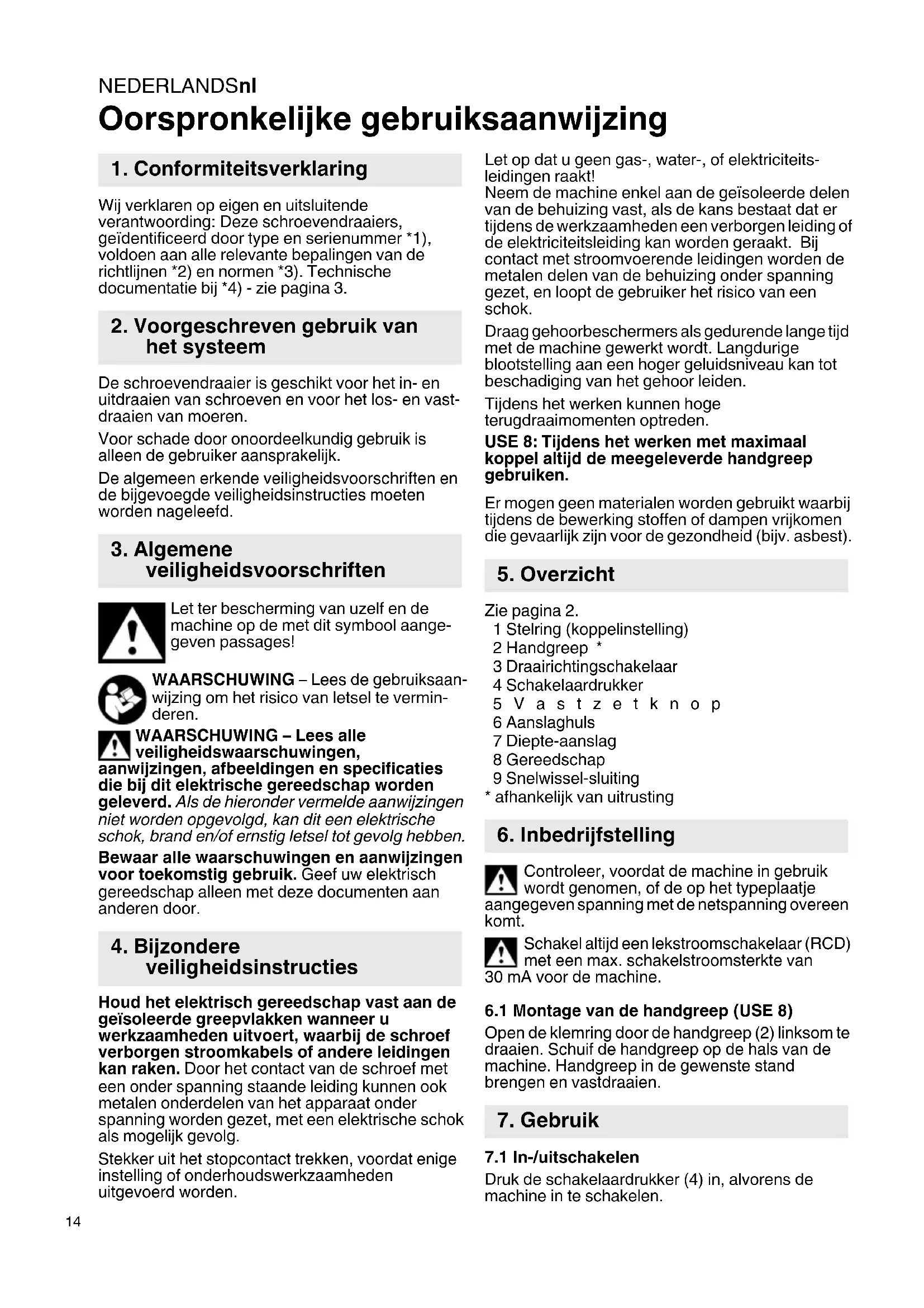Oorspronkelijke gebruiksaanwijzing Wij verklaren op eigen en uitsluitende verantwoording: Deze schroevendraaiers, geïdentificeerd door type en serienummer *1), voldoen aan alle relevante bepalingen van de richtlijnen *2) en normen *3). Technische documentatie bij *4) - zie pagina 3. De schroevendraaier is geschikt voor het in- en uitdraaien van schroeven en voor het los- en vast- draaien van moeren. Voor schade door onoordeelkundig gebruik is alleen de gebruiker aansprakelijk. De algemeen erkende veiligheidsvoorschriften en de bijgevoegde veiligheidsinstructies moeten worden nageleefd. Let ter bescherming van uzelf en de machine op de met dit symbool aange- geven passages! WAARSCHUWING – Lees de gebruiksaan- wijzing om het risico van letsel te vermin- deren. WAARSCHUWING – Lees alle veiligheidswaarschuwingen, aanwijzingen, afbeeldingen en specificaties die bij dit elektrische gereedschap worden geleverd. Als de hieronder vermelde aanwijzingen niet worden opgevolgd, kan dit een elektrische schok, brand en/of ernstig letsel tot gevolg hebben. Bewaar alle waarschuwingen en aanwijzingen voor toekomstig gebruik. Geef uw elektrisch gereedschap alleen met deze documenten aan anderen door. Houd het elektrisch gereedschap vast aan de geïsoleerde greepvlakken wanneer u werkzaamheden uitvoert, waarbij de schroef verborgen stroomkabels of andere leidingen kan raken. Door het contact van de schroef met een onder spanning staande leiding kunnen ook metalen onderdelen van het apparaat onder spanning worden gezet, met een elektrische schok als mogelijk gevolg. Stekker uit het stopcontact trekken, voordat enige instelling of onderhoudswerkzaamheden uitgevoerd worden. Let op dat u geen gas-, water-, of elektriciteits- leidingen raakt! Neem de machine enkel aan de geïsoleerde delen van de behuizing vast, als de kans bestaat dat er tijdens de werkzaamheden een verborgen leiding of de elektriciteitsleiding kan worden geraakt. Bij contact met stroomvoerende leidingen worden de metalen delen van de behuizing onder spanning gezet, en loopt de gebruiker het risico van een schok. Draag gehoorbeschermers als gedurende lange tijd met de machine gewerkt wordt. Langdurige blootstelling aan een hoger geluidsniveau kan tot beschadiging van het gehoor leiden. Tijdens het werken kunnen hoge terugdraaimomenten optreden. USE 8: Tijdens het werken met maximaal koppel altijd de meegeleverde handgreep gebruiken. Er mogen geen materialen worden gebruikt waarbij tijdens de bewerking stoffen of dampen vrijkomen die gevaarlijk zijn voor de gezondheid (bijv. asbest). Zie pagina 2. 1 Stelring (koppelinstelling) 2 Handgreep