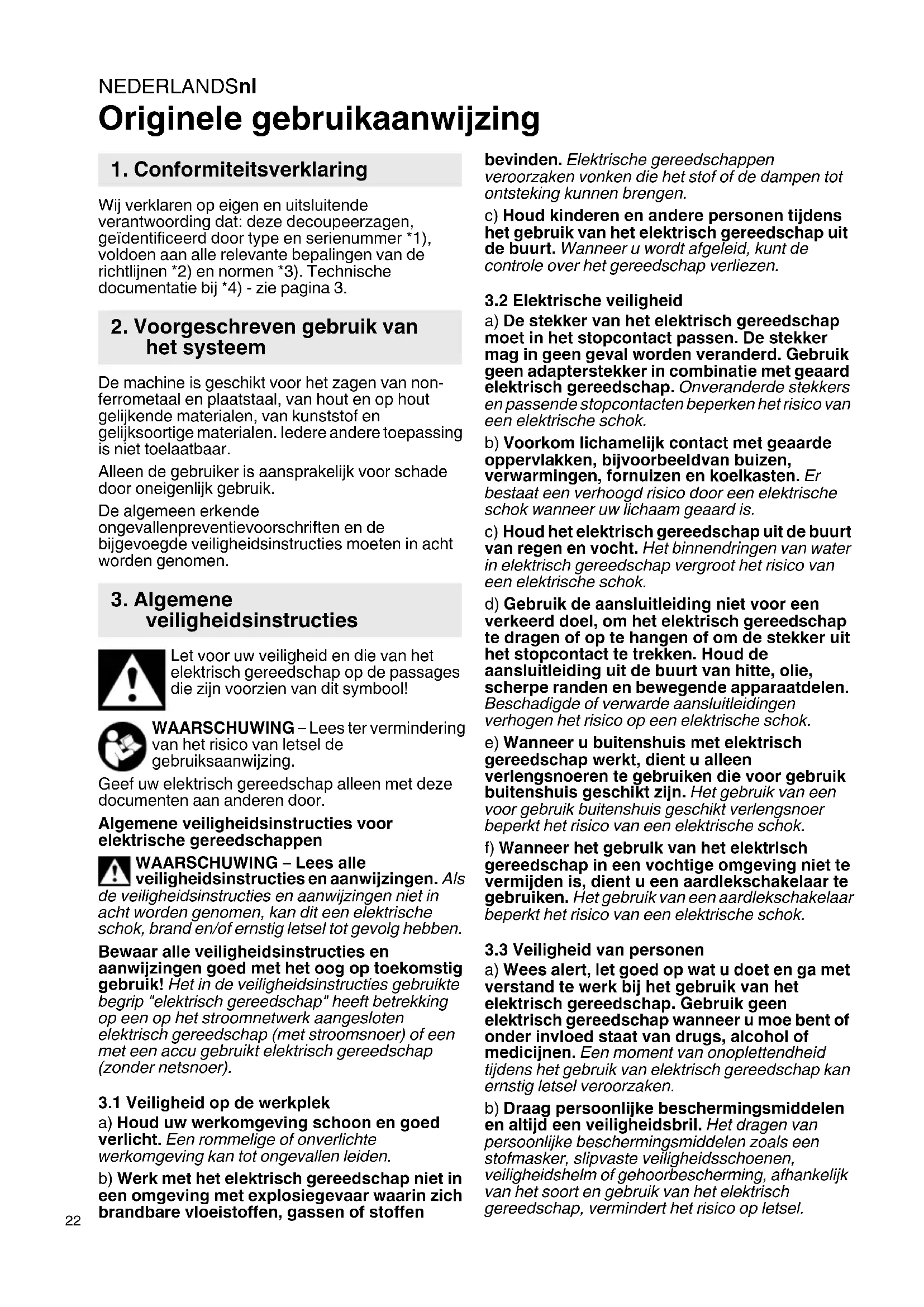 Originele gebruikaanwijzing Wij verklaren op eigen en uitsluitende verantwoording dat: deze decoupeerzagen, geïdentificeerd door type en serienummer *1), voldoen aan alle relevante bepalingen van de richtlijnen *2) en normen *3). Technische documentatie bij *4) - zie pagina 3. De machine is geschikt voor het zagen van non- ferrometaal en plaatstaal, van hout en op hout gelijkende materialen, van kunststof en gelijksoortige materialen. Iedere andere toepassing is niet toelaatbaar. Alleen de gebruiker is aansprakelijk voor schade door oneigenlijk gebruik. De algemeen erkende ongevallenpreventievoorschriften en de bijgevoegde veiligheidsinstructies moeten in acht worden genomen. Let voor uw veiligheid en die van het elektrisch gereedschap op de passages die zijn voorzien van dit symbool! WAARSCHUWING – Lees ter vermindering van het risico van letsel de gebruiksaanwijzing. Geef uw elektrisch gereedschap alleen met deze documenten aan anderen door. Algemene veiligheidsinstructies voor elektrische gereedschappen WAARSCHUWING – Lees alle veiligheidsinstructies en aanwijzingen. Als de veiligheidsinstructies en aanwijzingen niet in acht worden genomen, kan dit een elektrische schok, brand en/of ernstig letsel tot gevolg hebben. Bewaar alle veiligheidsinstructies en aanwijzingen goed met het oog op toekomstig gebruik! Het in de veiligheidsinstructies gebruikte begrip "elektrisch gereedschap" heeft betrekking op een op het stroomnetwerk aangesloten elektrisch gereedschap (met stroomsnoer) of een met een accu gebruikt elektrisch gereedschap (zonder netsnoer).