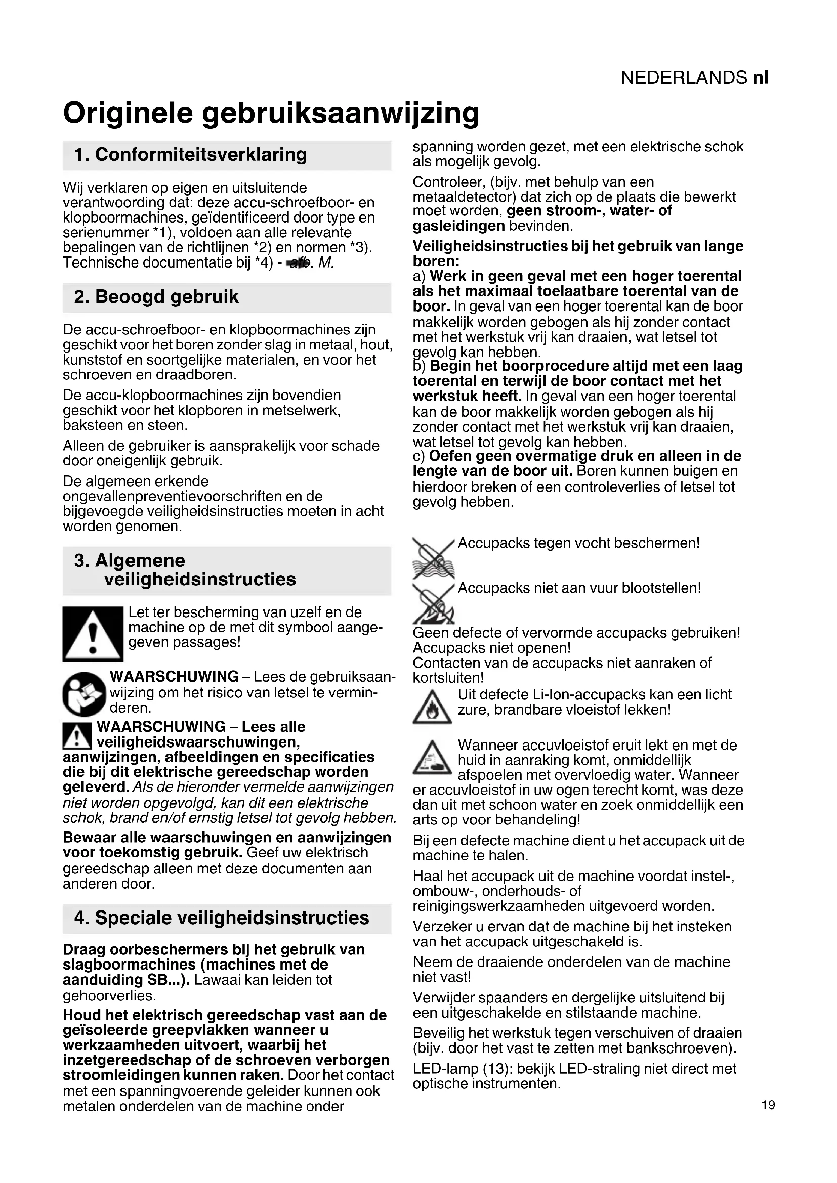 Wij verklaren op eigen en uitsluitende verantwoording dat: deze accu-schroefboor- en klopboormachines, geïdentificeerd door type en serienummer *1), voldoen aan alle relevante bepalingen van de richtlijnen *2) en normen *3). Technische documentatie bij *4) - afb. M. De accu-schroefboor- en klopboormachines zijn geschikt voor het boren zonder slag in metaal, hout, kunststof en soortgelijke materialen, en voor het schroeven en draadboren. De accu-klopboormachines zijn bovendien geschikt voor het klopboren in metselwerk, baksteen en steen. Alleen de gebruiker is aansprakelijk voor schade door oneigenlijk gebruik. De algemeen erkende ongevallenpreventievoorschriften en de bijgevoegde veiligheidsinstructies moeten in acht worden genomen. Let ter bescherming van uzelf en de machine op de met dit symbool aange- geven passages! WAARSCHUWING – Lees de gebruiksaan- wijzing om het risico van letsel te vermin- deren. WAARSCHUWING – Lees alle veiligheidswaarschuwingen, aanwijzingen, afbeeldingen en specificaties die bij dit elektrische gereedschap worden geleverd. Als de hieronder vermelde aanwijzingen niet worden opgevolgd, kan dit een elektrische schok, brand en/of ernstig letsel tot gevolg hebben. Bewaar alle waarschuwingen en aanwijzingen voor toekomstig gebruik. Geef uw elektrisch gereedschap alleen met deze documenten aan anderen door. Draag oorbeschermers bij het gebruik van slagboormachines (machines met de aanduiding SB...). Lawaai kan leiden tot gehoorverlies. Houd het elektrisch gereedschap vast aan de geïsoleerde greepvlakken wanneer u werkzaamheden uitvoert, waarbij het inzetgereedschap of de schroeven verborgen stroomleidingen kunnen raken. Door het contact met een spanningvoerende geleider kunnen ook metalen onderdelen van de machine onder spanning worden gezet, met een elektrische schok als mogelijk gevolg. Controleer, (bijv. met behulp van een metaaldetector) dat zich op de plaats die bewerkt moet worden, geen stroom-, water- of gasleidingen bevinden. Veiligheidsinstructies bij het gebruik van lange boren: a) Werk in geen geval met een hoger toerental als het maximaal toelaatbare toerental van de boor. In geval van een hoger toerental kan de boor makkelijk worden gebogen als hij zonder contact met het werkstuk vrij kan draaien, wat letsel tot gevolg kan hebben. b) Begin het boorprocedure altijd met een laag toerental en terwijl de boor contact met het werkstuk heeft. In geval van een hoger toerental kan de boor makkelijk worden gebogen als hij zonder contact met het werkstuk vrij kan draaien, wat letsel tot gevolg kan hebben. c) Oefen geen overmatige druk en alleen in de lengte van de boor uit. Boren kunnen buigen en hierdoor breken of een controleverlies of letsel tot gevolg hebben. Accupacks tegen vocht beschermen! Accupacks niet aan vuur blootstellen! Geen defecte of vervormde accupacks gebruiken! Accupacks niet openen! Contacten van de accupacks niet aanraken of kortsluiten! Uit defecte Li-Ion-accupacks kan een licht zure, brandbare vloeistof lekken! Wanneer accuvloeistof eruit lekt en met de huid in aanraking komt, onmiddellijk afspoelen met overvloedig water. Wanneer er accuvloeistof in uw ogen terecht komt, was deze dan uit met schoon water en zoek onmiddellijk een arts op voor behandeling! Bij een defecte machine dient u het accupack uit de machine te halen. Haal het accupack uit de machine voordat instel-, ombouw-, onderhouds- of reinigingswerkzaamheden uitgevoerd worden. Verzeker u ervan dat de machine bij het insteken van het accupack uitgeschakeld is. Neem de draaiende onderdelen van de machine niet vast! Verwijder spaanders en dergelijke uitsluitend bij een uitgeschakelde en stilstaande machine. Beveilig het werkstuk tegen verschuiven of draaien (bijv. door het vast te zetten met bankschroeven). LED-lamp (13): bekijk LED-straling niet direct met optische instrumenten. Originele gebruiksaanwijzing