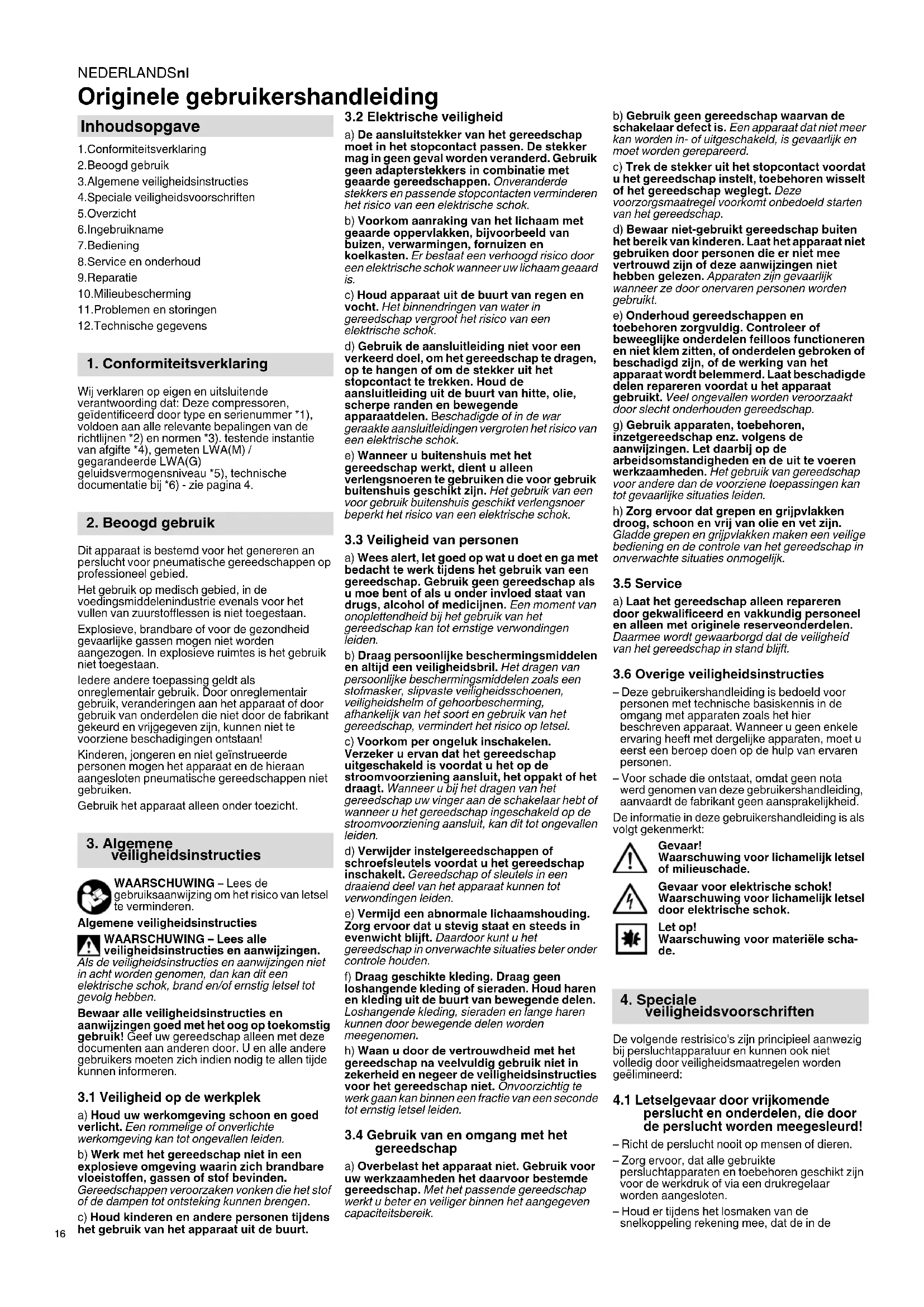 persluchtslang aanwezige perslucht plotseling ontsnapt. Houd daarom het los te maken uiteinde van de persluchtslang vast. – Controleer of alle schroefverbindingen altijd stevig zijn vastgedraaid. – Voer nooit zelf reparaties uit aan het apparaat! Alleen gekwalificeerd personeel mag reparaties aan compressoren, drukvaten en pneumatische apparaten uitvoeren.