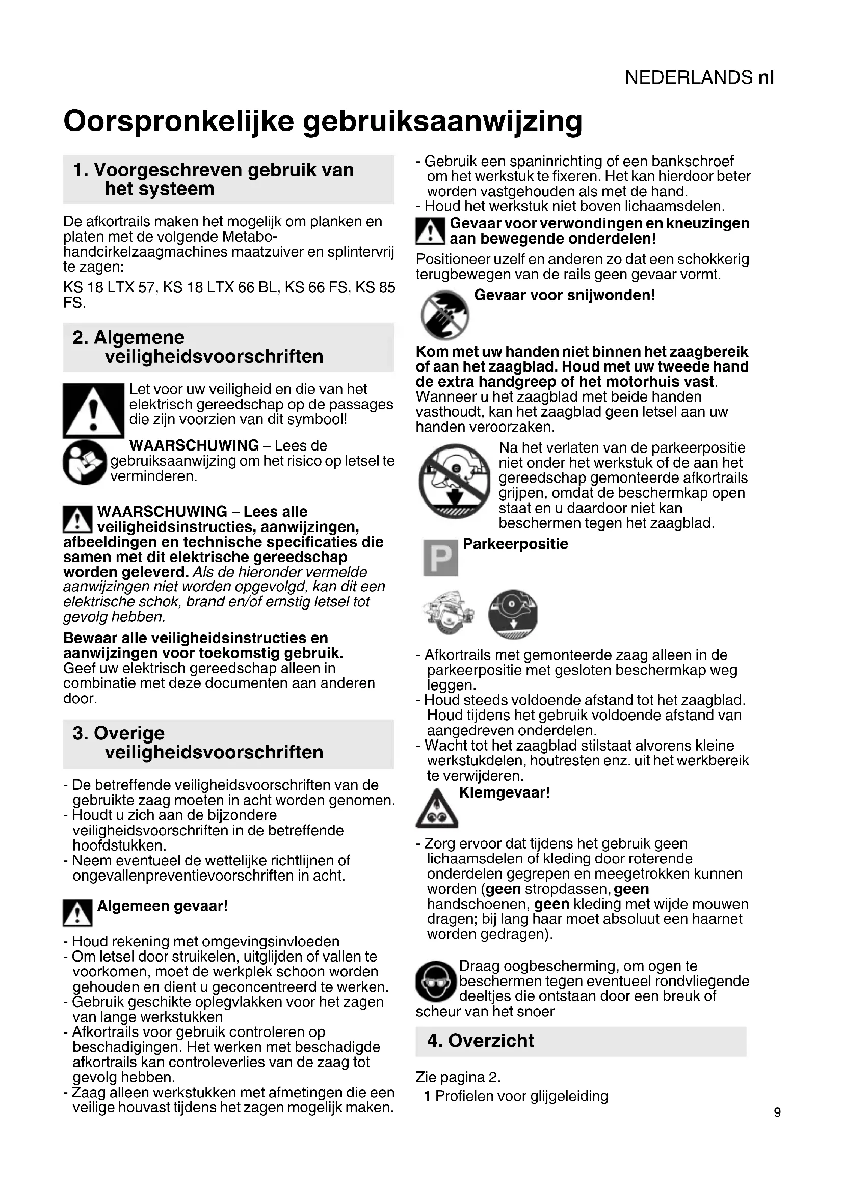 De afkortrails maken het mogelijk om planken en platen met de volgende Metabo- handcirkelzaagmachines maatzuiver en splintervrij te zagen: KS 18 LTX 57, KS 18 LTX 66 BL, KS 66 FS, KS 85 FS. Let voor uw veiligheid en die van het elektrisch gereedschap op de passages die zijn voorzien van dit symbool! WAARSCHUWING – Lees de gebruiksaanwijzing om het risico op letsel te verminderen. WAARSCHUWING – Lees alle veiligheidsinstructies, aanwijzingen, afbeeldingen en technische specificaties die samen met dit elektrische gereedschap worden geleverd. Als de hieronder vermelde aanwijzingen niet worden opgevolgd, kan dit een elektrische schok, brand en/of ernstig letsel tot gevolg hebben. Bewaar alle veiligheidsinstructies en aanwijzingen voor toekomstig gebruik. Geef uw elektrisch gereedschap alleen in combinatie met deze documenten aan anderen door. - De betreffende veiligheidsvoorschriften van de gebruikte zaag moeten in acht worden genomen. - Houdt u zich aan de bijzondere veiligheidsvoorschriften in de betreffende hoofdstukken. - Neem eventueel de wettelijke richtlijnen of ongevallenpreventievoorschriften in acht. Algemeen gevaar! - Houd rekening met omgevingsinvloeden - Om letsel door struikelen, uitglijden of vallen te voorkomen, moet de werkplek schoon worden gehouden en dient u geconcentreerd te werken. - Gebruik geschikte oplegvlakken voor het zagen van lange werkstukken - Afkortrails voor gebruik controleren op beschadigingen. Het werken met beschadigde afkortrails kan controleverlies van de zaag tot gevolg hebben. - Zaag alleen werkstukken met afmetingen die een veilige houvast tijdens het zagen mogelijk maken. - Gebruik een spaninrichting of een bankschroef om het werkstuk te fixeren. Het kan hierdoor beter worden vastgehouden als met de hand. - Houd het werkstuk niet boven lichaamsdelen. Gevaar voor verwondingen en kneuzingen aan bewegende onderdelen! Positioneer uzelf en anderen zo dat een schokkerig terugbewegen van de rails geen gevaar vormt. Gevaar voor snijwonden! Kom met uw handen niet binnen het zaagbereik of aan het zaagblad. Houd met uw tweede hand de extra handgreep of het motorhuis vast. Wanneer u het zaagblad met beide handen vasthoudt, kan het zaagblad geen letsel aan uw handen veroorzaken. Na het verlaten van de parkeerpositie niet onder het werkstuk of de aan het gereedschap gemonteerde afkortrails grijpen, omdat de beschermkap open staat en u daardoor niet kan beschermen tegen het zaagblad. Parkeerpositie - Afkortrails met gemonteerde zaag alleen in de parkeerpositie met gesloten beschermkap weg leggen. - Houd steeds voldoende afstand tot het zaagblad. Houd tijdens het gebruik voldoende afstand van aangedreven onderdelen. - Wacht tot het zaagblad stilstaat alvorens kleine werkstukdelen, houtresten enz. uit het werkbereik te verwijderen. Klemgevaar! - Zorg ervoor dat tijdens het gebruik geen lichaamsdelen of kleding door roterende onderdelen gegrepen en meegetrokken kunnen worden (geen stropdassen, geen handschoenen, geen kleding met wijde mouwen dragen; bij lang haar moet absoluut een haarnet worden gedragen). Draag oogbescherming, om ogen te beschermen tegen eventueel rondvliegende deeltjes die ontstaan door een breuk of scheur van het snoer Zie pagina 2. 1 Profielen voor glijgeleiding Oorspronkelijke gebruiksaanwijzing