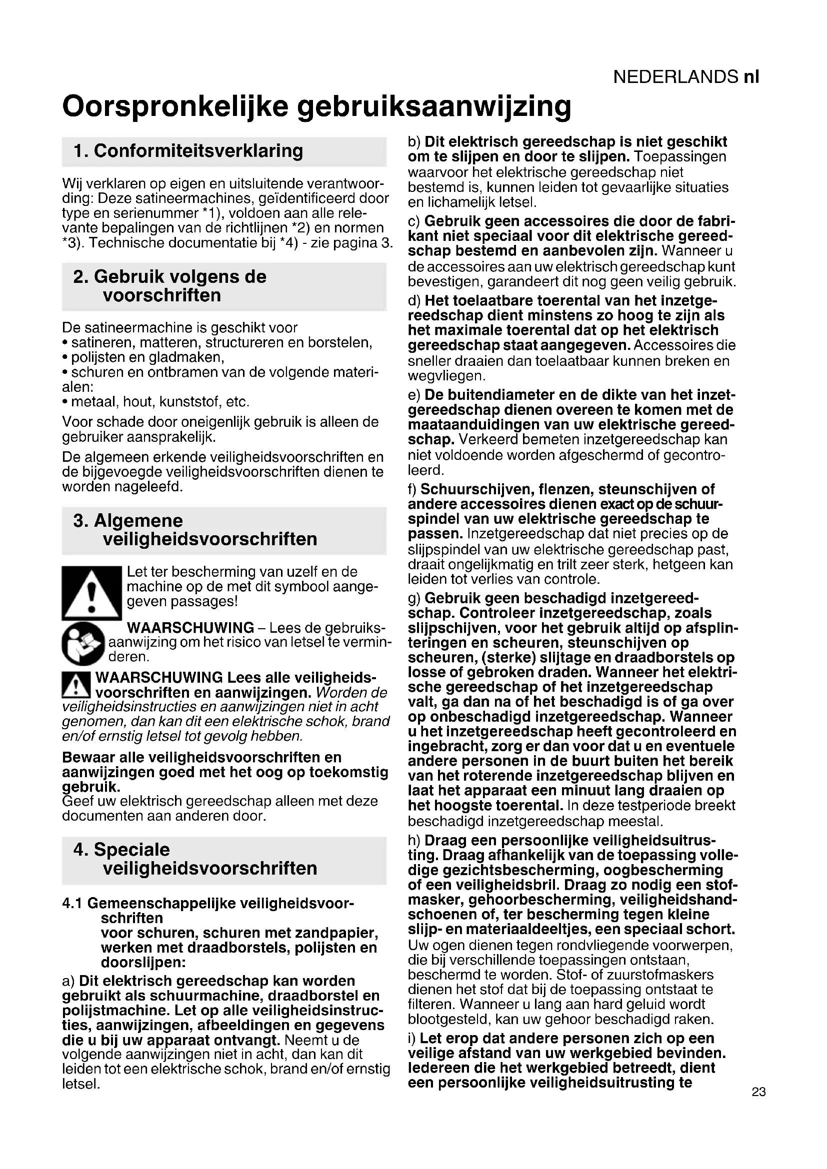 Oorspronkelijke gebruiksaanwijzing Wij verklaren op eigen en uitsluitende verantwoor- ding: Deze satineermachines, geïdentificeerd door type en serienummer *1), voldoen aan alle rele- vante bepalingen van de richtlijnen *2) en normen *3). Technische documentatie bij *4) - zie pagina 3. De satineermachine is geschikt voor