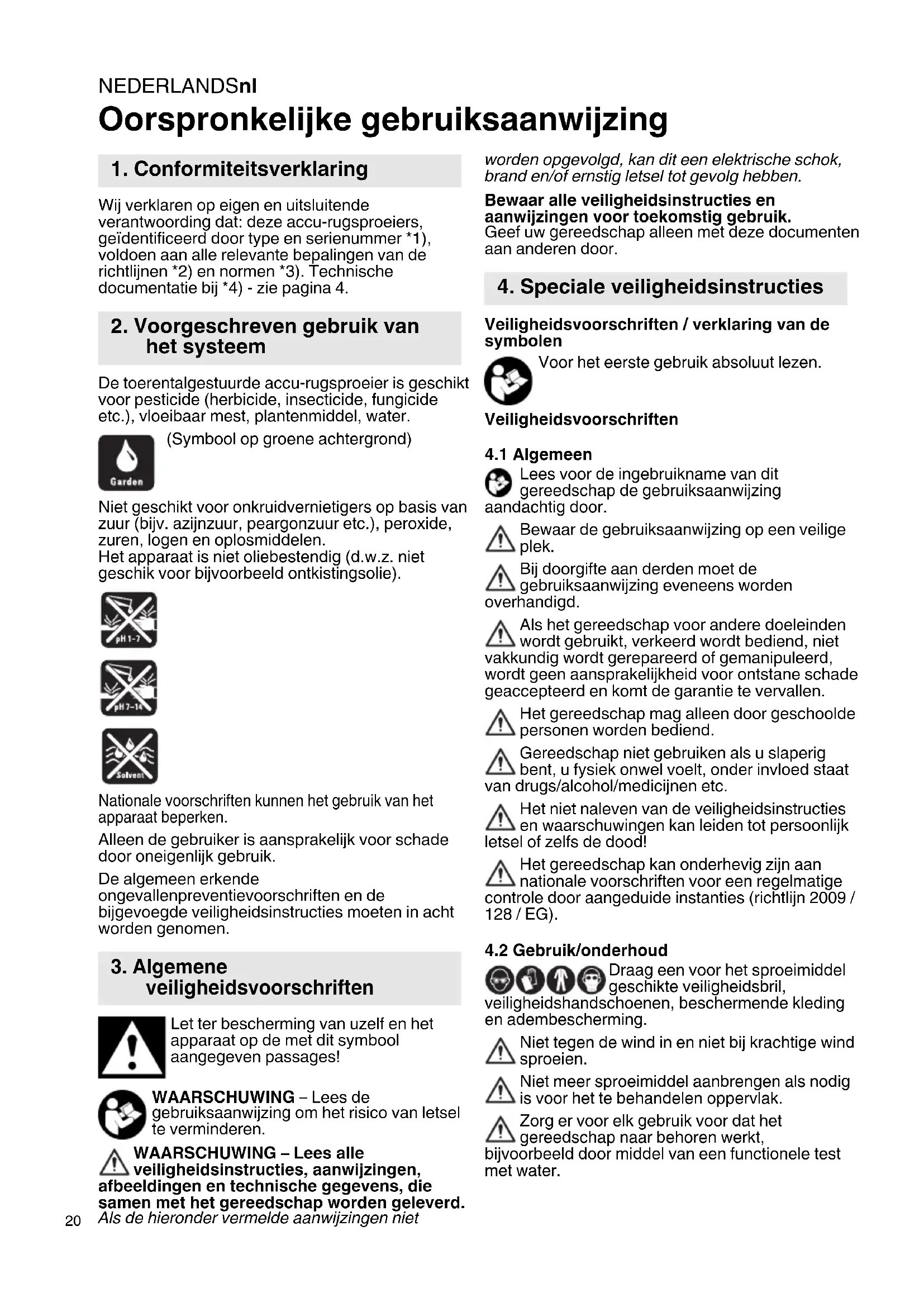 Oorspronkelijke gebruiksaanwijzing Wij verklaren op eigen en uitsluitende verantwoording dat: deze accu-rugsproeiers, geïdentificeerd door type en serienummer *1), voldoen aan alle relevante bepalingen van de richtlijnen *2) en normen *3). Technische documentatie bij *4) - zie pagina 4. De toerentalgestuurde accu-rugsproeier is geschikt voor pesticide (herbicide, insecticide, fungicide etc.), vloeibaar mest, plantenmiddel, water. (Symbool op groene achtergrond) Niet geschikt voor onkruidvernietigers op basis van zuur (bijv. azijnzuur, peargonzuur etc.), peroxide, zuren, logen en oplosmiddelen. Het apparaat is niet oliebestendig (d.w.z. niet geschik voor bijvoorbeeld ontkistingsolie). Nationale voorschriften kunnen het gebruik van het apparaat beperken. Alleen de gebruiker is aansprakelijk voor schade door oneigenlijk gebruik. De algemeen erkende ongevallenpreventievoorschriften en de bijgevoegde veiligheidsinstructies moeten in acht worden genomen. Let ter bescherming van uzelf en het apparaat op de met dit symbool aangegeven passages! WAARSCHUWING – Lees de gebruiksaanwijzing om het risico van letsel te verminderen. WAARSCHUWING – Lees alle veiligheidsinstructies, aanwijzingen, afbeeldingen en technische gegevens, die samen met het gereedschap worden geleverd. Als de hieronder vermelde aanwijzingen niet worden opgevolgd, kan dit een elektrische schok, brand en/of ernstig letsel tot gevolg hebben. Bewaar alle veiligheidsinstructies en aanwijzingen voor toekomstig gebruik. Geef uw gereedschap alleen met deze documenten aan anderen door. Veiligheidsvoorschriften / verklaring van de symbolen Voor het eerste gebruik absoluut lezen. Veiligheidsvoorschriften