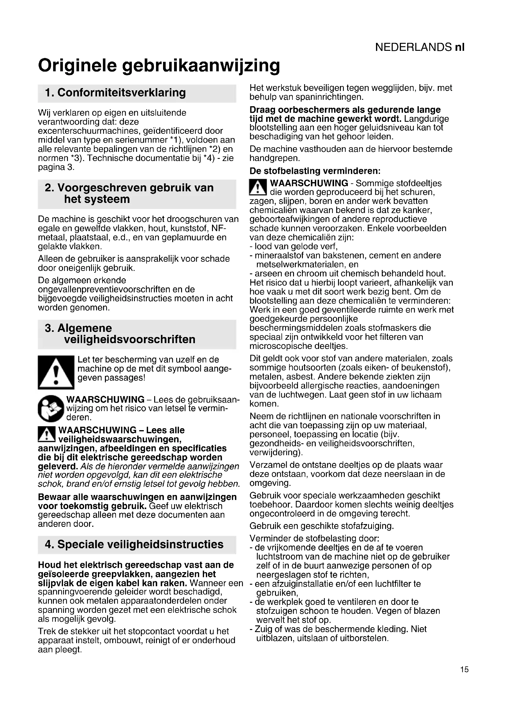 Originele gebruikaanwijzing Wij verklaren op eigen en uitsluitende verantwoording dat: deze excenterschuurmachines, geïdentificeerd door middel van type en serienummer *1), voldoen aan alle relevante bepalingen van de richtlijnen *2) en normen *3). Technische documentatie bij *4) - zie pagina 3. De machine is geschikt voor het droogschuren van egale en gewelfde vlakken, hout, kunststof, NF- metaal, plaatstaal, e.d., en van geplamuurde en gelakte vlakken. Alleen de gebruiker is aansprakelijk voor schade door oneigenlijk gebruik. De algemeen erkende ongevallenpreventievoorschriften en de bijgevoegde veiligheidsinstructies moeten in acht worden genomen. Let ter bescherming van uzelf en de machine op de met dit symbool aange- geven passages! WAARSCHUWING – Lees de gebruiksaan- wijzing om het risico van letsel te vermin- deren. WAARSCHUWING – Lees alle veiligheidswaarschuwingen, aanwijzingen, afbeeldingen en specificaties die bij dit elektrische gereedschap worden geleverd. Als de hieronder vermelde aanwijzingen niet worden opgevolgd, kan dit een elektrische schok, brand en/of ernstig letsel tot gevolg hebben. Bewaar alle waarschuwingen en aanwijzingen voor toekomstig gebruik. Geef uw elektrisch gereedschap alleen met deze documenten aan anderen door. Houd het elektrisch gereedschap vast aan de geïsoleerde greepvlakken, aangezien het slijpvlak de eigen kabel kan raken. Wanneer een spanningvoerende geleider wordt beschadigd, kunnen ook metalen apparaatonderdelen onder spanning worden gezet met een elektrische schok als mogelijk gevolg. Trek de stekker uit het stopcontact voordat u het apparaat instelt, ombouwt, reinigt of er onderhoud aan pleegt. Het werkstuk beveiligen tegen wegglijden, bijv. met behulp van spaninrichtingen. Draag oorbeschermers als gedurende lange tijd met de machine gewerkt wordt. Langdurige blootstelling aan een hoger geluidsniveau kan tot beschadiging van het gehoor leiden. De machine vasthouden aan de hiervoor bestemde handgrepen. De stofbelasting verminderen: WAARSCHUWING - Sommige stofdeeltjes die worden geproduceerd bij het schuren, zagen, slijpen, boren en ander werk bevatten chemicaliën waarvan bekend is dat ze kanker, geboorteafwijkingen of andere reproductieve schade kunnen veroorzaken. Enkele voorbeelden van deze chemicaliën zijn: - lood van gelode verf, - mineraalstof van bakstenen, cement en andere metselwerkmaterialen, en - arseen en chroom uit chemisch behandeld hout. Het risico dat u hierbij loopt varieert, afhankelijk van hoe vaak u met dit soort werk bezig bent. Om de blootstelling aan deze chemicaliën te verminderen: Werk in een goed geventileerde ruimte en werk met goedgekeurde persoonlijke beschermingsmiddelen zoals stofmaskers die speciaal zijn ontwikkeld voor het filteren van microscopische deeltjes. Dit geldt ook voor stof van andere materialen, zoals sommige houtsoorten (zoals eiken- of beukenstof), metalen, asbest. Andere bekende ziekten zijn bijvoorbeeld allergische reacties, aandoeningen van de luchtwegen. Laat geen stof in uw lichaam komen. Neem de richtlijnen en nationale voorschriften in acht die van toepassing zijn op uw materiaal, personeel, toepassing en locatie (bijv. gezondheids- en veiligheidsvoorschriften, verwijdering). Verzamel de ontstane deeltjes op de plaats waar deze ontstaan, voorkom dat deze neerslaan in de omgeving. Gebruik voor speciale werkzaamheden geschikt toebehoor. Daardoor komen slechts weinig deeltjes ongecontroleerd in de omgeving terecht. Gebruik een geschikte stofafzuiging. Verminder de stofbelasting door: - de vrijkomende deeltjes en de af te voeren luchtstroom van de machine niet op de gebruiker zelf of in de buurt aanwezige personen of op neergeslagen stof te richten, - een afzuiginstallatie en/of een luchtfilter te gebruiken, - de werkplek goed te ventileren en door te stofzuigen schoon te houden. Vegen of blazen wervelt het stof op. - Zuig of was de beschermende kleding. Niet uitblazen, uitslaan of uitborstelen.