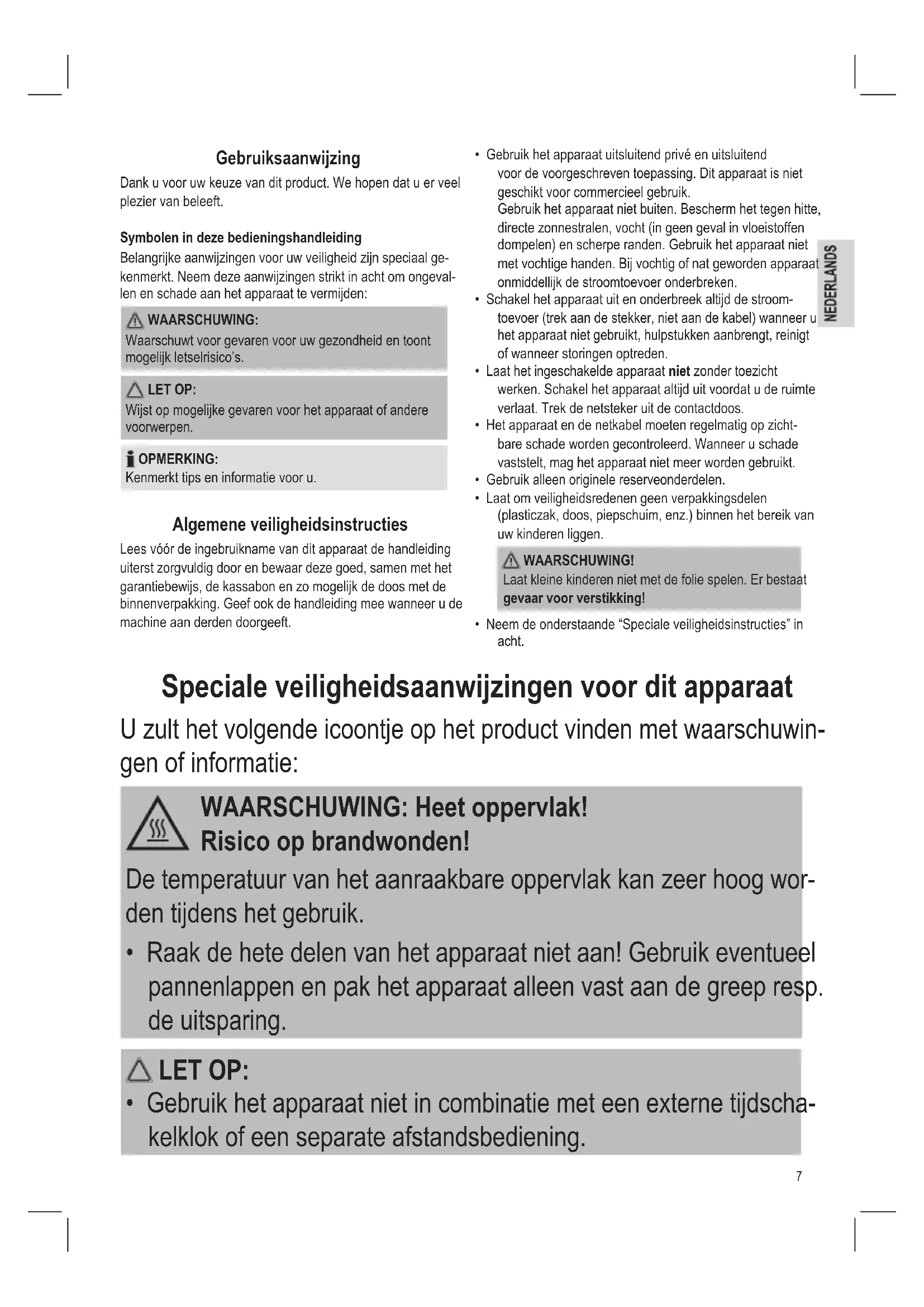 - Laat het ingeschakelde apparaat niet zonder toezicht werken. Schakel het apparaat altijd uit voordat u de ruimte verlaat. Trek de netsteker uit de contactdoos.