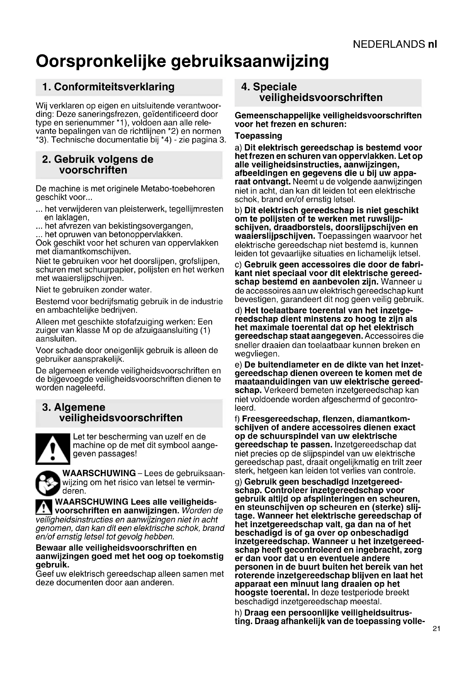 Oorspronkelijke gebruiksaanwijzing Wij verklaren op eigen en uitsluitende verantwoor- ding: Deze saneringsfrezen, geïdentificeerd door type en serienummer *1), voldoen aan alle rele- vante bepalingen van de richtlijnen *2) en normen *3). Technische documentatie bij *4) - zie pagina 3. De machine is met originele Metabo-toebehoren geschikt voor... ... het verwijderen van pleisterwerk, tegellijmresten en laklagen, ... het afvrezen van bekistingsovergangen, ... het opruwen van betonoppervlakken. Ook geschikt voor het schuren van oppervlakken met diamantkomschijven. Niet te gebruiken voor het doorslijpen, grofslijpen, schuren met schuurpapier, polijsten en het werken met waaierslijpschijven. Niet te gebruiken zonder water. Bestemd voor bedrijfsmatig gebruik in de industrie en ambachtelijke bedrijven. Alleen met geschikte stofafzuiging werken: Een zuiger van klasse M op de afzuigaansluiting (1) aansluiten. Voor schade door oneigenlijk gebruik is alleen de gebruiker aansprakelijk. De algemeen erkende veiligheidsvoorschriften en de bijgevoegde veiligheidsvoorschriften dienen te worden nageleefd. Let ter bescherming van uzelf en de machine op de met dit symbool aange- geven passages! WAARSCHUWING – Lees de gebruiksaan- wijzing om het risico van letsel te vermin- deren. WAARSCHUWING Lees alle veiligheids- voorschriften en aanwijzingen. Worden de veiligheidsinstructies en aanwijzingen niet in acht genomen, dan kan dit een elektrische schok, brand en/of ernstig letsel tot gevolg hebben. Bewaar alle veiligheidsvoorschriften en aanwijzingen goed met het oog op toekomstig gebruik. Geef uw elektrisch gereedschap alleen samen met deze documenten door aan anderen. Gemeenschappelijke veiligheidsvoorschriften voor het frezen en schuren: Toepassing a) Dit elektrisch gereedschap is bestemd voor het frezen en schuren van oppervlakken. Let op alle veiligheidsinstructies, aanwijzingen, afbeeldingen en gegevens die u bij uw appa- raat ontvangt. Neemt u de volgende aanwijzingen niet in acht, dan kan dit leiden tot een elektrische schok, brand en/of ernstig letsel. b) Dit elektrisch gereedschap is niet geschikt om te polijsten of te werken met ruwslijp- schijven, draadborstels, doorslijpschijven en waaierslijpschijven. Toepassingen waarvoor het elektrische gereedschap niet bestemd is, kunnen leiden tot gevaarlijke situaties en lichamelijk letsel. c) Gebruik geen accessoires die door de fabri- kant niet speciaal voor dit elektrische gereed- schap bestemd en aanbevolen zijn. Wanneer u de accessoires aan uw elektrisch gereedschap kunt bevestigen, garandeert dit nog geen veilig gebruik. d) Het toelaatbare toerental van het inzetge- reedschap dient minstens zo hoog te zijn als het maximale toerental dat op het elektrisch gereedschap staat aangegeven. Accessoires die sneller draaien dan toelaatbaar kunnen breken en wegvliegen. e) De buitendiameter en de dikte van het inzet- gereedschap dienen overeen te komen met de maataanduidingen van uw elektrische gereed- schap. Verkeerd bemeten inzetgereedschap kan niet voldoende worden afgeschermd of gecontro- leerd. f) Freesgereedschap, flenzen, diamantkom- schijven of andere accessoires dienen exact op de schuurspindel van uw elektrische gereedschap te passen. Inzetgereedschap dat niet precies op de slijpspindel van uw elektrische gereedschap past, draait ongelijkmatig en trilt zeer sterk, hetgeen kan leiden tot verlies van controle. g) Gebruik geen beschadigd inzetgereed- schap. Controleer inzetgereedschap voor gebruik altijd op afsplinteringen en scheuren, en steunschijven op scheuren en (sterke) slij- tage. Wanneer het elektrische gereedschap of het inzetgereedschap valt, ga dan na of het beschadigd is of ga over op onbeschadigd inzetgereedschap. Wanneer u het inzetgereed- schap heeft gecontroleerd en ingebracht, zorg er dan voor dat u en eventuele andere personen in de buurt buiten het bereik van het roterende inzetgereedschap blijven en laat het apparaat een minuut lang draaien op het hoogste toerental. In deze testperiode breekt beschadigd inzetgereedschap meestal. h) Draag een persoonlijke veiligheidsuitrus- ting. Draag afhankelijk van de toepassing volle-