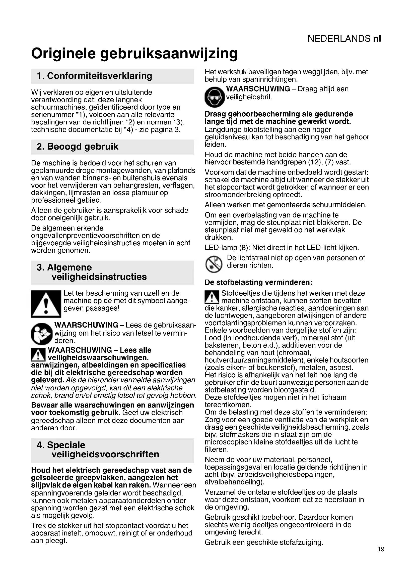 Originele gebruiksaanwijzing Wij verklaren op eigen en uitsluitende verantwoording dat: deze langnek schuurmachines, geïdentificeerd door type en serienummer *1), voldoen aan alle relevante bepalingen van de richtlijnen *2) en normen *3). technische documentatie bij *4) - zie pagina 3. De machine is bedoeld voor het schuren van geplamuurde droge montagewanden, van plafonds en van wanden binnens- en buitenshuis evenals voor het verwijderen van behangresten, verflagen, dekkingen, lijmresten en losse plamuur op professioneel gebied. Alleen de gebruiker is aansprakelijk voor schade door oneigenlijk gebruik. De algemeen erkende ongevallenpreventievoorschriften en de bijgevoegde veiligheidsinstructies moeten in acht worden genomen. Let ter bescherming van uzelf en de machine op de met dit symbool aange- geven passages! WAARSCHUWING – Lees de gebruiksaan- wijzing om het risico van letsel te vermin- deren. WAARSCHUWING – Lees alle veiligheidswaarschuwingen, aanwijzingen, afbeeldingen en specificaties die bij dit elektrische gereedschap worden geleverd. Als de hieronder vermelde aanwijzingen niet worden opgevolgd, kan dit een elektrische schok, brand en/of ernstig letsel tot gevolg hebben. Bewaar alle waarschuwingen en aanwijzingen voor toekomstig gebruik. Geef uw elektrisch gereedschap alleen met deze documenten aan anderen door. Houd het elektrisch gereedschap vast aan de geïsoleerde greepvlakken, aangezien het slijpvlak de eigen kabel kan raken. Wanneer een spanningvoerende geleider wordt beschadigd, kunnen ook metalen apparaatonderdelen onder spanning worden gezet met een elektrische schok als mogelijk gevolg. Trek de stekker uit het stopcontact voordat u het apparaat instelt, ombouwt, reinigt of er onderhoud aan pleegt. Het werkstuk beveiligen tegen wegglijden, bijv. met behulp van spaninrichtingen. WAARSCHUWING – Draag altijd een veiligheidsbril. Draag gehoorbescherming als gedurende lange tijd met de machine gewerkt wordt. Langdurige blootstelling aan een hoger geluidsniveau kan tot beschadiging van het gehoor leiden. Houd de machine met beide handen aan de hiervoor bestemde handgrepen (12), (7) vast. Voorkom dat de machine onbedoeld wordt gestart: schakel de machine altijd uit wanneer de stekker uit het stopcontact wordt getrokken of wanneer er een stroomonderbreking optreedt. Alleen werken met gemonteerde schuurmiddelen. Om een overbelasting van de machine te vermijden, mag de steunplaat niet blokkeren. De steunplaat niet met geweld op het werkvlak drukken. LED-lamp (8): Niet direct in het LED-licht kijken. De lichtstraal niet op ogen van personen of dieren richten. De stofbelasting verminderen: Stofdeeltjes die tijdens het werken met deze machine ontstaan, kunnen stoffen bevatten die kanker, allergische reacties, aandoeningen aan de luchtwegen, aangeboren afwijkingen of andere voortplantingsproblemen kunnen veroorzaken. Enkele voorbeelden van dergelijke stoffen zijn: Lood (in loodhoudende verf), mineraal stof (uit bakstenen, beton e.d.), additieven voor de behandeling van hout (chromaat, houtverduurzamingsmiddelen), enkele houtsoorten (zoals eiken- of beukenstof), metalen, asbest. Het risico is afhankelijk van het feit hoe lang de gebruiker of in de buurt aanwezige personen aan de stofbelasting worden blootgesteld. Deze stofdeeltjes mogen niet in het lichaam terechtkomen. Om de belasting met deze stoffen te verminderen: Zorg voor een goede ventilatie van de werkplek en draag een geschikte veiligheidsbescherming, zoals bijv. stofmaskers die in staat zijn om de microscopisch kleine stofdeeltjes uit de lucht te filteren. Neem de voor uw materiaal, personeel, toepassingsgeval en locatie geldende richtlijnen in acht (bijv. arbeidsveiligheidsbepalingen, afvalbehandeling). Verzamel de ontstane stofdeeltjes op de plaats waar deze ontstaan, voorkom dat ze neerslaan in de omgeving. Gebruik geschikt toebehoor. Daardoor komen slechts weinig deeltjes ongecontroleerd in de omgeving terecht. Gebruik een geschikte stofafzuiging.