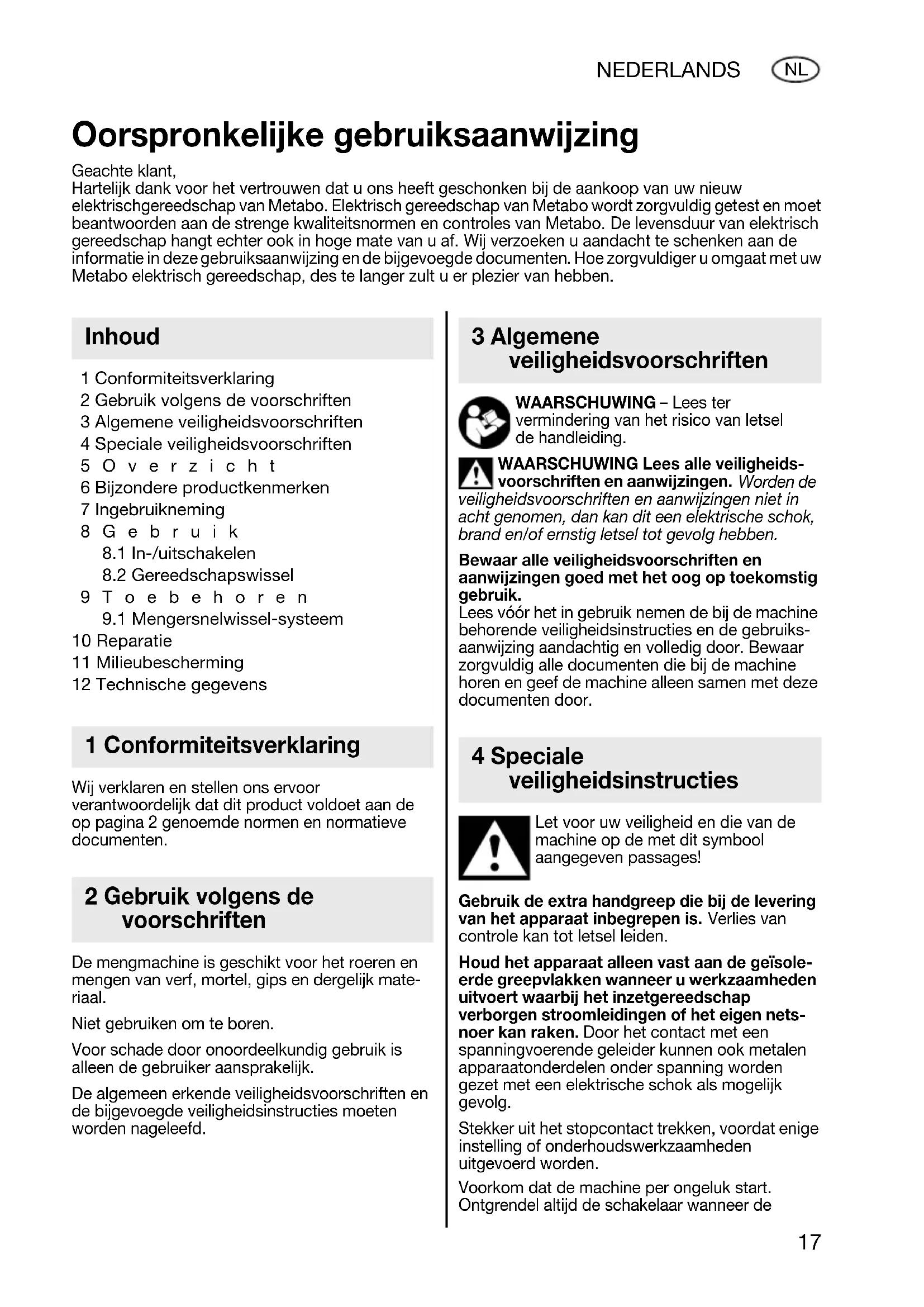 10 Reparatie 11 Milieubescherming 12 Technische gegevens Wij verklaren en stellen ons ervoor verantwoordelijk dat dit product voldoet aan de op pagina 2 genoemde normen en normatieve documenten. De mengmachine is geschikt voor het roeren en mengen van verf, mortel, gips en dergelijk mate- riaal. Niet gebruiken om te boren. Voor schade door onoordeelkundig gebruik is alleen de gebruiker aansprakelijk. De algemeen erkende veiligheidsvoorschriften en de bijgevoegde veiligheidsinstructies moeten worden nageleefd. WAARSCHUWING – Lees ter vermindering van het risico van letsel de handleiding. WAARSCHUWING Lees alle veiligheids- voorschriften en aanwijzingen. Worden de veiligheidsvoorschriften en aanwijzingen niet in acht genomen, dan kan dit een elektrische schok, brand en/of ernstig letsel tot gevolg hebben. Bewaar alle veiligheidsvoorschriften en aanwijzingen goed met het oog op toekomstig gebruik. Lees vóór het in gebruik nemen de bij de machine behorende veiligheidsinstructies en de gebruiks- aanwijzing aandachtig en volledig door. Bewaar zorgvuldig alle documenten die bij de machine horen en geef de machine alleen samen met deze documenten door. Let voor uw veiligheid en die van de machine op de met dit symbool aangegeven passages! Gebruik de extra handgreep die bij de levering van het apparaat inbegrepen is. Verlies van controle kan tot letsel leiden. Houd het apparaat alleen vast aan de geïsole- erde greepvlakken wanneer u werkzaamheden uitvoert waarbij het inzetgereedschap verborgen stroomleidingen of het eigen nets- noer kan raken. Door het contact met een spanningvoerende geleider kunnen ook metalen apparaatonderdelen onder spanning worden gezet met een elektrische schok als mogelijk gevolg. Stekker uit het stopcontact trekken, voordat enige instelling of onderhoudswerkzaamheden uitgevoerd worden. Voorkom dat de machine per ongeluk start. Ontgrendel altijd de schakelaar wanneer de Oorspronkelijke gebruiksaanwijzing Geachte klant, Hartelijk dank voor het vertrouwen dat u ons heeft geschonken bij de aankoop van uw nieuw elektrischgereedschap van Metabo. Elektrisch gereedschap van Metabo wordt zorgvuldig getest en moet beantwoorden aan de strenge kwaliteitsnormen en controles van Metabo. De levensduur van elektrisch gereedschap hangt echter ook in hoge mate van u af. Wij verzoeken u aandacht te schenken aan de informatie in deze gebruiksaanwijzing en de bijgevoegde documenten. Hoe zorgvuldiger u omgaat met uw Metabo elektrisch gereedschap, des te langer zult u er plezier van hebben. Inhoud 1 Conformiteitsverklaring 2 Gebruik volgens de voorschriften 3 Algemene veiligheidsvoorschriften 4 Speciale veiligheidsinstructies 17026753_0513 RWE 1100.book Seite 17 Dienstag, 7. Mai 2013 10:49 1018 NEDERLANDS