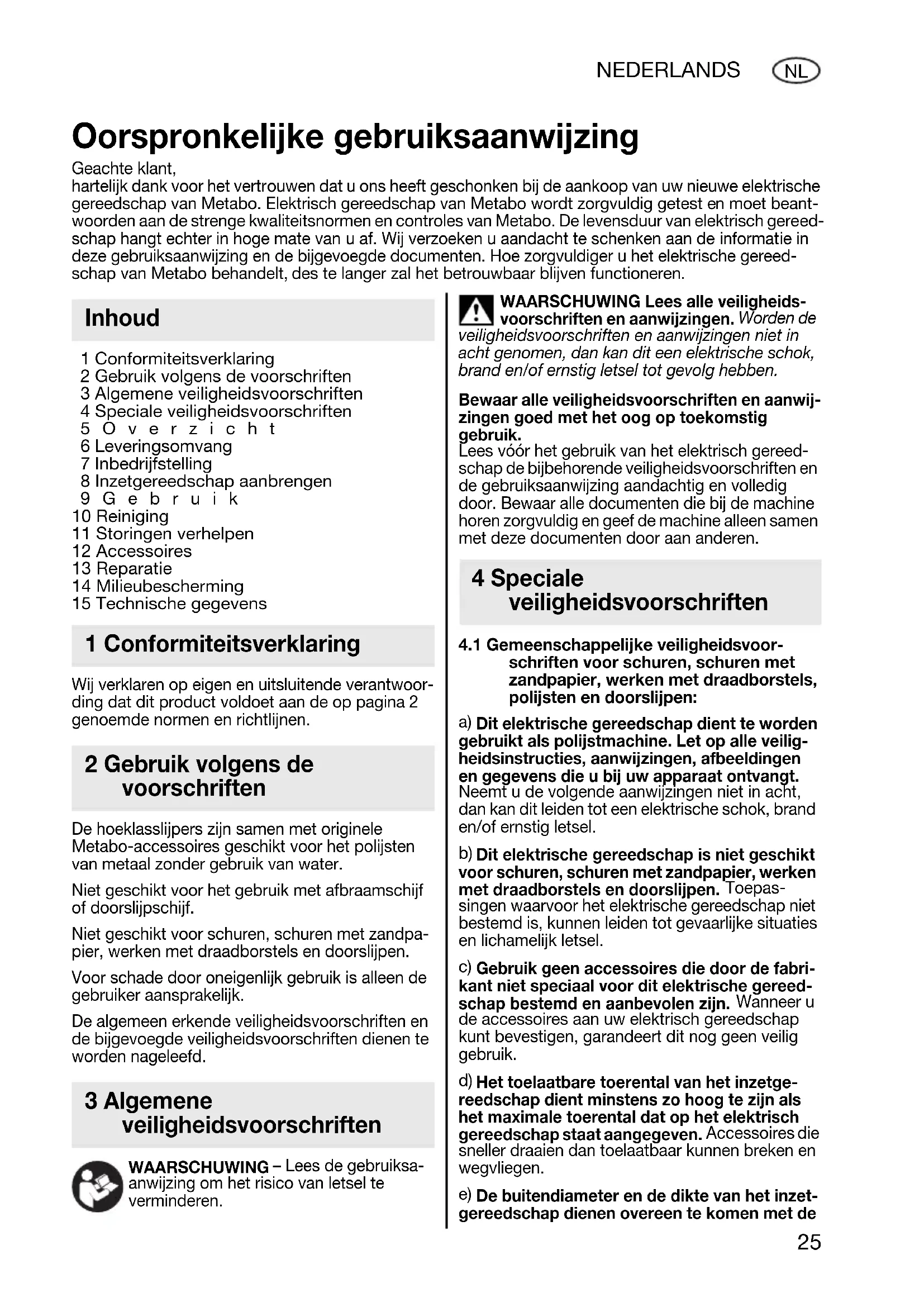 1 Conformiteitsverklaring 2 Gebruik volgens de voorschriften 3 Algemene veiligheidsvoorschriften 4 Speciale veiligheidsvoorschriften 5Overzicht 6 Leveringsomvang 7 Inbedrijfstelling 8 Inzetgereedschap aanbrengen 9Gebruik 10 Reiniging 11 Storingen verhelpen 12 Accessoires 13 Reparatie 14 Milieubescherming 15 Technische gegevens Wij verklaren op eigen en uitsluitende verantwoor- ding dat dit product voldoet aan de op pagina 2 genoemde normen en richtlijnen. De hoeklasslijpers zijn samen met originele Metabo-accessoires geschikt voor het polijsten van metaal zonder gebruik van water. Niet geschikt voor het gebruik met afbraamschijf of doorslijpschijf. Niet geschikt voor schuren, schuren met zandpa- pier, werken met draadborstels en doorslijpen. Voor schade door oneigenlijk gebruik is alleen de gebruiker aansprakelijk. De algemeen erkende veiligheidsvoorschriften en de bijgevoegde veiligheidsvoorschriften dienen te worden nageleefd. WAARSCHUWING – Lees de gebruiksa- anwijzing om het risico van letsel te verminderen. WAARSCHUWING Lees alle veiligheids- voorschriften en aanwijzingen. Worden de veiligheidsvoorschriften en aanwijzingen niet in acht genomen, dan kan dit een elektrische schok, brand en/of ernstig letsel tot gevolg hebben. Bewaar alle veiligheidsvoorschriften en aanwij- zingen goed met het oog op toekomstig gebruik. Lees vóór het gebruik van het elektrisch gereed- schap de bijbehorende veiligheidsvoorschriften en de gebruiksaanwijzing aandachtig en volledig door. Bewaar alle documenten die bij de machine horen zorgvuldig en geef de machine alleen samen met deze documenten door aan anderen.
