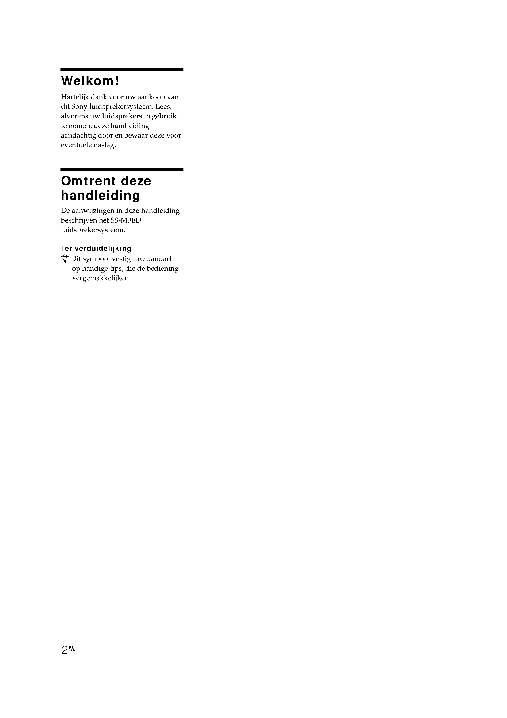 Welkom! Hartelijk dank voor uw aankoop van dit Sony luidsprekersysteem. Lees, alvorens uw luidsprekers in gebruik te nemen, deze handleiding aandachtig door en bewaar deze voor eventuele naslag. Omtrent deze handleiding De aanwijzingen in deze handleiding beschrijven het SS-M9ED luidsprekersysteem. Ter verduidelijking z Dit symbool vestigt uw aandacht op handige tips, die de bediening vergemakkelijken.3