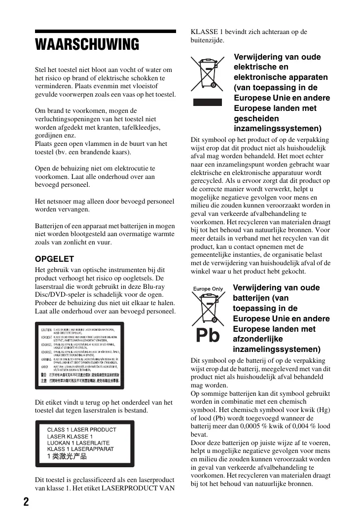 WAARSCHUWING Stel het toestel niet bloot aan vocht of water om het risico op brand of elektrische schokken te verminderen. Plaats evenmin met vloeistof gevulde voorwerpen zoals een vaas op het toestel. Om brand te voorkomen, mogen de verluchtingsopeningen van het toestel niet worden afgedekt met kranten, tafelkleedjes, gordijnen enz. Plaats geen open vlammen in de buurt van het toestel (bv. een brandende kaars). Open de behuizing niet om elektrocutie te voorkomen. Laat alle onderhoud over aan bevoegd personeel. Het netsnoer mag alleen door bevoegd personeel worden vervangen. Batterijen of een apparaat met batterijen in mogen niet worden blootgesteld aan overmatige warmte zoals van zonlicht en vuur. OPGELET Het gebruik van optische instrumenten bij dit product verhoogt het risico op oogletsels. De laserstraal die wordt gebruikt in deze Blu-ray Disc/DVD-speler is schadelijk voor de ogen. Probeer de behuizing dus niet uit elkaar te halen. Laat alle onderhoud over aan bevoegd personeel. Dit etiket vindt u terug op het onderdeel van het toestel dat tegen laserstralen is bestand. Dit toestel is geclassificeerd als een laserproduct van klasse 1. Het etiket LASERPRODUCT VAN
