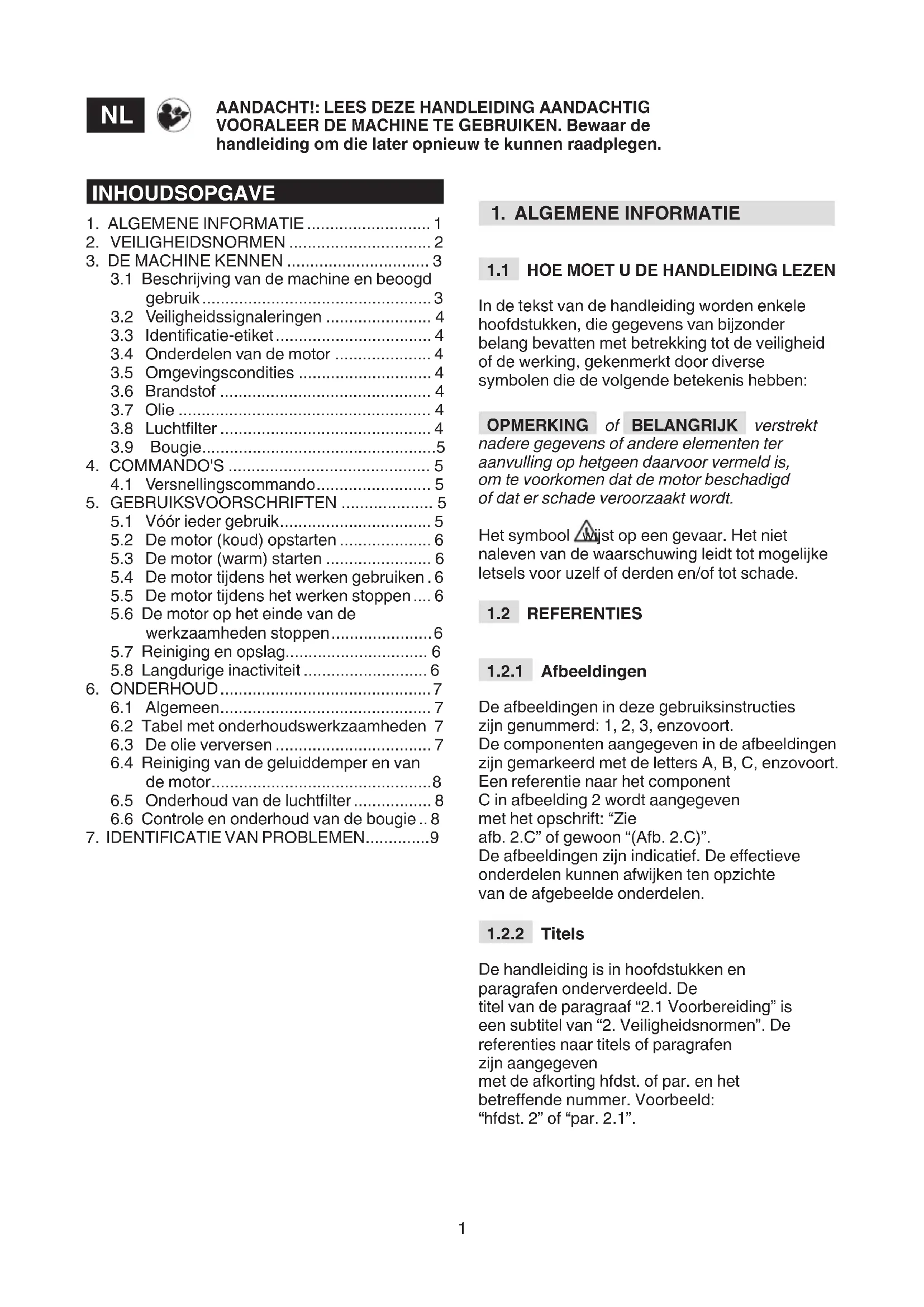 Deze machine is een explosiemotor. De motor is een toestel waarvan de prestaties, normale werking en levensduur door vele factoren worden bepaald; sommige factoren zijn externe factoren, andere zijn strikt verbonden met de kwaliteit van de gebruikte producten en met de regelmaat van het onderhoud. Hierna wordt bijkomende informatie verstrekt, aan de hand waarvan een bewuster gebruik van uw machine kan worden gemaakt. Ieder ander gebruik dat afwijkt van bovenstaande toepassingen, kan gevaarlijk zijn en schade voor personen en/of voorwerpen veroorzaken. BELANGRIJK Wanneer de machine oneigenlijk wordt gebruikt, vervalt de garantie en wijst de constructeur alle verantwoordelijkheid af; alle onkosten voor eigen schade of letsels of aan derden worden bijgevolg op de gebruiker verhaald.