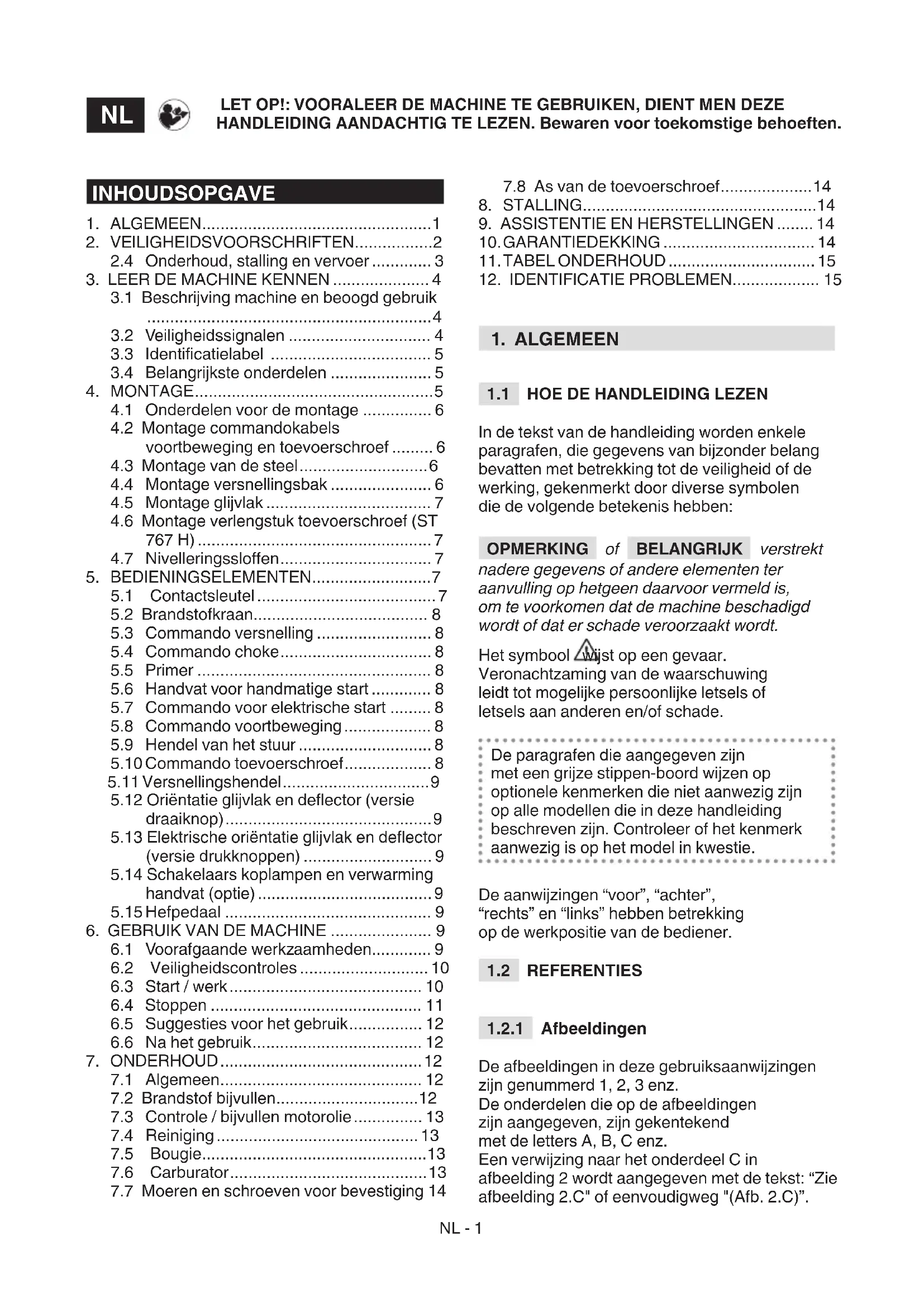 De handleiding is onderverdeeld in hoofdstukken en paragrafen. De titel van de paragraaf “2.1 Training” is een ondertitel van “2. Veiligheidsvoorschriften". De verwijzingen naar titels of paragrafen zijn aangegeven met de afkorting hfdst. of par. en het desbetreend nummer. Voorbeeld: “hfdst. 2” of “par. 2.1”.