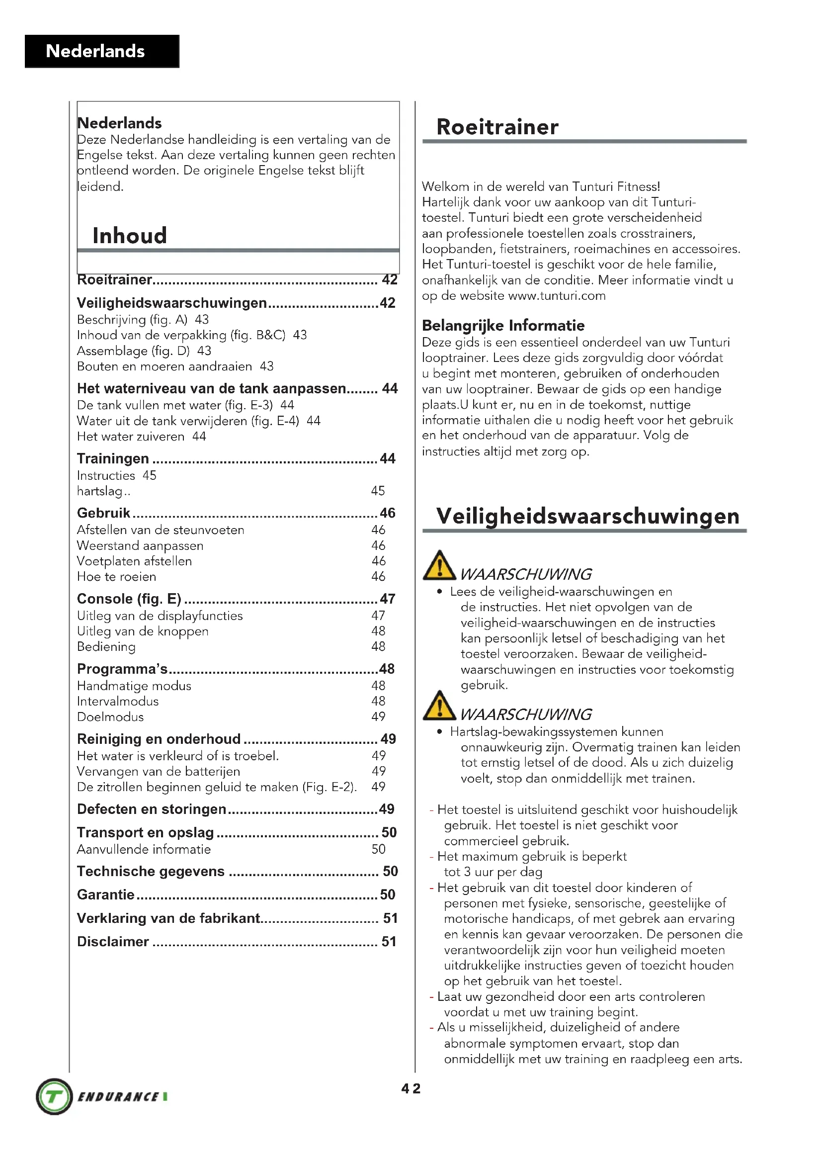 - Hartslag-bewakingssystemen kunnen onnauwkeurig zijn. Overmatig trainen kan leiden tot ernstig letsel of de dood. Als u zich duizelig voelt, stop dan onmiddellijk met trainen. - Het toestel is uitsluitend geschikt voor huishoudelijk gebruik. Het toestel is niet geschikt voor commercieel gebruik. - Het maximum gebruik is beperkt tot 3 uur per dag - Het gebruik van dit toestel door kinderen of personen met fysieke, sensorische, geestelijke of motorische handicaps, of met gebrek aan ervaring en kennis kan gevaar veroorzaken. De personen die verantwoordelijk zijn voor hun veiligheid moeten uitdrukkelijke instructies geven of toezicht houden op het gebruik van het toestel. - Laat uw gezondheid door een arts controleren voordat u met uw training begint. - Als u misselijkheid, duizeligheid of andere abnormale symptomen ervaart, stop dan onmiddellijk met uw training en raadpleeg een arts. Roeitrainer......................................................... 42 Veiligheidswaarschuwingen ............................ 42 Beschrijving (g. A) 43Inhoud van de verpakking (g. B&C) 43Assemblage (g. D) 43Bouten en moeren aandraaien 43 Het waterniveau van de tank aanpassen........ 44 De tank vullen met water (g. E-3) 44Water uit de tank verwijderen (g. E-4) 44Het water zuiveren 44 Trainingen ......................................................... 44 Instructies 45hartslag .. 45 Gebruik .............................................................. 46 Afstellen van de steunvoeten 46Weerstand aanpassen 46Voetplaten afstellen 46Hoe te roeien 46 Console (g. E) ................................................. 47 Uitleg van de displayfuncties 47Uitleg van de knoppen 48Bediening 48 Programma’s ..................................................... 48 Handmatige modus 48Intervalmodus 48Doelmodus 49 Reiniging en onderhoud .................................. 49 Het water is verkleurd of is troebel. 49Vervangen van de batterijen 49De zitrollen beginnen geluid te maken (Fig. E-2). 49 Defecten en storingen ...................................... 49 Transport en opslag ......................................... 50 Aanvullende informatie 50 Technische gegevens ...................................... 50 Garantie ............................................................. 50 Verklaring van de fabrikant.............................. 51 Disclaimer ......................................................... 51 Nederlands Deze Nederlandse handleiding is een vertaling van de Engelse tekst. Aan deze vertaling kunnen geen rechten ontleend worden. De originele Engelse tekst blijft leidend. Inhoud43 Nederlands - Om spierpijn en te zware belasting te voorkomen, moet u elke training beginnen met een warming-up en eindigen met een cooling-down. Vergeet niet om uw spieren te strekken aan het einde van de training. - Het toestel is uitsluitend geschikt voor gebruik binnenshuis. Het toestel is niet geschikt voor gebruik buitenshuis. - Gebruik het toestel alleen in een omgeving met voldoende ventilatie. Gebruik het toestel niet in een tochtige omgeving om geen kou te vatten. - Gebruik het toestel alleen in een omgeving met een omgevingstemperatuur tussen 10 °C en 35 °C. Berg het toestel alleen op bij een omgevingstemperatuur tussen 5 °C en 45 °C. - Gebruik het toestel niet in een vochtige omgeving. Berg het toestel niet op in een vochtige omgeving. De luchtvochtigheid mag nooit meer zijn dan 80%. - Gebruik het toestel alleen voor het doel waarvoor het gemaakt is. Gebruik het toestel niet voor andere doelstellingen dan beschreven in de handleiding. - Gebruik het toestel niet als een onderdeel is beschadigd of niet goed werkt. Raadpleeg uw dealer als een onderdeel is beschadigd of niet goed werkt. - Houd uw handen, voeten en andere lichaamsdelen uit de buurt van de bewegende delen. - Houd uw haar uit de buurt van de bewegende delen. - Draag geschikte kleding en schoenen. - Houd kleding, sieraden en andere voorwerpen uit de buurt van de bewegende delen. - Zorg ervoor dat het toestel slechts door één persoon tegelijk wordt gebruikt. Het toestel mag niet worden gebruikt door personen die meer dan 135 kg (300 lbs) wegen. - Maak het toestel niet open zonder eerst uw dealer te raadplegen. Beschrijving (fig. A) Uw roeitrainer is een stationair fitnesstoestel dat wordt gebruikt voor het nabootsen van roeien zonder dat de gewrichten te veel belast worden. Inhoud van de verpakking (fig. B&C) - De verpakking bevat de onderdelen zoals aangegeven in fig. B. - De verpakking bevat de bevestigingsmiddelen zoals aangegeven in fig. C. Raadpleeg het gedeelte “Beschrijving”. LET OP