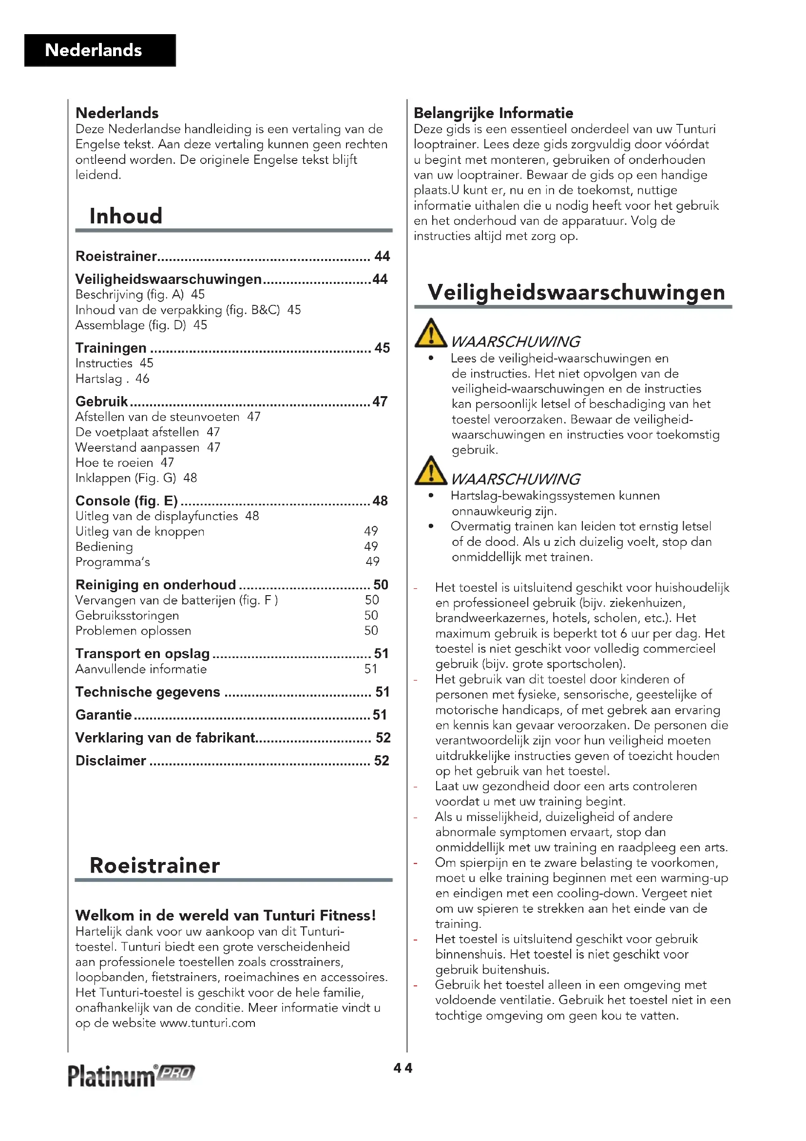 - Disclaimer Belangrijke Informatie Deze gids is een essentieel onderdeel van uw Tunturi looptrainer. Lees deze gids zorgvuldig door vóórdat u begint met monteren, gebruiken of onderhouden van uw looptrainer. Bewaar de gids op een handige plaats.U kunt er, nu en in de toekomst, nuttige informatie uithalen die u nodig heeft voor het gebruik en het onderhoud van de apparatuur. Volg de instructies altijd met zorg op. Veiligheidswaarschuwingen WAARSCHUWING p. 52