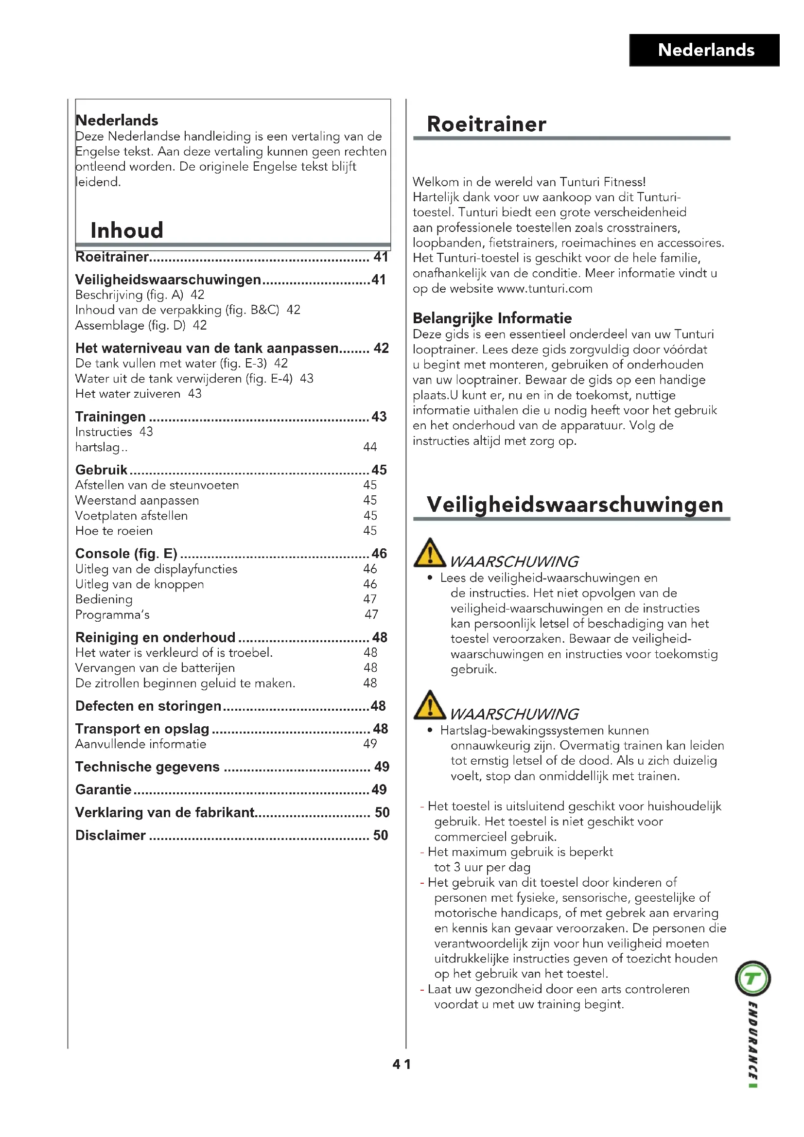 - Hartslag-bewakingssystemen kunnen onnauwkeurig zijn. Overmatig trainen kan leiden tot ernstig letsel of de dood. Als u zich duizelig voelt, stop dan onmiddellijk met trainen. - Het toestel is uitsluitend geschikt voor huishoudelijk gebruik. Het toestel is niet geschikt voor commercieel gebruik. - Het maximum gebruik is beperkt tot 3 uur per dag - Het gebruik van dit toestel door kinderen of personen met fysieke, sensorische, geestelijke of motorische handicaps, of met gebrek aan ervaring en kennis kan gevaar veroorzaken. De personen die verantwoordelijk zijn voor hun veiligheid moeten uitdrukkelijke instructies geven of toezicht houden op het gebruik van het toestel. - Laat uw gezondheid door een arts controleren voordat u met uw training begint. Roeitrainer......................................................... 41 Veiligheidswaarschuwingen ............................ 41 Beschrijving (g. A) 42Inhoud van de verpakking (g. B&C) 42Assemblage (g. D) 42 Het waterniveau van de tank aanpassen........ 42 De tank vullen met water (g. E-3) 42Water uit de tank verwijderen (g. E-4) 43Het water zuiveren 43 Trainingen ......................................................... 43 Instructies 43 hartslag . . 44 Gebruik .............................................................. 45 Afstellen van de steunvoeten 45Weerstand aanpassen 45Voetplaten afstellen 45Hoe te roeien 45 Console (g. E) ................................................. 46 Uitleg van de displayfuncties 46Uitleg van de knoppen 46Bediening 47Programma’s 47 Reiniging en onderhoud .................................. 48 Het water is verkleurd of is troebel. 48Vervangen van de batterijen 48De zitrollen beginnen geluid te maken. 48 Defecten en storingen ...................................... 48 Transport en opslag ......................................... 48 Aanvullende informatie 49 Technische gegevens ...................................... 49 Garantie ............................................................. 49 Verklaring van de fabrikant.............................. 50 Disclaimer ......................................................... 50 Nederlands Deze Nederlandse handleiding is een vertaling van de Engelse tekst. Aan deze vertaling kunnen geen rechten ontleend worden. De originele Engelse tekst blijft leidend. Inhoud42 Nederlands - Als u misselijkheid, duizeligheid of andere abnormale symptomen ervaart, stop dan onmiddellijk met uw training en raadpleeg een arts. - Om spierpijn en te zware belasting te voorkomen, moet u elke training beginnen met een warming-up en eindigen met een cooling-down. Vergeet niet om uw spieren te strekken aan het einde van de training. - Het toestel is uitsluitend geschikt voor gebruik binnenshuis. Het toestel is niet geschikt voor gebruik buitenshuis. - Gebruik het toestel alleen in een omgeving met voldoende ventilatie. Gebruik het toestel niet in een tochtige omgeving om geen kou te vatten. - Gebruik het toestel alleen in een omgeving met een omgevingstemperatuur tussen 10 °C en 35 °C. Berg het toestel alleen op bij een omgevingstemperatuur tussen 5 °C en 45 °C. - Gebruik het toestel niet in een vochtige omgeving. Berg het toestel niet op in een vochtige omgeving. De luchtvochtigheid mag nooit meer zijn dan 80%. - Gebruik het toestel alleen voor het doel waarvoor het gemaakt is. Gebruik het toestel niet voor andere doelstellingen dan beschreven in de handleiding. - Gebruik het toestel niet als een onderdeel is beschadigd of niet goed werkt. Raadpleeg uw dealer als een onderdeel is beschadigd of niet goed werkt. - Houd uw handen, voeten en andere lichaamsdelen uit de buurt van de bewegende delen. - Houd uw haar uit de buurt van de bewegende delen. - Draag geschikte kleding en schoenen. - Houd kleding, sieraden en andere voorwerpen uit de buurt van de bewegende delen. - Zorg ervoor dat het toestel slechts door één persoon tegelijk wordt gebruikt. Het toestel mag niet worden gebruikt door personen die meer dan 135 kg (300 lbs) wegen. - Maak het toestel niet open zonder eerst uw dealer te raadplegen. Beschrijving (fig. A) Uw roeitrainer is een stationair fitnesstoestel dat wordt gebruikt voor het nabootsen van roeien zonder dat de gewrichten te veel belast worden. Inhoud van de verpakking (fig. B&C) - De verpakking bevat de onderdelen zoals aangegeven in fig. B. - De verpakking bevat de bevestigingsmiddelen zoals aangegeven in fig. C. Raadpleeg het gedeelte “Beschrijving”. LET OP