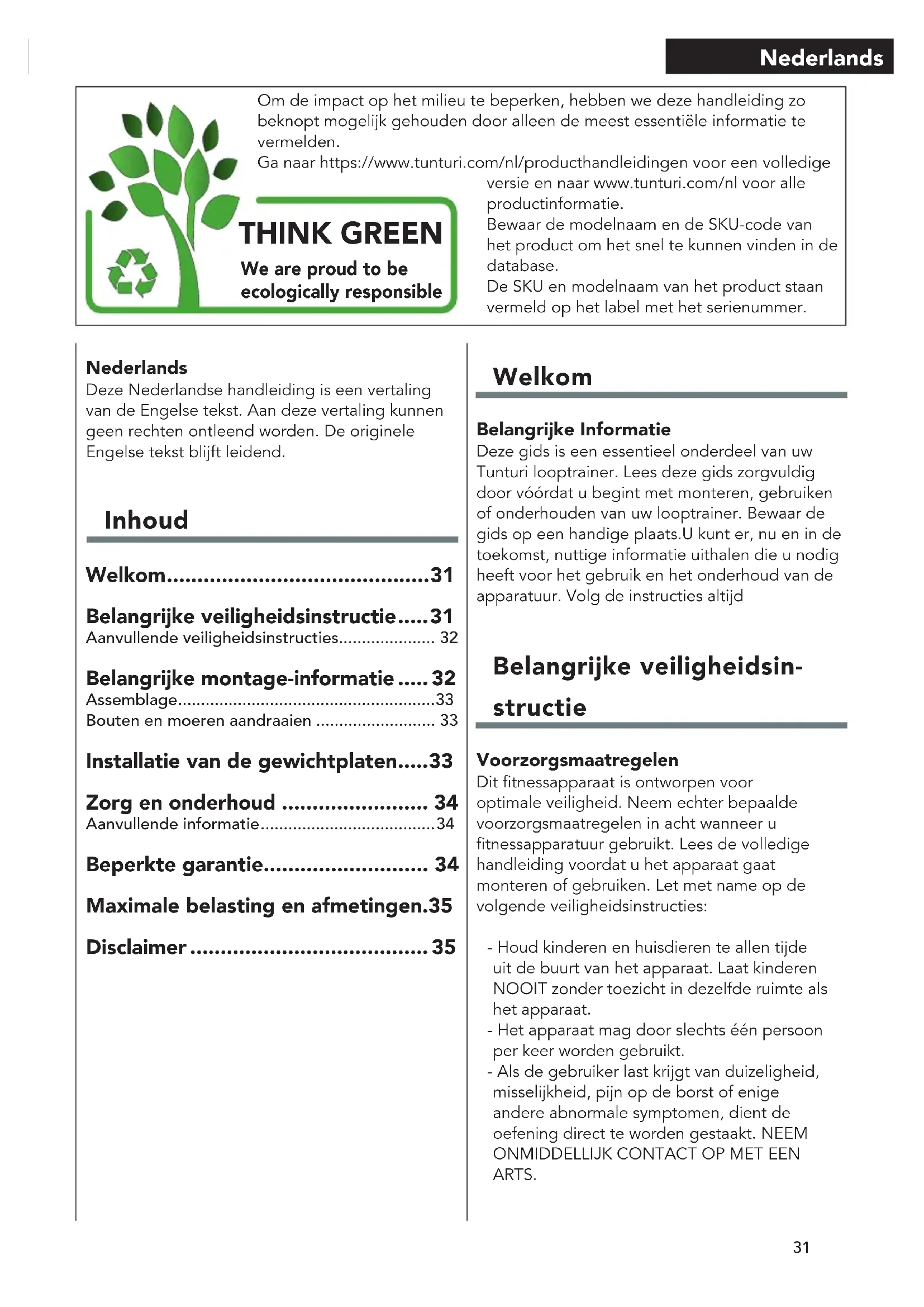 Nederlands Zorg en onderhoud - Smeer bewegende onderdelen regelmatig met wd-40 of lichte olie. - Inspecteer en draai alle onderdelen aan voordat u het apparaat gebruikt. - Maak het apparaat schoon met een doek bevochtigd met een mild, niet-schurend schoonmaakmiddel. Gebruik geen oplosmiddelen. - Controleer het apparaat regelmatig op tekenen van slijtage of beschadiging. - Vervang defecte componenten direct en/ of stel het apparaat buiten gebruik tot het is gerepareerd. - Indien het apparaat niet regelmatig wordt gecontroleerd, kan het gebruik ervan onveilig worden. Aanvullende informatie Afvoeren van verpakkingsmateriaal Overheids-richtlijnen geven aan dat we de hoeveelheid afvalmateriaal afgevoerd naar stortplaatsen moeten verminderen. Daarom vragen we u al het afvalmateriaal op verantwoordelijke wijze af te voeren naar openbare recycling-centra. Verwijdering aan het eind van de levensduur We hopen dat u jarenlang plezier hebt van uw fitnessapparaat. Er komt echter een moment waarop het fitnessapparaat het eind van de bruikbare levensduur heeft bereikt. Onder de Europese AEEA-wetgeving bent u verantwoordelijk voor het op de juiste wijze afvoeren van uw fitnessapparaat naar een erkend openbaar inzamelpunt. Beperkte garantie Tunturi New Fitness garandeert dat dit product, bij normaal gebruik en onderhoud, vrij is van defecten in materiaal en fabricage voor een periode van twee jaar op het frame en één jaar op alle andere onderdelen en componenten na de datum van aankoop. Deze garantie geldt alleen voor de oorspronkelijke koper en geldt alleen voor thuisgebruik. De aansprakelijkheid van Tunturi New Fitness onder deze garantie is beperkt tot het vervangen van beschadigde of defecte onderdelen, zulks uitsluitend ter beoordeling door Tunturi New Fitness. Alle retourzendingen moeten vooraf worden geautoriseerd door Tunturi New Fitness. Deze garantie is niet toepasbaar voor een product of schade aan een product ten gevolge van het transport, misbruik, verkeerd of oneigenlijk gebruik, eigen reparaties door de koper of voor producten gebruikt voor commerciële doeleinden of verhuurdoeleinden. Enkel de bovengenoemde specifieke garanties zijn goedgekeurd door Tunturi New Fitness. Tunturi NewFitness is niet verantwoordelijk of aansprakelijk voor bijzondere, indirecte of gevolgschade die voortkomt uit of verband houdt met het gebruik of de prestaties van het product of andere schade met betrekking tot verlies van eigendom of kapitaal, winstderving of inkomstenverlies, gebruiks- of genotsderving, kosten voor verwijdering, installatie of andere gevolgschade van welke aard dan ook. Bovenbedoelde garantie komt in de plaats van alle overige garanties. Het bereik en de duur van alle impliciete garanties van verkoopbaarheid en geschiktheid voor een bepaald doel zijn beperkt tot de voorwaarden beschreven in dit document. Uw wettelijke rechten worden niet beïnvloed door deze voorwaarden.35 Nederlands Maximale belasting en af- metingen (Fig W#1) - Maximum belasting gewicht : 135 kg. - Afmetingen na montage: 189,5 x 184 x 208,5 cm. 33 cm 130 cm 50 cm Disclaimer © 2020 Tunturi New Fitness BV Alle rechten voorbehouden. - Het product en de handleiding zijn aan veranderingen onderhevig. - Specificaties kunnen zonder verdere kennisgeving worden veranderd. - Raadpleeg onze website voor de meest recente versie van de gebruikershandleiding.36 Per ridurre l’impatto sull’ambiente, abbiamo reso questo manuale di istruzioni il più conciso possibile fornendo solo le informazioni più essenziali. Visita http://manuals.tunturi.com per ottenere una versione completa e www.tunturi.com per tutte le informazioni correlate ai prodotti.Conserva il nome del modello di prodotto e il codice SKU per vericarne brevemente la corrispondenza durante la ricerca nel database.Lo SKU e il nome del modello del prodotto si trovano sulla nostra etichetta su cui è riportato il numero di serie. THINK GREEN We are proud to be ecologically responsible Italiano ItalianoQuesto manuale in lingua italiana è una traduzione dalla versione originale del manuale in lingua Inglese. Non si possono trarre diritti di traduzione dalla presente traduzione. Indice Benvenuti Importanti istruzioni di sicurezzaQuesto libretto di istruzioni è una parte essenziale della tua attrezzatura da ginnastica. Leggi con attenzione quanto scritto in questa guida, prima del montaggio dei pezzi e prima di fare uso dell’attrezzo o di effettuarne qualunque manutenzione. Ti raccomandiamo pure di conservare la presente guida in un luogo sicuro e a portata di mano; essa ti fornirà, adesso e nel futuro, tutte le istruzioni necessarie all’uso e alla manutenzione della tua attrezzatura da ginnastica. Tali istruzioni devi seguirle sempre con molta attenzione! Avviso importante sulla si- curezza Questa attrezzatura per l’esercizio fisico è stata progettata per garantire una sicurezza ottimale. Tuttavia, è necessario applicare alcune precauzioni ogni volta che si utilizza un’attrezzatura per l’esercizio fisico. Assicurarsi di leggere interamente il manuale prima di assemblare o utilizzare l’attrezzatura. In particolare, tenere presente le seguenti precauzioni di sicurezza: - Mantenere i bambini e gli animali sempre lontani dall’attrezzatura. NON lasciare i bambini senza sorveglianza nella stanza in cui è presente l’attrezzatura. - L’attrezzatura deve essere utilizzata da una sola persona alla volta. Benvenuti 36 Avviso importante sulla sicurezza 36 Istruzioni di sicurezza aggiuntive 37 Informazioni importanti sull’assemblaggio 37 Assemblaggio 38Serrare dadi e bulloni 38 Installazione delle piastre pesi 38 Cura e manutenzione 39 Informazioni aggiuntive 39 Garanzia limitata 39 Capacità peso e dimensioni 39 Dichiarazione di non responsabilità 4037 Italiano - Se l’utente presenta stordimenti, nausea, dolori al petto o qualsiasi altro sintomo anomalo, TERMINARE l’allenamento immediatamente.