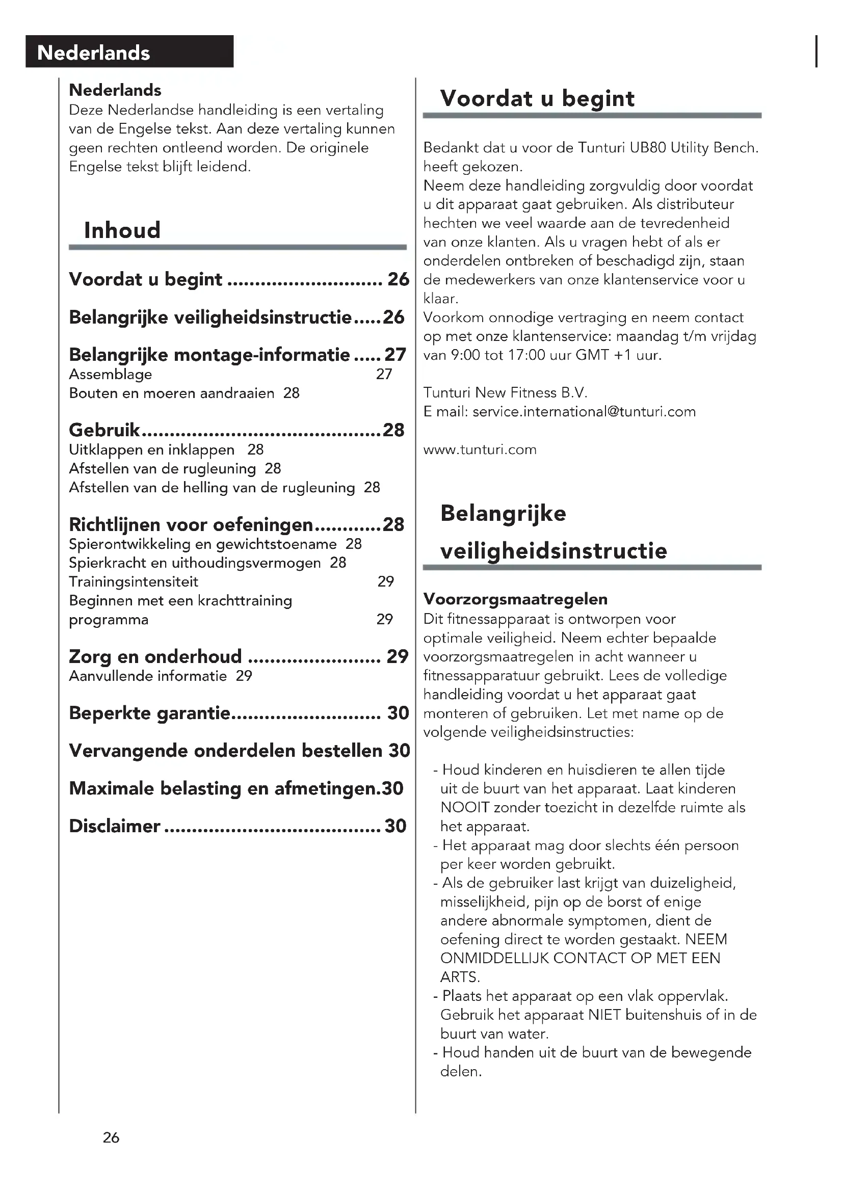 - Vervangende onderdelen bestellen 30 Maximale belasting en afmetingen . 30 Disclaimer Nederlands - Draag tijdens de training altijd geschikte sportkleding. Draag GEEN lange kamerjas of andere kleding die vast kan komen te zitten. Draag tijdens de oefeningen hardloop- of aerobicschoenen. - Dit apparaat is alleen bedoeld voor het gebruik zoals beschreven in deze handleiding. Gebruik alleen accessoires aanbevolen door de fabrikant. - Plaats geen scherpe objecten in de buurt van het apparaat. - Gehandicapte of minder valide personen mogen het apparaat alleen gebruiken onder toezicht van een gekwalificeerde persoon of arts. - Voer voordat u het apparaat gaat gebruiken strekoefeningen uit als warming-up. - Gebruik het apparaat niet als het niet naar behoren functioneert. - Tijdens oefeningen wordt de aanwezigheid van een spotter aangeraden. - Steek de gewichtselector-pen niet in de platen wanneer de gewichtenkolom of de bovenste plaat in de hoogste positie staat. - Controleer of de gewichtselector-pen helemaal in de gewichtplaten is gestoken. - Gebruik nooit dumbbells of andere accessoires om de weerstand te verhogen. Gebruik alleen gewichtplaten geleverd door de fabrikant. - Dit apparaat is ontworpen en bedoeld voor thuisgebruik en niet voor commerciële doeleinden. Waarschuwing: Raadpleeg eerst uw arts voordat u aan een Trainingsprogramma begint. Dit is met name belangrijk voor personen Ouder dan 35 of personen met bepaalde gezondheidsklachten. Lees alle Instructies voordat u fitnessapparatuur gebruikt. Tunturi New fitness bv is Niet aansprakelijk voor persoonlijk letsel of schade aan eigendommen Veroorzaakt door of ten gevolge van het gebruik van dit product. Bewaar deze instructies goed! Belangrijke montage- informatie Gereedschap benodigd voor het monteren van de bank: twee verstelbare steeksleutels en een set inbussleutels. ‼ LET OP p. 3027