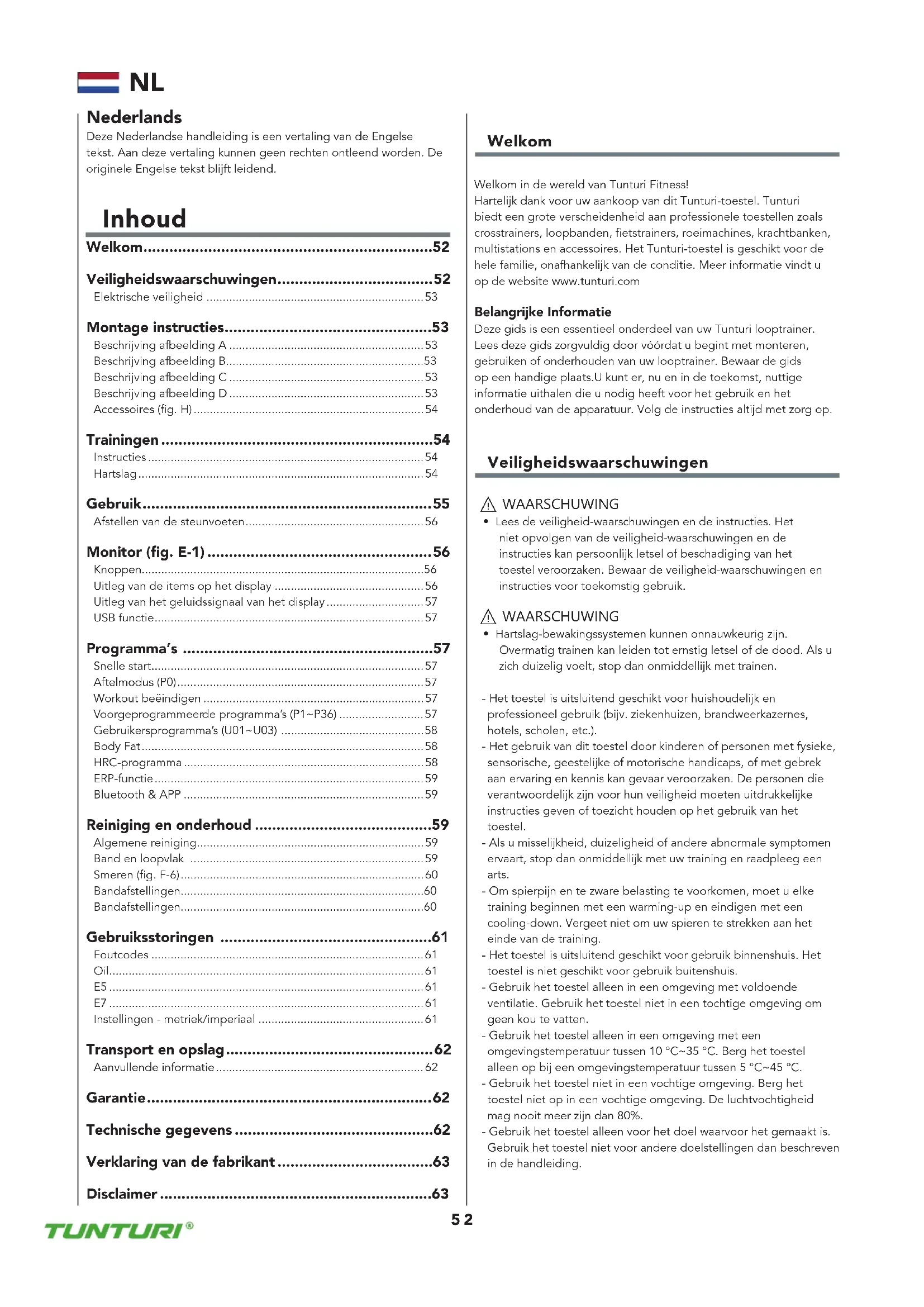 - Transport en opslag 62 Aanvullende informatie Garantie 62 Technische gegevens 62 Verklaring van de fabrikant 63 Disclaimer 63 Welkom Welkom in de wereld van Tunturi Fitness!Hartelijk dank voor uw aankoop van dit Tunturi-toestel. Tunturi biedt een grote verscheidenheid aan professionele toestellen zoals crosstrainers, loopbanden, fietstrainers, roeimachines, krachtbanken, multistations en accessoires. Het Tunturi-toestel is geschikt voor de hele familie, onafhankelijk van de conditie. Meer informatie vindt u op de website www.tunturi.comBelangrijke InformatieDeze gids is een essentieel onderdeel van uw Tunturi looptrainer. Lees deze gids zorgvuldig door vóórdat u begint met monteren, gebruiken of onderhouden van uw looptrainer. Bewaar de gids op een handige plaats.U kunt er, nu en in de toekomst, nuttige informatie uithalen die u nodig heeft voor het gebruik en het onderhoud van de apparatuur. Volg de instructies altijd met zorg op. Veiligheidswaarschuwingen ⚠ WAARSCHUWING p. 62