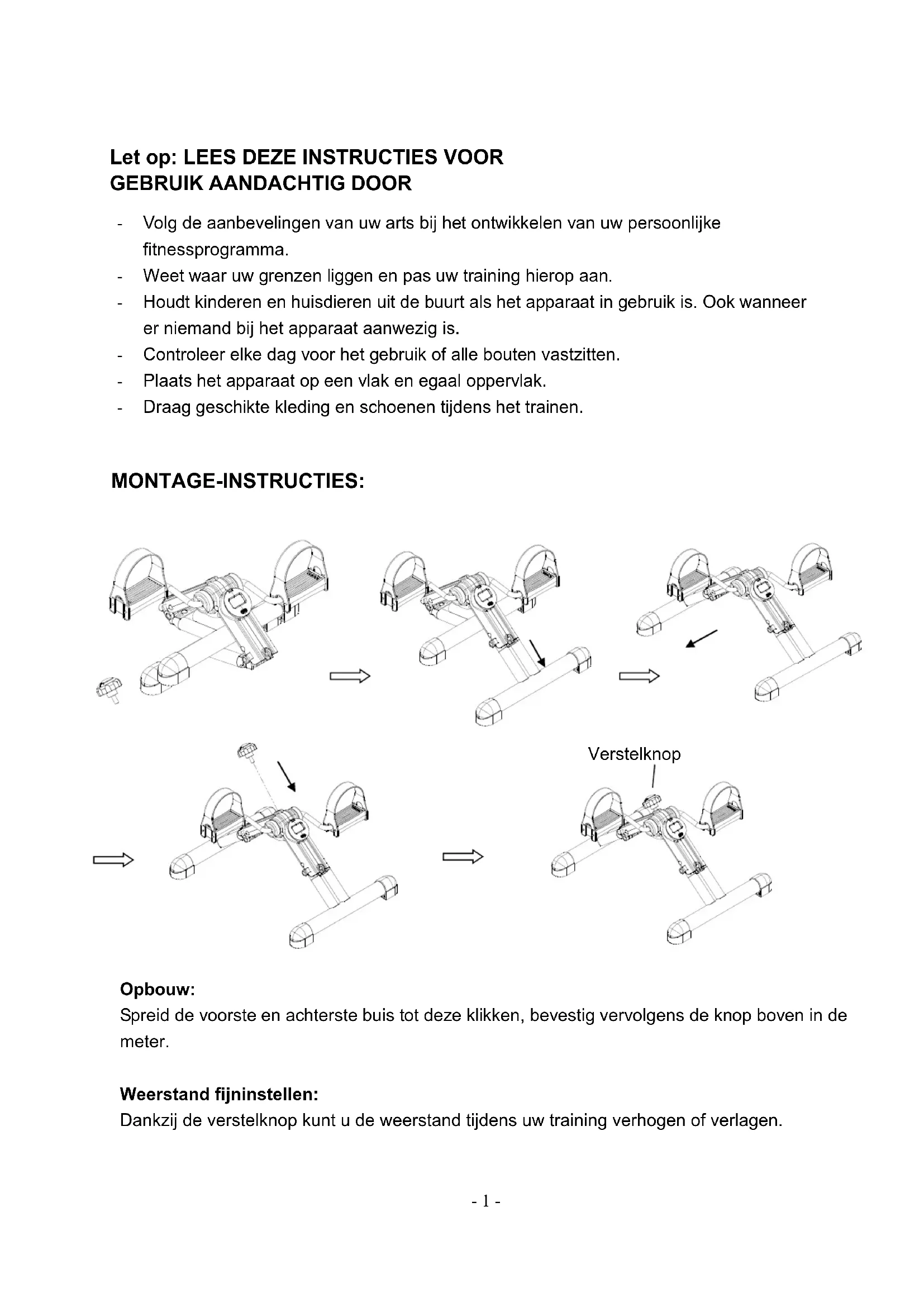 Verstelknop Opbouw: Spreid de voorste en achterste buis tot deze klikken, bevestig vervolgens de knop boven in de meter. Weerstand fijninstellen: Dankzij de verstelknop kunt u de weerstand tijdens uw training verhogen of verlagen. - 1 -BEDIENING & INSTRUCTIE VOOR COMPUTER: