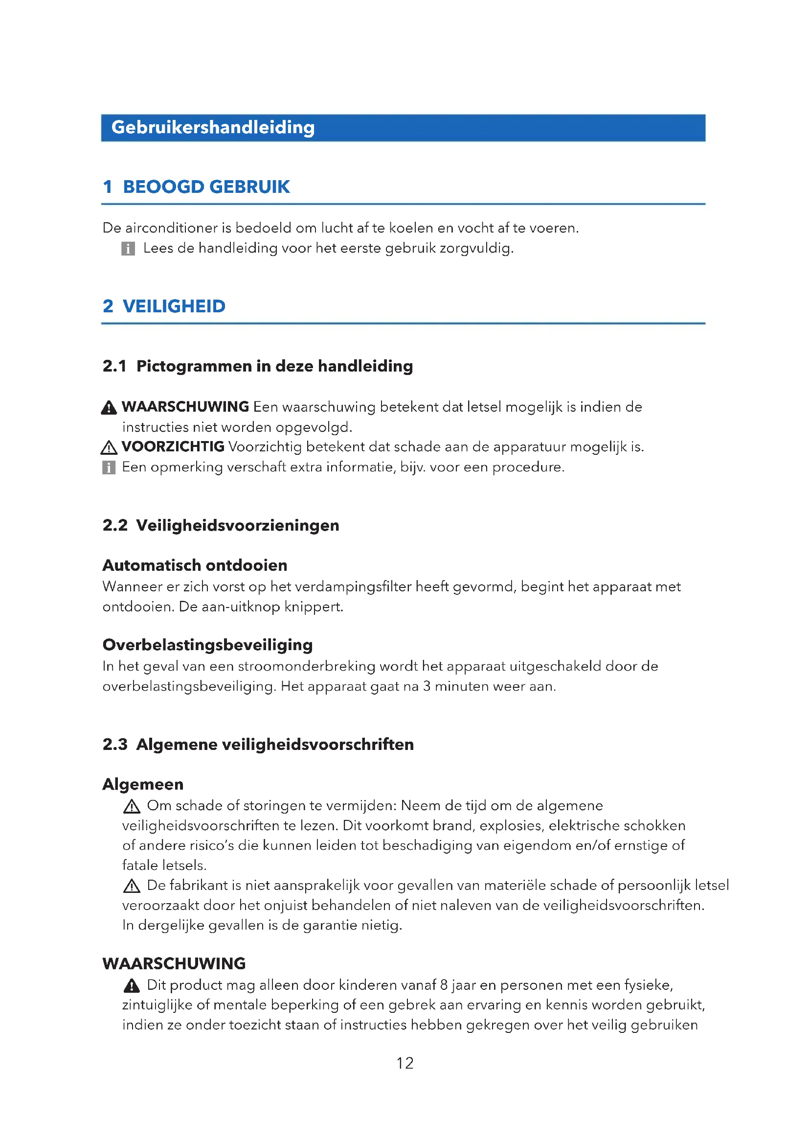 Automatisch ontdooien Wanneer er zich vorst op het verdampingsfilter heeft gevormd, begint het apparaat met ontdooien. De aan-uitknop knippert. Overbelastingsbeveiliging In het geval van een stroomonderbreking wordt het apparaat uitgeschakeld door de overbelastingsbeveiliging. Het apparaat gaat na 3 minuten weer aan.