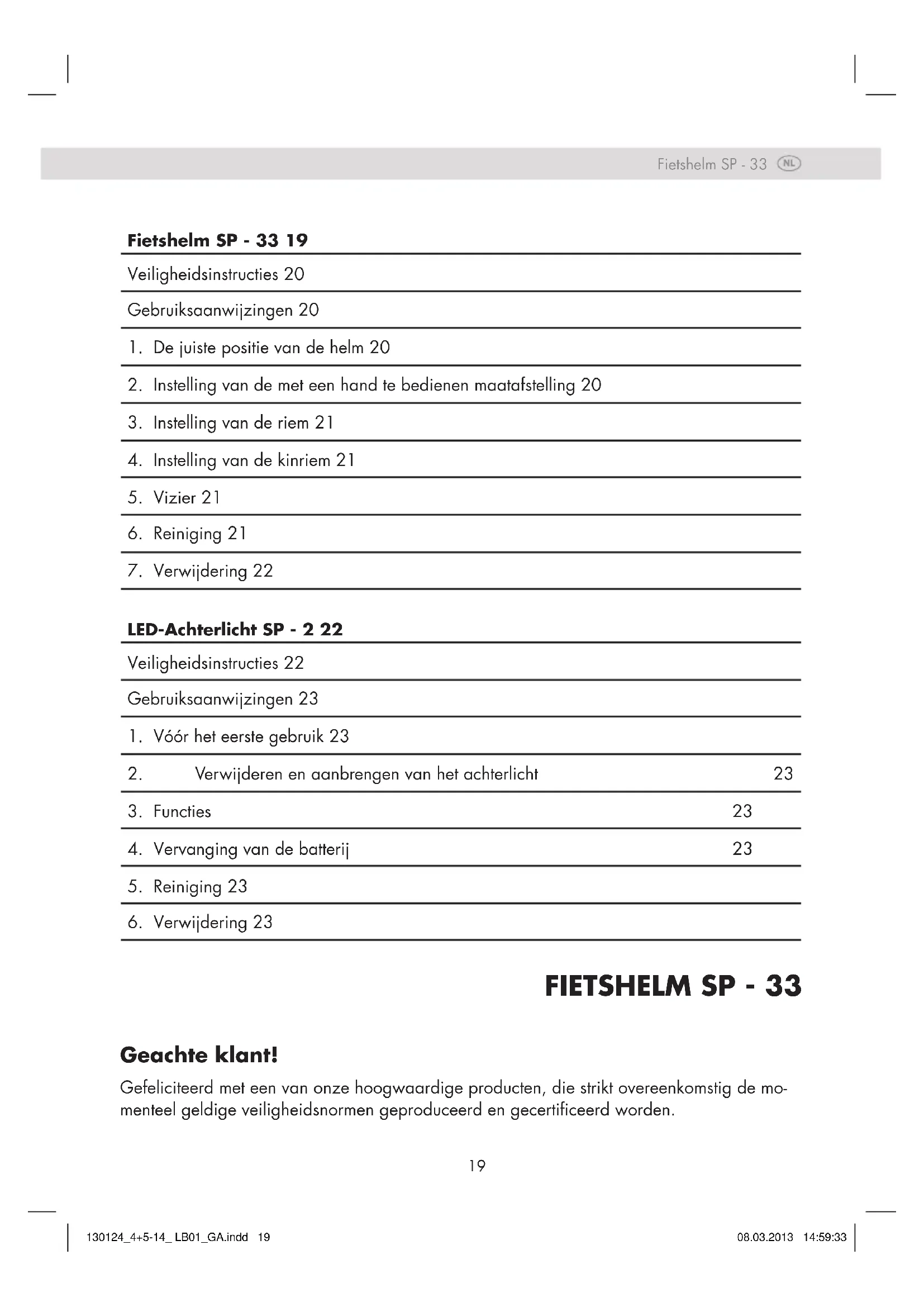 - Mocht de batterij lekken, vermijd dan contact met de huid. Dit leidt tot huidirritatie. LED-achterlicht SP-2 130124_4+5-14_ LB01_GA.indd 22 08.03.2013 14:59:3323
