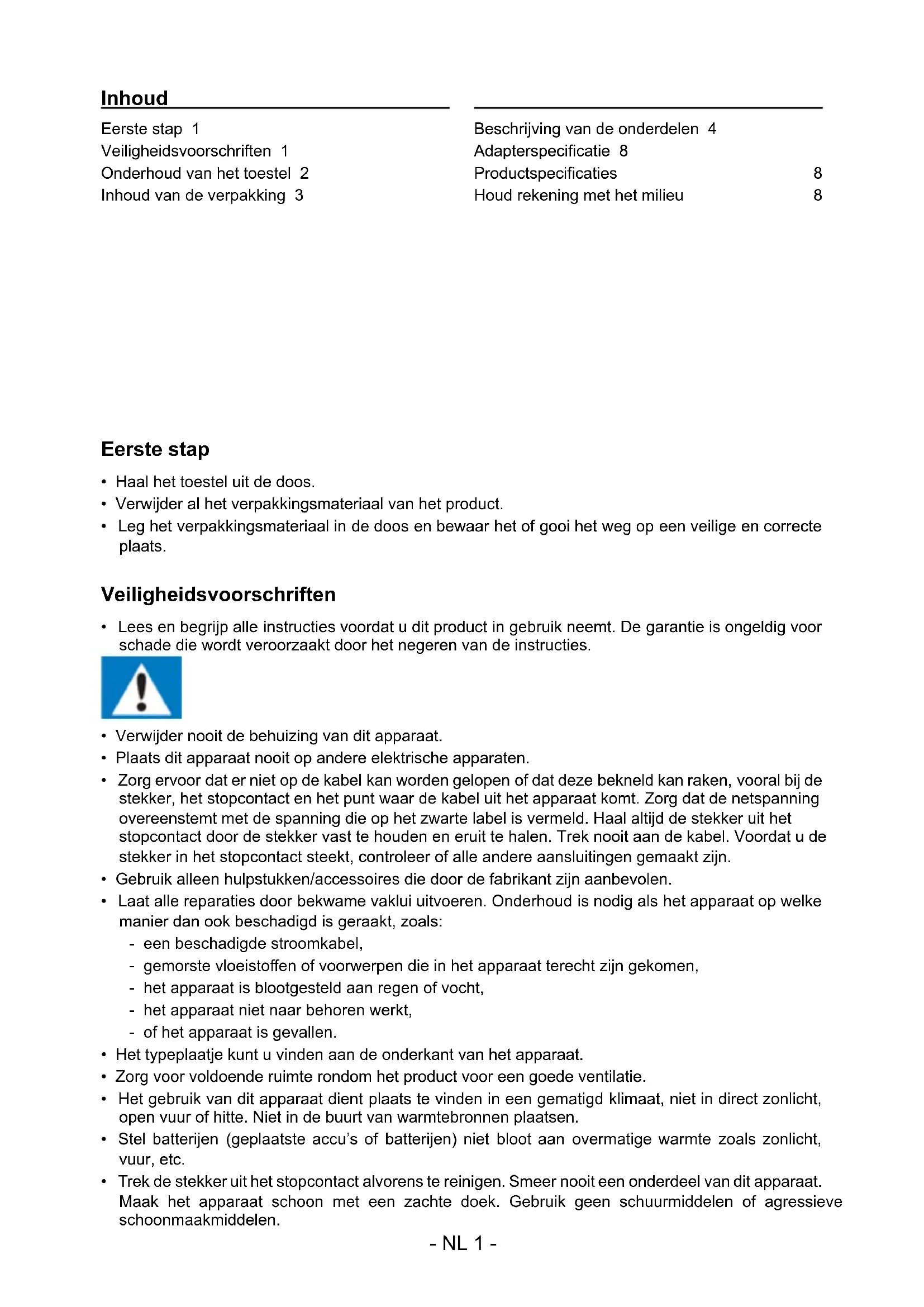 - Trek de stekker uit het stopcontact alvorens te reinigen. Smeer nooit een onderdeel van dit apparaat. Maak het apparaat schoon met een zachte doek. Gebruik geen schuurmiddelen of agressieve schoonmaakmiddelen. Inhoud Eerste stap 1 Veiligheidsvoorschriften 1 Onderhoud van het toestel 2 Inhoud van de verpakking 3 Beschrijving van de onderdelen 4 Adapterspecicatie 8 Productspecicaties 8 Houd rekening met het milieu 8- NL 2 -