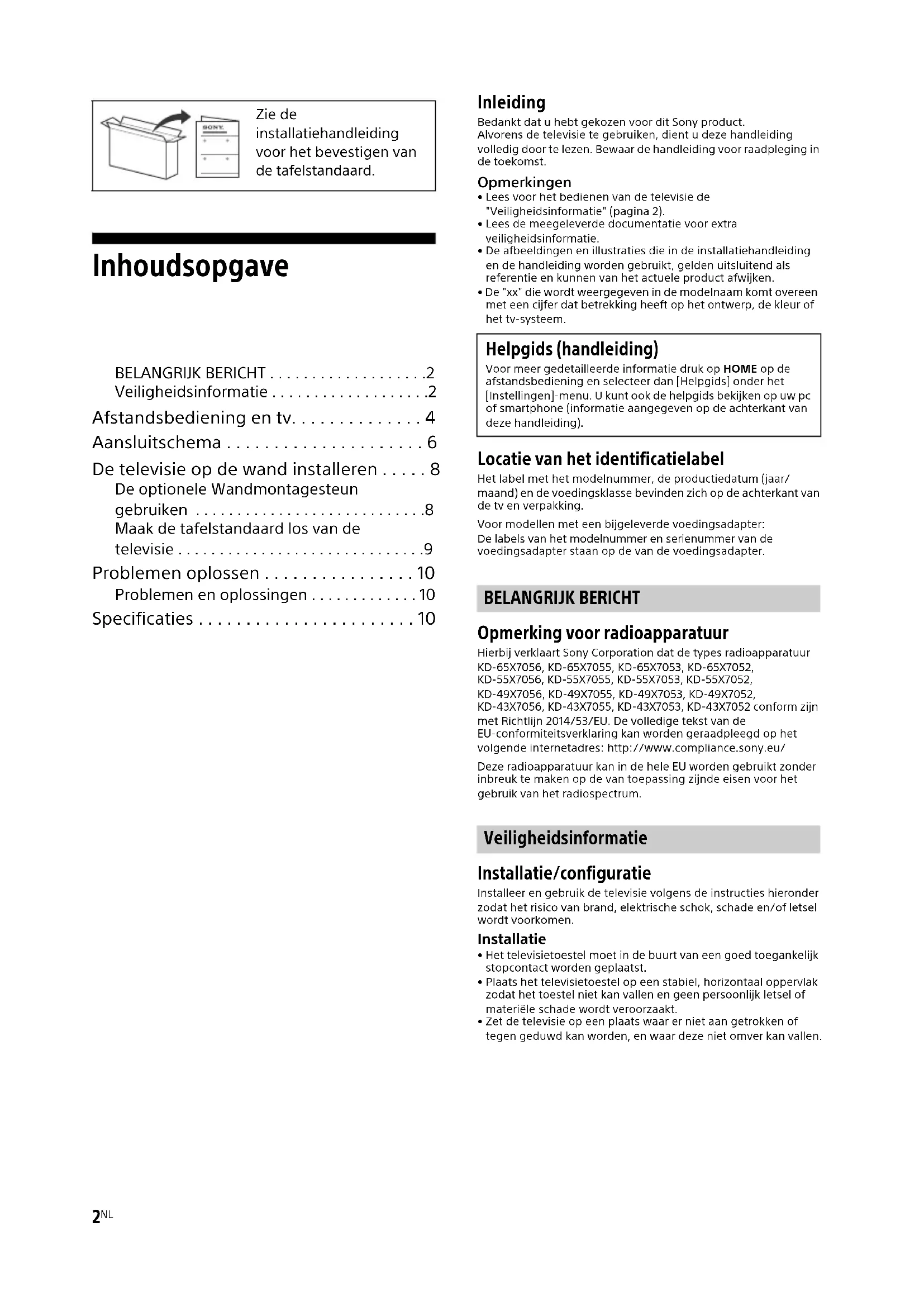 - Lees voor het bedienen van de televisie de "Veiligheidsinformatie" (pagina 2).• Lees de meegeleverde documentatie voor extra veiligheidsinformatie.• De afbeeldingen en illustraties die in de installatiehandleiding en de handleiding worden gebruikt, gelden uitsluitend als referentie en kunnen van het actuele product afwijken.• De "xx" die wordt weergegeven in de modelnaam komt overeen met een cijfer dat betrekking heeft op het ontwerp, de kleur of het tv-systeem. Locatie van het identificatielabel Het label met het modelnummer, de productiedatum (jaar/maand) en de voedingsklasse bevinden zich op de achterkant van de tv en verpakking.Voor modellen met een bijgeleverde voedingsadapter:De labels van het modelnummer en serienummer van de voedingsadapter staan op de van de voedingsadapter. BELANGRIJK BERICHT Opmerking voor radioapparatuur Hierbij verklaart Sony Corporation dat de types radioapparatuur KD-65X7056, KD-65X7055, KD-65X7053, KD-65X7052, KD-55X7056, KD-55X7055, KD-55X7053, KD-55X7052, KD-49X7056, KD-49X7055, KD-49X7053, KD-49X7052, KD-43X7056, KD-43X7055, KD-43X7053, KD-43X7052 conform zijn met Richtlijn 2014/53/EU. De volledige tekst van de EU-conformiteitsverklaring kan worden geraadpleegd op het volgende internetadres: http://www.compliance.sony.eu/Deze radioapparatuur kan in de hele EU worden gebruikt zonder inbreuk te maken op de van toepassing zijnde eisen voor het gebruik van het radiospectrum. Veiligheidsinformatie Installatie/configuratie Installeer en gebruik de televisie volgens de instructies hieronder zodat het risico van brand, elektrische schok, schade en/of letsel wordt voorkomen. Installatie