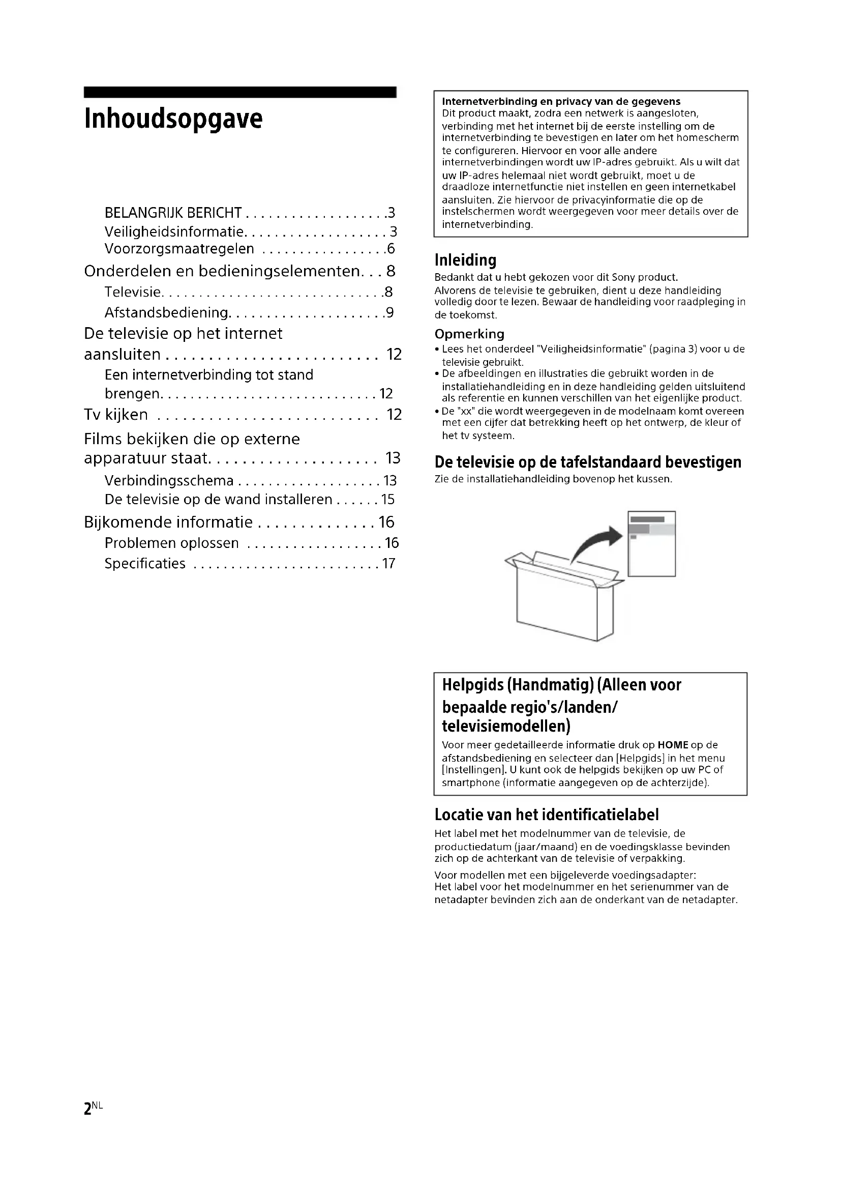 - Lees het onderdeel "Veiligheidsinformatie" (pagina 3) voor u de televisie gebruikt.• De afbeeldingen en illustraties die gebruikt worden in de installatiehandleiding en in deze handleiding gelden uitsluitend als referentie en kunnen verschillen van het eigenlijke product.• De "xx" die wordt weergegeven in de modelnaam komt overeen met een cijfer dat betrekking heeft op het ontwerp, de kleur of het tv systeem. De televisie op de tafelstandaard bevestigen Zie de installatiehandleiding bovenop het kussen. Locatie van het identificatielabel Het label met het modelnummer van de televisie, de productiedatum (jaar/maand) en de voedingsklasse bevinden zich op de achterkant van de televisie of verpakking. Voor modellen met een bijgeleverde voedingsadapter:Het label voor het modelnummer en het serienummer van de netadapter bevinden zich aan de onderkant van de netadapter.Internetverbinding en privacy van de gegevensDit product maakt, zodra een netwerk is aangesloten, verbinding met het internet bij de eerste instelling om de internetverbinding te bevestigen en later om het homescherm te configureren. Hiervoor en voor alle andere internetverbindingen wordt uw IP-adres gebruikt. Als u wilt dat uw IP-adres helemaal niet wordt gebruikt, moet u de draadloze internetfunctie niet instellen en geen internetkabel aansluiten. Zie hiervoor de privacyinformatie die op de instelschermen wordt weergegeven voor meer details over de internetverbinding. Helpgids (Handmatig) (Alleen voor bepaalde regio's/landen/ televisiemodellen) Voor meer gedetailleerde informatie druk op HOME op de afstandsbediening en selecteer dan [Helpgids] in het menu [Instellingen]. U kunt ook de helpgids bekijken op uw PC of smartphone (informatie aangegeven op de achterzijde).3
