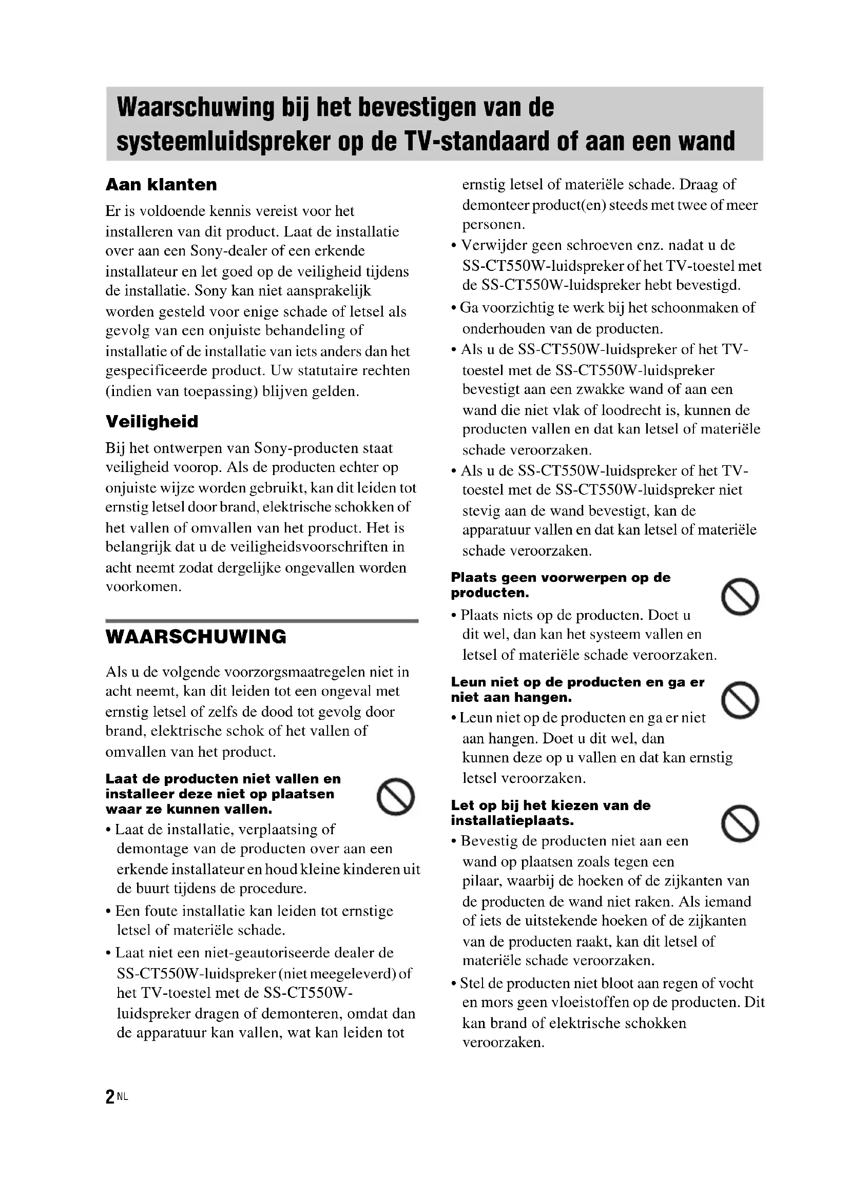 - Zet de SS-CT550W-luidspreker en het TV- toestel stevig vast wanneer u deze samen installeert. Zet vervolgens het TV-toestel met de SS-CT550W-luidspreker stevig vast aan de standaard of aan de wand. Als de SS-CT550W- luidspreker en het TV-toestel niet stevig zijn geïnstalleerd, kunnen zij vallen of omvallen en dat kan letsel veroorzaken. Zet geen gewicht op de producten en stel ze niet bloot aan schokken.