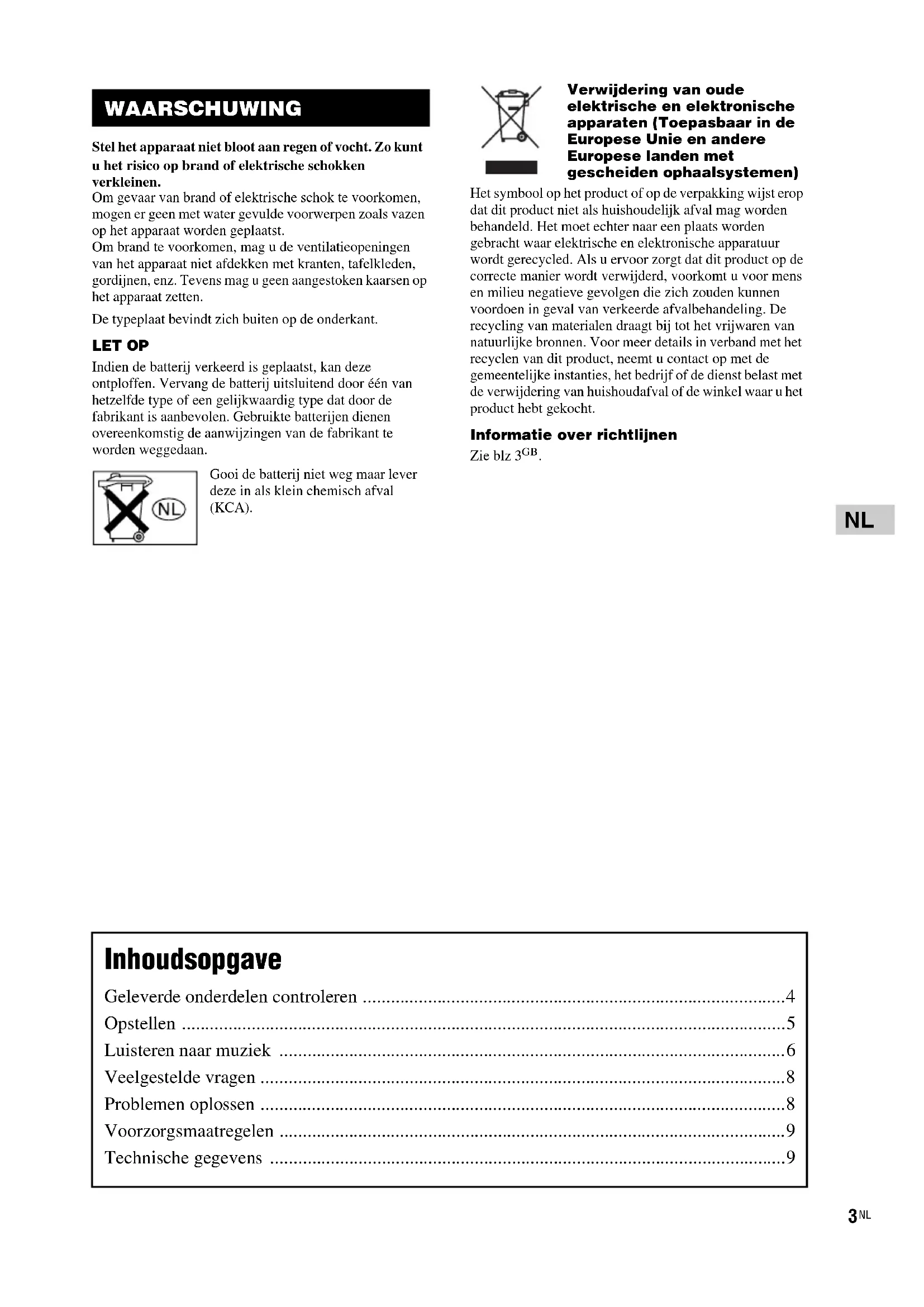 Stel het apparaat niet bloot aan regen of vocht. Zo kunt u het risico op brand of elektrische schokken verkleinen. Om gevaar van brand of elektrische schok te voorkomen, mogen er geen met water gevulde voorwerpen zoals vazen op het apparaat worden geplaatst. Om brand te voorkomen, mag u de ventilatieopeningen van het apparaat niet afdekken met kranten, tafelkleden, gordijnen, enz. Tevens mag u geen aangestoken kaarsen op het apparaat zetten. De typeplaat bevindt zich buiten op de onderkant. LET OP Indien de batterij verkeerd is geplaatst, kan deze ontploffen. Vervang de batterij uitsluitend door één van hetzelfde type of een gelijkwaardig type dat door de fabrikant is aanbevolen. Gebruikte batterijen dienen overeenkomstig de aanwijzingen van de fabrikant te worden weggedaan. Gooi de batterij niet weg maar lever deze in als klein chemisch afval (KCA). Verwijdering van oude elektrische en elektronische apparaten (Toepasbaar in de Europese Unie en andere Europese landen met gescheiden ophaalsystemen) Het symbool op het product of op de verpakking wijst erop dat dit product niet als huishoudelijk afval mag worden behandeld. Het moet echter naar een plaats worden gebracht waar elektrische en elektronische apparatuur wordt gerecycled. Als u ervoor zorgt dat dit product op de correcte manier wordt verwijderd, voorkomt u voor mens en milieu negatieve gevolgen die zich zouden kunnen voordoen in geval van verkeerde afvalbehandeling. De recycling van materialen draagt bij tot het vrijwaren van natuurlijke bronnen. Voor meer details in verband met het recyclen van dit product, neemt u contact op met de gemeentelijke instanties, het bedrijf of de dienst belast met de verwijdering van huishoudafval of de winkel waar u het product hebt gekocht. Informatie over richtlijnen Zie blz 3