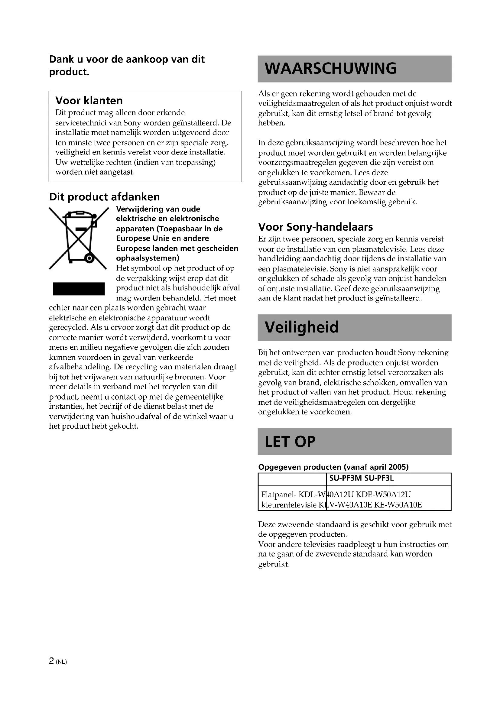 Maueranker (nicht mitgeliefert) Starke Kette oder starkes Kabel (nicht mitgeliefert) Sicherheitsmaßnahmen, um ein Kippen des Geräts zu verhindern ACHTUNG Ergreifen Sie unbedingt geeignete Maßnahmen, um ein Umkippen des Ständers zu verhindern. Andernfalls kann das Fernsehgerät umkippen und Verletzungen verursachen. Verankern Sie das Fernsehgerät an einer Wand oder einem Pfeiler usw., damit es nicht umkippen kann. Halten Sie eine starke handelsübliche Sicherungskette oder ein starkes handelsübliches Sicherungskabel sowie einen Maueranker bereit. 1 Bringen Sie den Maueranker an einer soliden Wand oder einem Pfeiler an. 2 Ziehen Sie die Sicherungskette oder das Sicherungskabel durch die beiden Ösen der Verankerungsbolzen und befestigen Sie dann das andere Ende der Kette oder des Kabels am Maueranker. LAUTSPRECHER Lautsprechereinheit 10 cm (2) Impedanz 4 Ω Max. Leistung 50 W Änderungen, die dem technischen Fortschritt dienen, bleiben vorbehalten. Tragfähigkeit25 kg2 (NL) Dank u voor de aankoop van dit product. Voor klanten Dit product mag alleen door erkende servicetechnici van Sony worden geïnstalleerd. De installatie moet namelijk worden uitgevoerd door ten minste twee personen en er zijn speciale zorg, veiligheid en kennis vereist voor deze installatie. Uw wettelijke rechten (indien van toepassing) worden niet aangetast. Dit product afdanken Verwijdering van oude elektrische en elektronische apparaten (Toepasbaar in de Europese Unie en andere Europese landen met gescheiden ophaalsystemen) Het symbool op het product of op de verpakking wijst erop dat dit product niet als huishoudelijk afval mag worden behandeld. Het moet echter naar een plaats worden gebracht waar elektrische en elektronische apparatuur wordt gerecycled. Als u ervoor zorgt dat dit product op de correcte manier wordt verwijderd, voorkomt u voor mens en milieu negatieve gevolgen die zich zouden kunnen voordoen in geval van verkeerde afvalbehandeling. De recycling van materialen draagt bij tot het vrijwaren van natuurlijke bronnen. Voor meer details in verband met het recyclen van dit product, neemt u contact op met de gemeentelijke instanties, het bedrijf of de dienst belast met de verwijdering van huishoudafval of de winkel waar u het product hebt gekocht. WAARSCHUWING Als er geen rekening wordt gehouden met de veiligheidsmaatregelen of als het product onjuist wordt gebruikt, kan dit ernstig letsel of brand tot gevolg hebben. In deze gebruiksaanwijzing wordt beschreven hoe het product moet worden gebruikt en worden belangrijke voorzorgsmaatregelen gegeven die zijn vereist om ongelukken te voorkomen. Lees deze gebruiksaanwijzing aandachtig door en gebruik het product op de juiste manier. Bewaar de gebruiksaanwijzing voor toekomstig gebruik. Voor Sony-handelaars Er zijn twee personen, speciale zorg en kennis vereist voor de installatie van een plasmatelevisie. Lees deze handleiding aandachtig door tijdens de installatie van een plasmatelevisie. Sony is niet aansprakelijk voor ongelukken of schade als gevolg van onjuist handelen of onjuiste installatie. Geef deze gebruiksaanwijzing aan de klant nadat het product is geïnstalleerd. Veiligheid Bij het ontwerpen van producten houdt Sony rekening met de veiligheid. Als de producten onjuist worden gebruikt, kan dit echter ernstig letsel veroorzaken als gevolg van brand, elektrische schokken, omvallen van het product of vallen van het product. Houd rekening met de veiligheidsmaatregelen om dergelijke ongelukken te voorkomen. LET OP Opgegeven producten (vanaf april 2005) SU-PF3M SU-PF3L Flatpanel- KDL-W40A12U KDE-W50A12U kleurentelevisie KLV-W40A10E KE-W50A10E Deze zwevende standaard is geschikt voor gebruik met de opgegeven producten. Voor andere televisies raadpleegt u hun instructies om na te gaan of de zwevende standaard kan worden gebruikt.3 (NL) WAARSCHUWING Als er geen rekening wordt gehouden met devolgende voorzorgsmaatregelen, kan dit leidentot ernstig letsel of de dood als gevolg vanbrand, elektrische schokken, omvallen van hetproduct of vallen van het product. Dit product moet alleen worden geïnstalleerd door erkende servicetechnici van Sony. Als andere, niet-bevoegde personen de installatieuitvoeren, kan dit ernstig letsel veroorzaken omdat detelevisie en de standaard erg zwaar zijn. Leun niet op en hang niet aan de standaard. De standaard kan omvallen enletsel veroorzaken. Neem voldoende maatregelen om te voorkomen dat de standaard omvalt. Als u dit niet doet, kan de televisie omvallen en letselveroorzaken. Veranker de televisie aan een muur,pilaar of iets dergelijks om te voorkomen dat dezeomvalt. Installeer de standaard op een stevige, vlakke ondergrond. Installeer de zwevende standaard niet zodat dezeoverhelt naar een kant. Als u dit wel doet, kan dezwevende standaard omvallen of kan de televisievallen. Dit kan letsel tot gevolg hebben.Als u de standaard op een zachte ondergrond, zoalseen mat of een kleed, plaatst, legt u eerst een plank opde gewenste plaats. Gebruik geen gebarsten standaard. Gebruik de zwevendestandaard niet als er barsten inde standaard verschijnen.Het glas kan breken en detelevisie kan vallen of destandaard kan omvallen. Ditkan letsel tot gevolg hebben. Leun niet op en hang niet aan de televisie als de televisie op de zwevende standaard is bevestigd. De zwevende standaard kanomvallen of de televisie kanvallen. Dit kan ernstig letsel ofde dood tot gevolg hebben. Dek de ventilatieopeningen van de televisie niet af. Als u de ventilatieopeningenafdekt (bijvoorbeeld met eendoek), kan de televisieoververhit raken. Dit kan brandtot gevolg hebben. Zorg ervoor dat het netsnoer en de verbindingskabel niet beklemd raken.