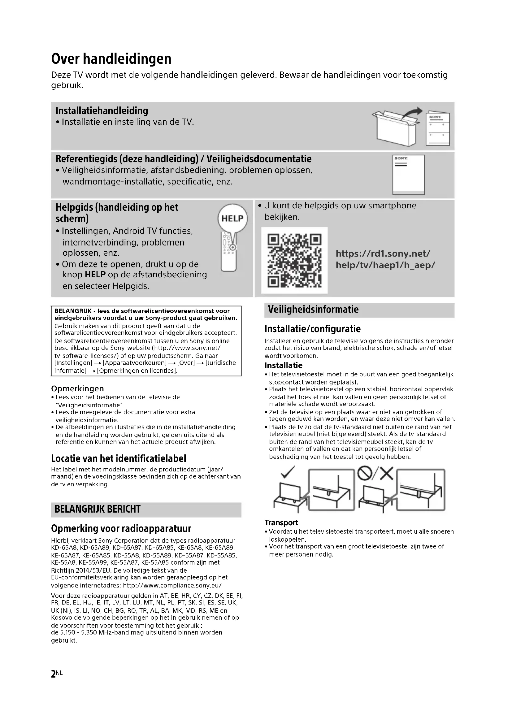 - Lees voor het bedienen van de televisie de "Veiligheidsinformatie".• Lees de meegeleverde documentatie voor extra veiligheidsinformatie.• De afbeeldingen en illustraties die in de installatiehandleiding en de handleiding worden gebruikt, gelden uitsluitend als referentie en kunnen van het actuele product afwijken. Locatie van het identificatielabel Het label met het modelnummer, de productiedatum (jaar/maand) en de voedingsklasse bevinden zich op de achterkant van de tv en verpakking. BELANGRIJK BERICHT Opmerking voor radioapparatuur Hierbij verklaart Sony Corporation dat de types radioapparatuur KD-65A8, KD-65A89, KD-65A87, KD-65A85, KE-65A8, KE-65A89, KE-65A87, KE-65A85, KD-55A8, KD-55A89, KD-55A87, KD-55A85, KE-55A8, KE-55A89, KE-55A87, KE-55A85 conform zijn met Richtlijn 2014/53/EU. De volledige tekst van de EU-conformiteitsverklaring kan worden geraadpleegd op het volgende internetadres: http://www.compliance.sony.eu/Voor deze radioapparatuur gelden in AT, BE, HR, CY, CZ, DK, EE, FI, FR, DE, EL, HU, IE, IT, LV, LT, LU, MT, NL, PL, PT, SK, SI, ES, SE, UK, UK (NI), IS, LI, NO, CH, BG, RO, TR, AL, BA, MK, MD, RS, ME en Kosovo de volgende beperkingen op het in gebruik nemen of op de voorschriften voor toestemming tot het gebruik :de 5.150 - 5.350 MHz-band mag uitsluitend binnen worden gebruikt. Veiligheidsinformatie Installatie/configuratie Installeer en gebruik de televisie volgens de instructies hieronder zodat het risico van brand, elektrische schok, schade en/of letsel wordt voorkomen. Installatie