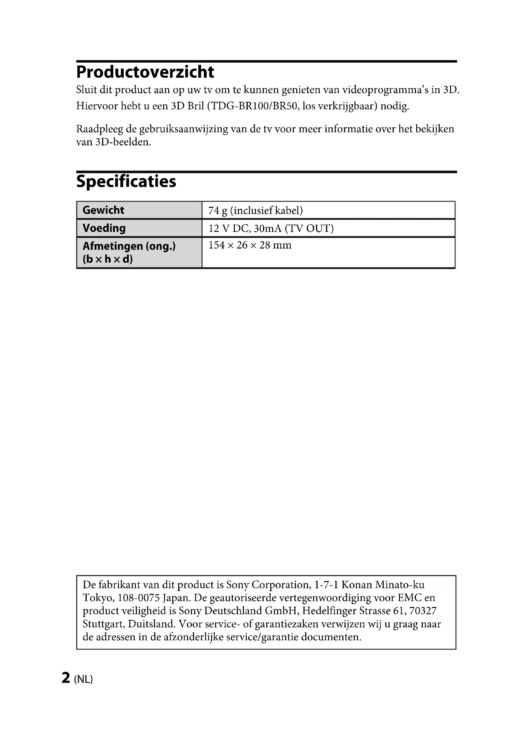 (Wordt vervolgd)TMR-BR100 4-180-471-26(1) 6 (NL) TMR-BR100 4-180-471-26(1) 120˚ Wanneer de tv op een kast of tafel is geplaatst: Plaats de 3D Sync Zender in het midden van de tv langs de voorste rand van de tafelstandaard of de tv-standaard. 120˚ Als de tv aan een muur is bevestigd, bevestigt u de 3D Sync Zender aan de tv (bovenaan midden of onderaan rechts van het midden) met dubbelzijdige kleefband. Regel de hoek van de 3D Sync Zender afhankelijk van de montageplaats. +10˚ –10˚ 120˚ 120˚ 120˚TMR-BR100 4-180-471-26(1) TMR-BR100 4-180-471-26(1) 7 (NL) Communicatiebereik van 3D Sync Zender en 3D Bril Bevestig de 3D Sync Zender voor de tv en zorg ervoor dat er zich geen obstakels bevinden tussen de 3D Sync Zender en de 3D Bril. 120˚ 1 m ~ 6 m gemiddeld 1 m ~ 6 m gemiddeld 120˚ Bovenaanzicht Zijaanzicht Aansluitingen Schakel de tv uit en sluit de 3D Sync Zender aan op de 3D SYNC-aansluiting van de tv. Schakel de tv in en ga na of het 3D-menu wordt weergegeven in de menulijst OPTIONS. U dient de tv eenmaal uit te schakelen zodat de tv de 3D Sync Zender herkent. Raadpleeg de gebruiksaanwijzing van de tv voor meer informatie over het bekijken van 3D-beelden. Problemen oplossen Raadpleeg bij problemen de gebruiksaanwijzing van de tv.TMR-BR100 4-180-471-26(1) 2 (IT) TMR-BR100 4-180-471-26(1) Panoramica del prodotto Collegare questo prodotto al televisore per ottenere la visione di programmi video in 3D. È richiesto l’uso di Occhiali 3D (TDG-BR100/BR50, in vendita separatamente). Per dettagli sulle modalità di visione 3D o per definire le impostazioni, consultare il manuale di istruzioni del televisore. Caratteristiche tecniche Peso 74 g (cavo incluso) Alimentazione 12 V CC, 30mA (TV OUT) Dimensioni approssimative (l × a × p): 154 × 26 × 28 mm Il fabbricante di questo prodotto è Sony Corporation, 1-7-1 Konan Minato- ku Tokyo, 108-0075, Giappone. Il rappresentante autorizzato ai fini della Compatibilità Elettromagnetica e della sicurezza del prodotto è Sony Deutschland GmbH, Hedelfinger Strasse 61, 70327, Stoccarda Germania. Per qualsiasi problema relativo all’assistenza o alla garanzia, si prega di fare riferimento agli indirizzi indicati nei documenti di assistenza e garanzia forniti con il prodotto.TMR-BR100 4-180-471-26(1) TMR-BR100 4-180-471-26(1) 3 (IT)